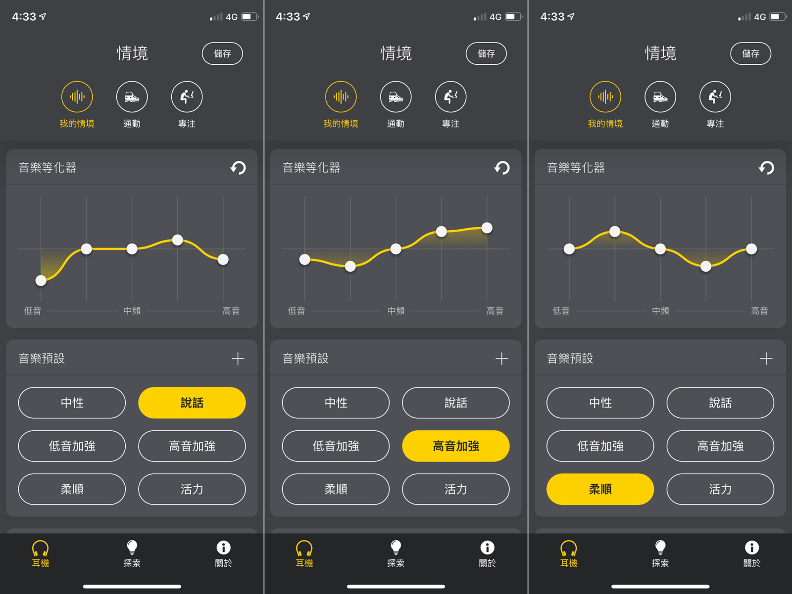 Sound+ App 情境可選擇「我的情境」「通勤」「專注」,調整出自己喜歡的設定並儲存。