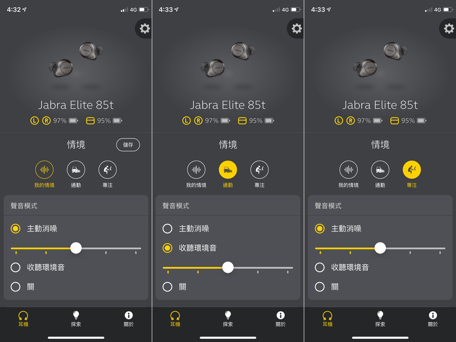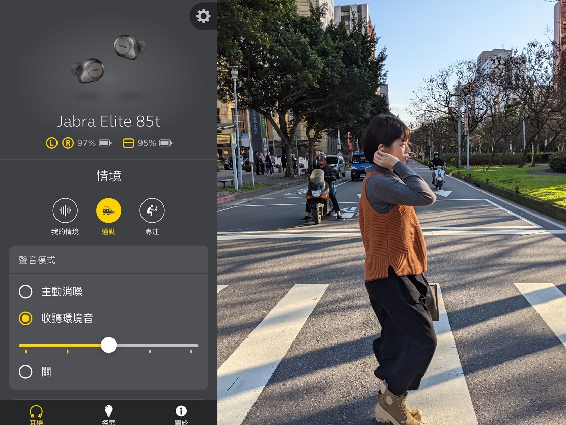 Jabra Elite 系列好評的通透模式(HearThrough),也沿用到最新的 Elite 85t 啦,這次還能調節開啟程度!