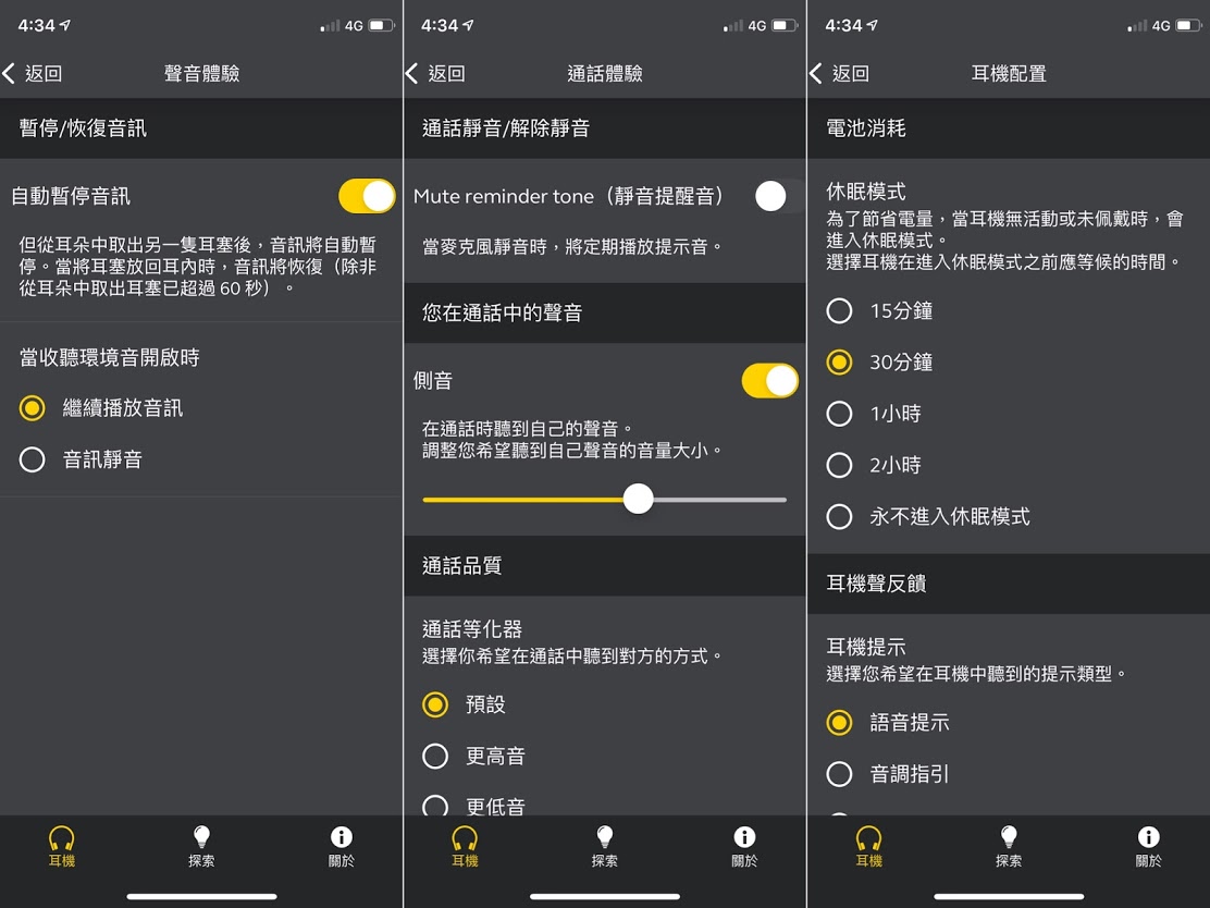 P編喜歡的貼心小功能,還包含「暫停/恢復音訊」取下耳機自動暫停音樂 / 戴上耳機自動恢復音樂播放,通話時可開啟。「通話體驗」在通話中可開啟側音聽到自己聲音,以及「休眠模式」在未配戴時自動休眠節省電力。