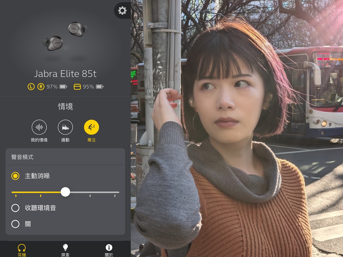 搭乘大眾交通工具的通勤時段,肯定是最多人戴耳機的場景之一。無論是搭捷運的軌道摩擦聲,或是公車的引擎聲響,將 Jabra Elite 85t 開啟 ANC 主動降噪後,都能獲得相當程度的抑制。(但要小心沒聽到下車提示音坐過站了)