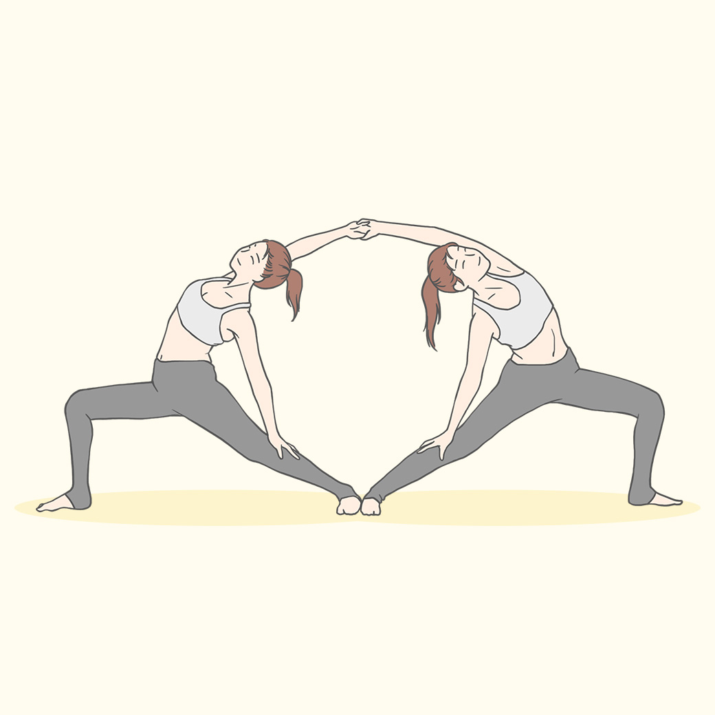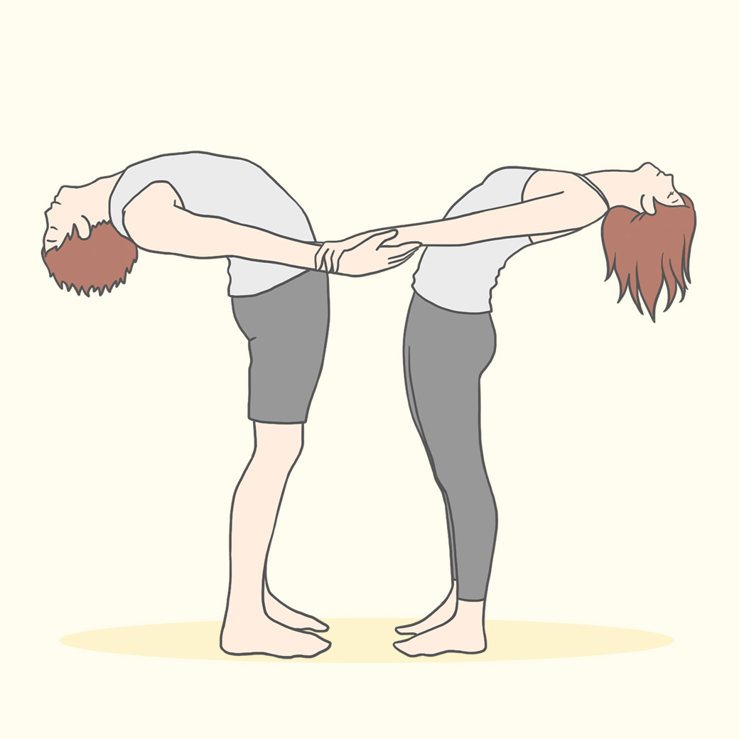 1. 首先面對面握住彼此的手腕,接著慢慢仰頭向後彎腰,感受到脊椎伸展開來。