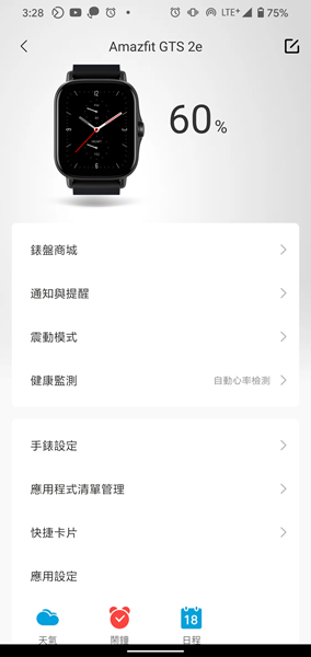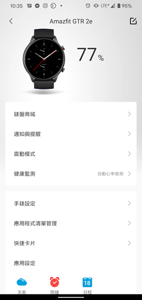 裝置綁定後,可觀看手錶電量,進行手錶設定、通知與提醒、震動模式、健康監測,以及在錶盤商城更換不同錶盤。
