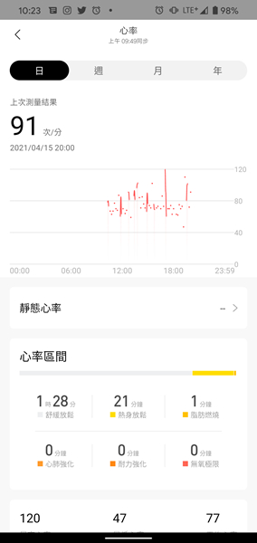 Zepp App 可查詢心率紀錄,包含靜態心率、心率區間、最高及最低心率。心率區間會統計舒緩輕鬆、熱身放鬆、脂肪燃燒、心肺強化和耐力強化的時間。