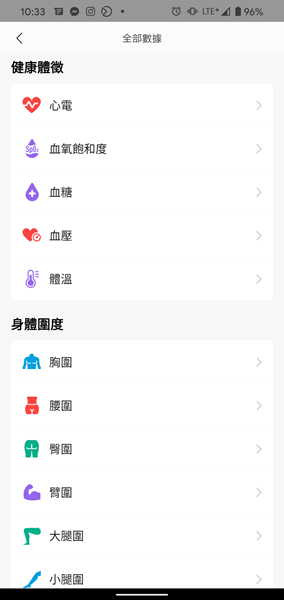 在全部數據選項,可看到活動數據、狀態數據、健康體徵數據,並可在身體維度中手動加入資訊,做身體的長期紀錄。