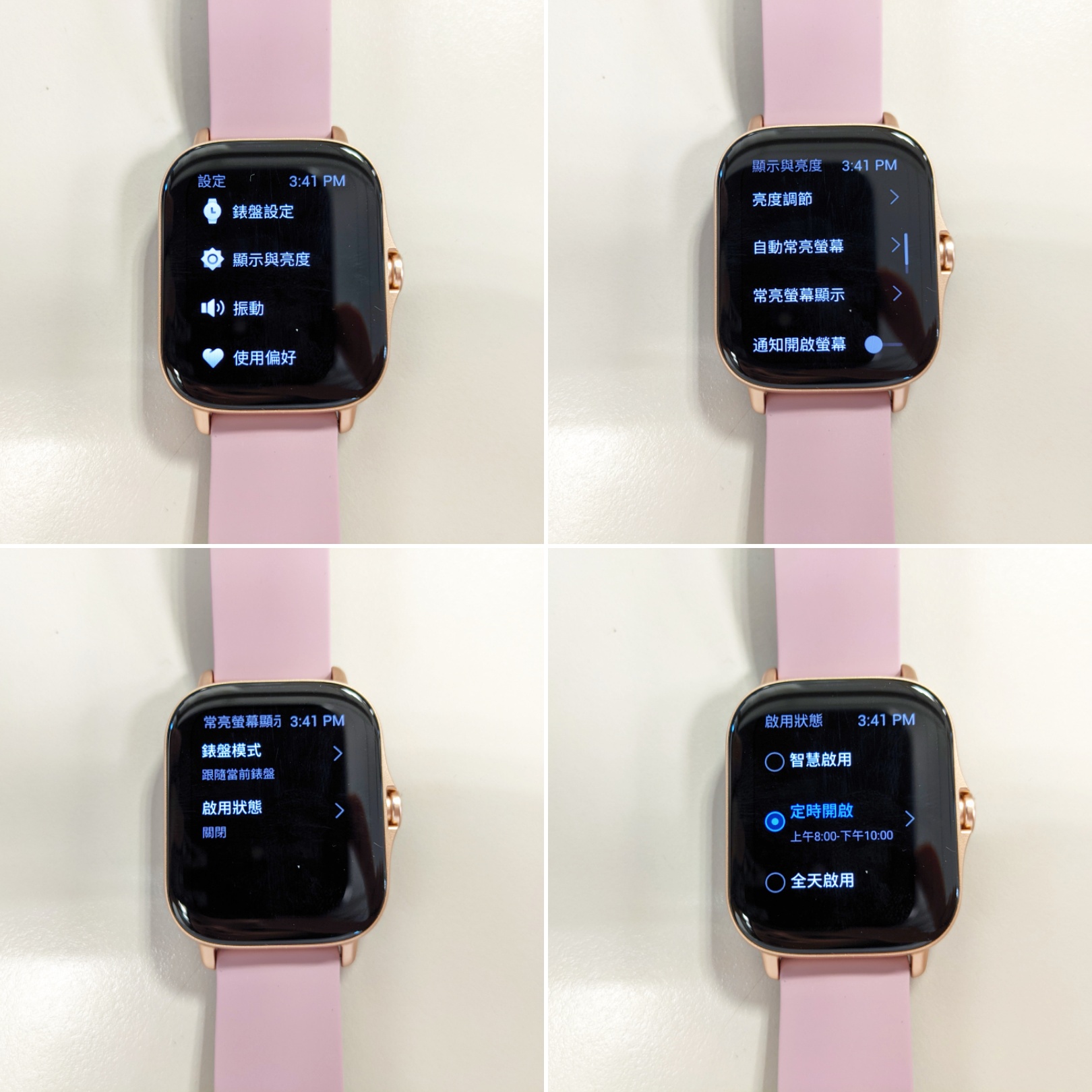 常亮螢幕可設定智慧啟用、定時開啟、或全天啟用,但也會略為影響手錶待機時間。