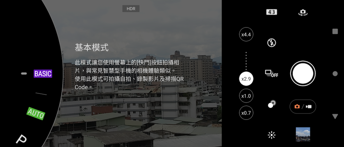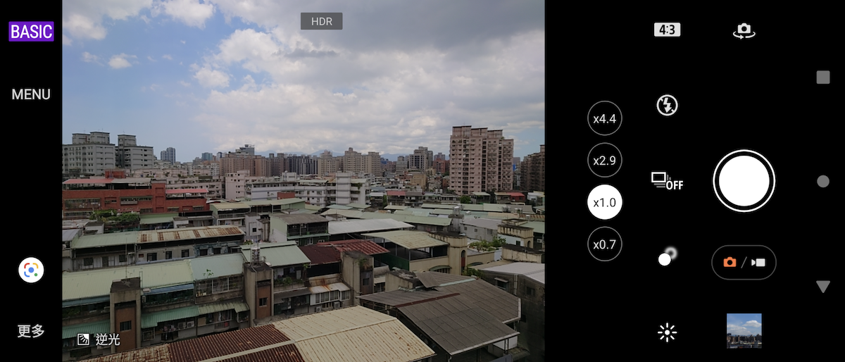 進入相機 App,BASIC 基本模式會以 x0.7 / x1.0 / x2.9 / x4.4 顯示不同相機焦段。