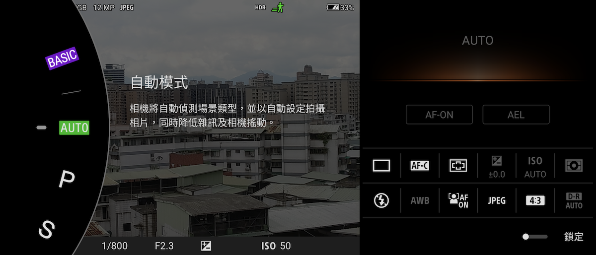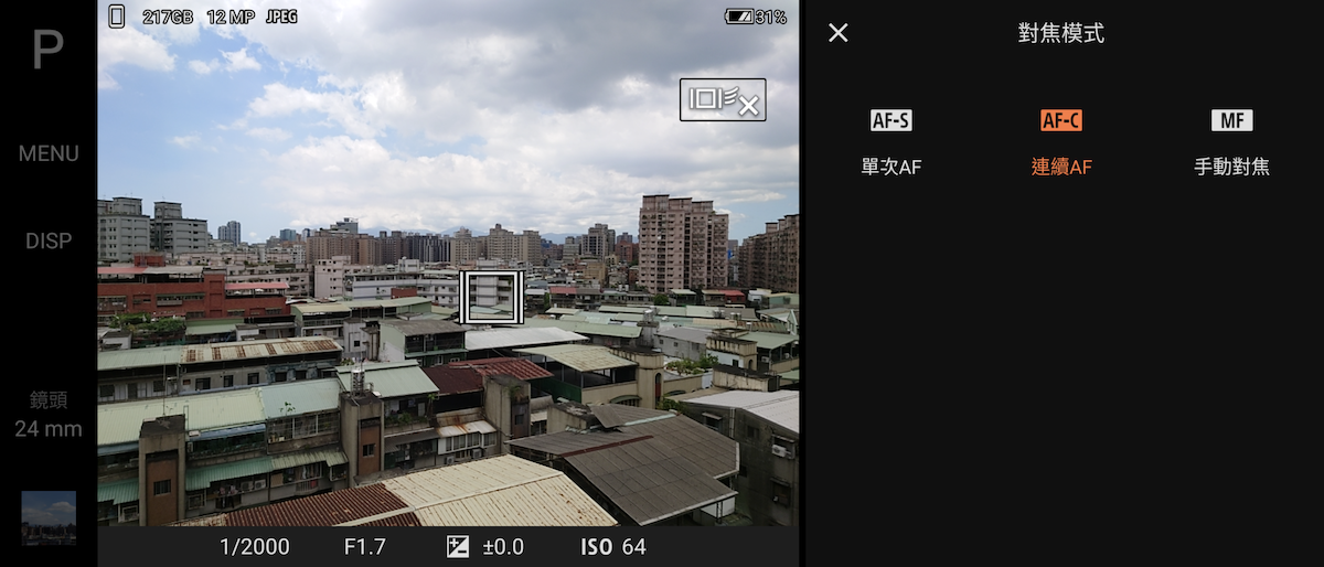 開啟 AUTO 和 P / S / M 手動模式,會在左側以16mm / 24mm / 70mm / 105mm 顯示焦段。