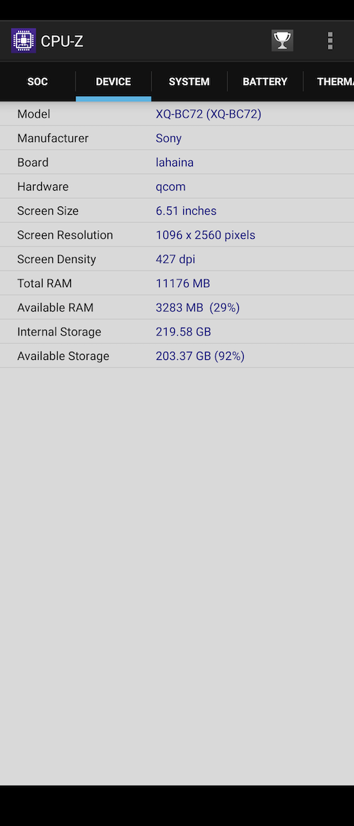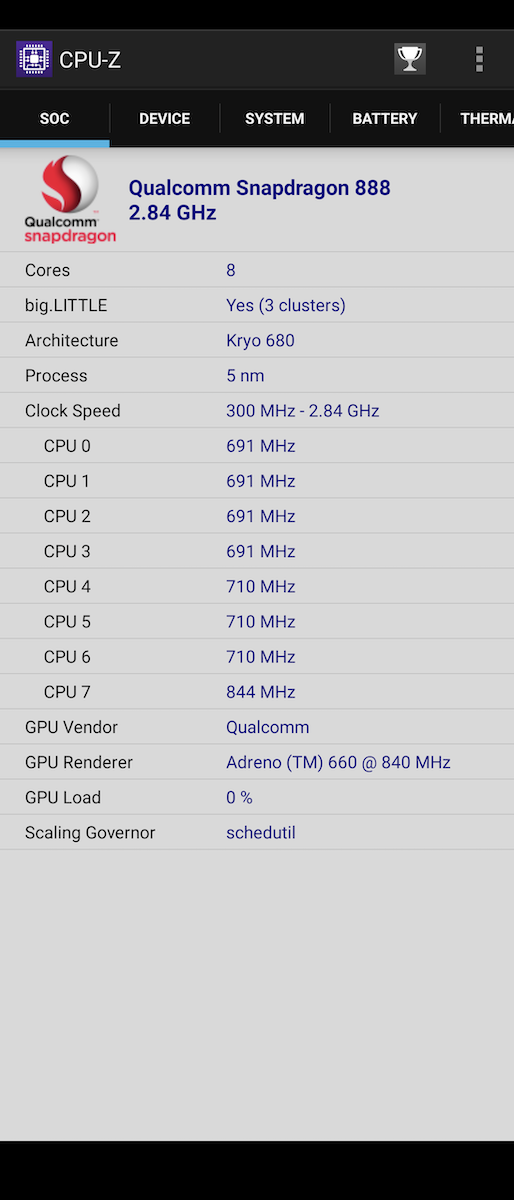 CPU-Z 顯示 Xperia 1 III 硬體規格,高通 Snapdragon 888 八核心尺里契為Kryo 680 架構,最高能支援高達 2.84GHz 的頻率。高通 Adreno 660 GPU ,根據高通表示圖像渲染速度比上一代產品快上 35%。