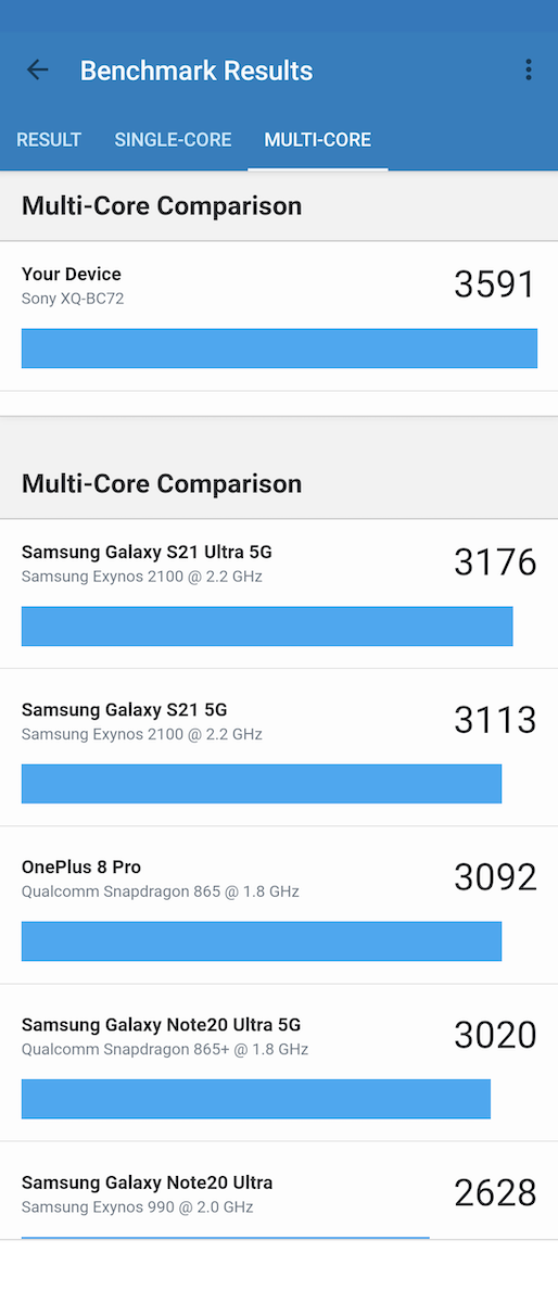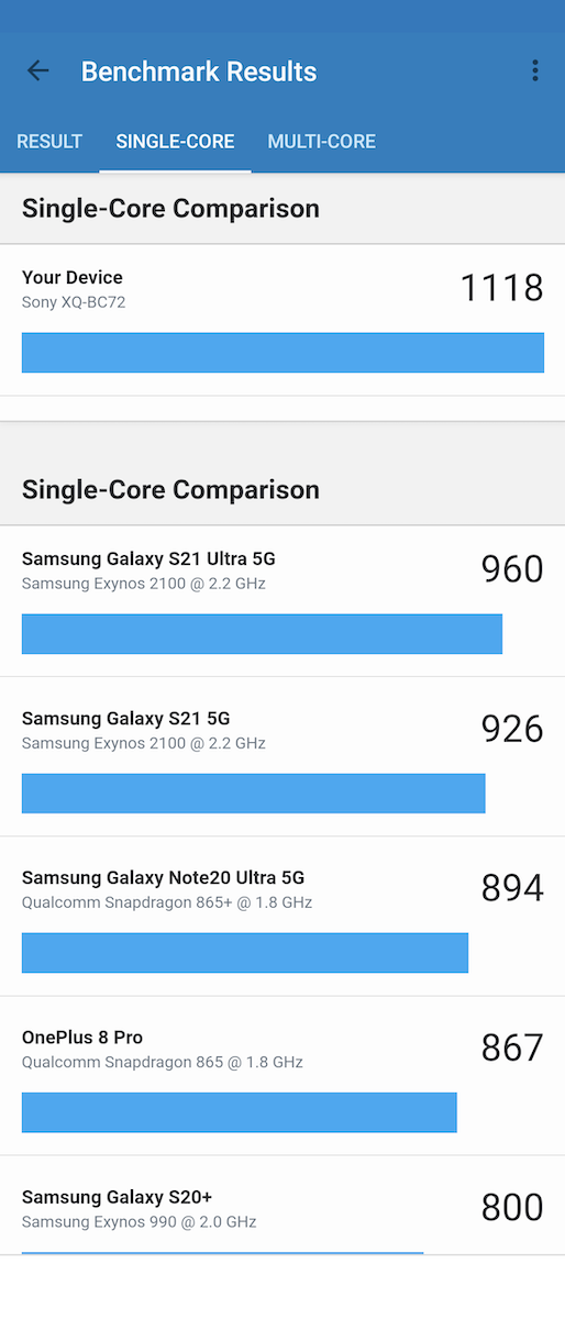 Geekbench 5.4.1 測試,Xperia 1 III 在單核及多核心分數皆高於主要競爭對手。