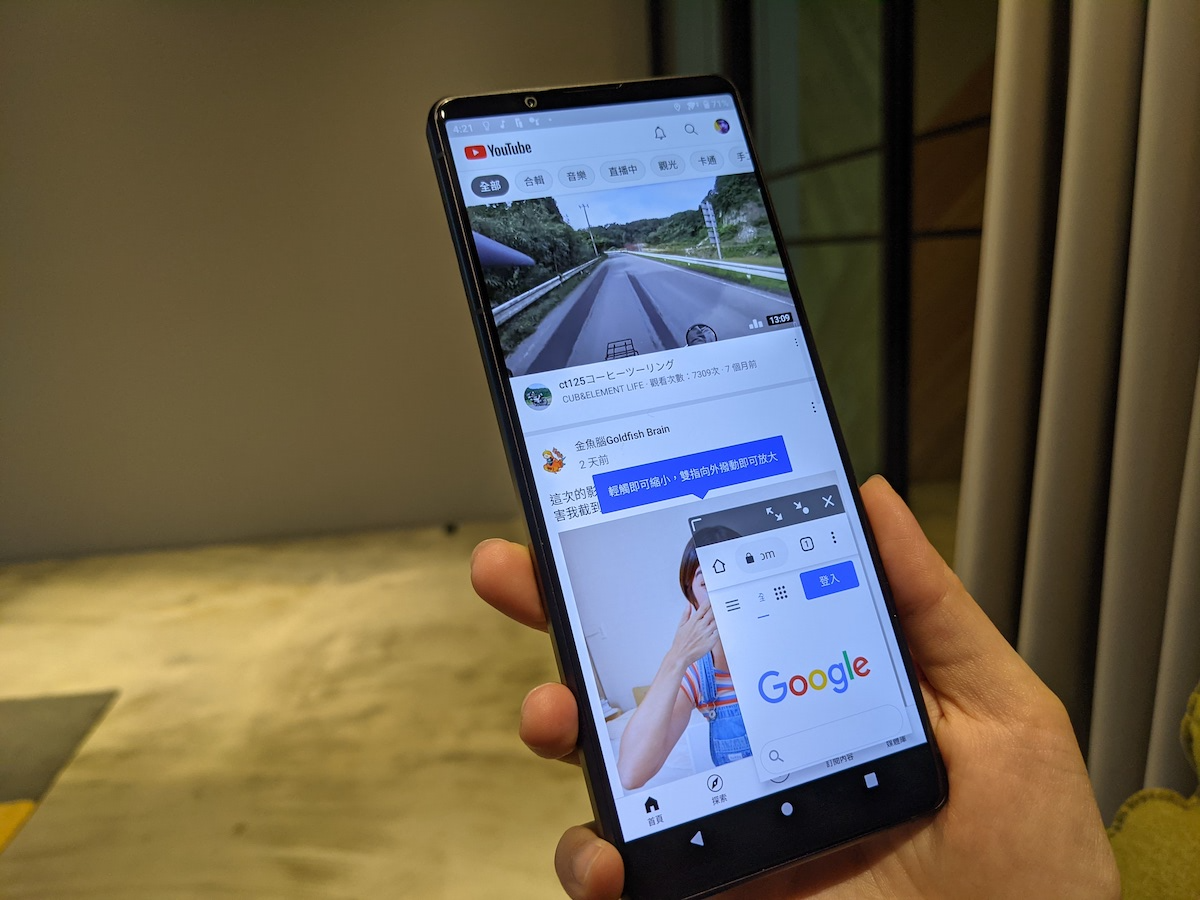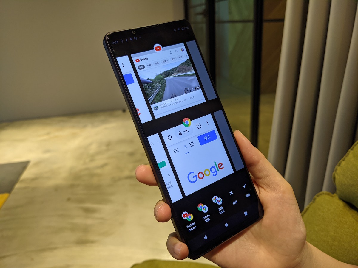因應 21:9 比例螢幕的特性,Sony 一直都有提供多視窗模式,將畫面一分為二讓你一心二用,同時瀏覽網頁和觀看影片,多視窗模式切換鍵還會提供上次使用以及推薦的 App 組合。