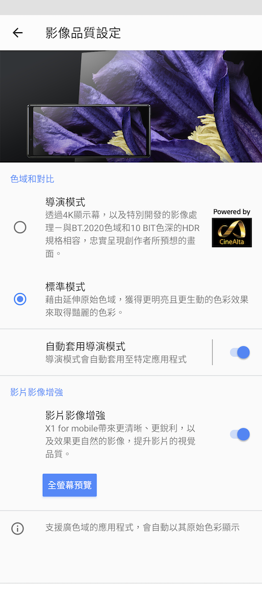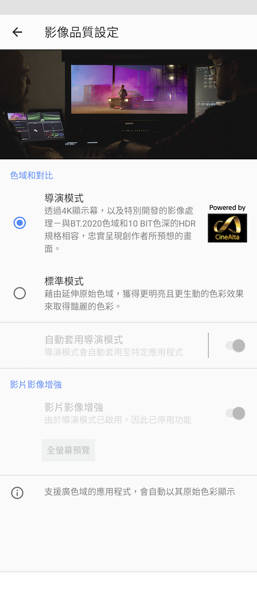Sony 提供了「標準模式」和「導演模式」供自動或手動選擇。「標準模式」可透過 X1 手機影像處理引擎帶來影片影像增強功能,「導演模式」則是源自好萊塢指標片廠所採用 Sony 專業 Master Monitor 的色彩重現專業技術,可忠實呈現 BT.2020 色域和 10 Bit HDR 規格。