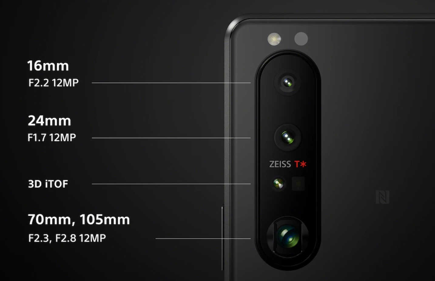 Xperia 1 III 鏡頭皆為1,200萬畫素,再加上3D iToF測距感測器可立即計算相機與主體之間的距離,即時自動追蹤準確偵測並對焦主體。