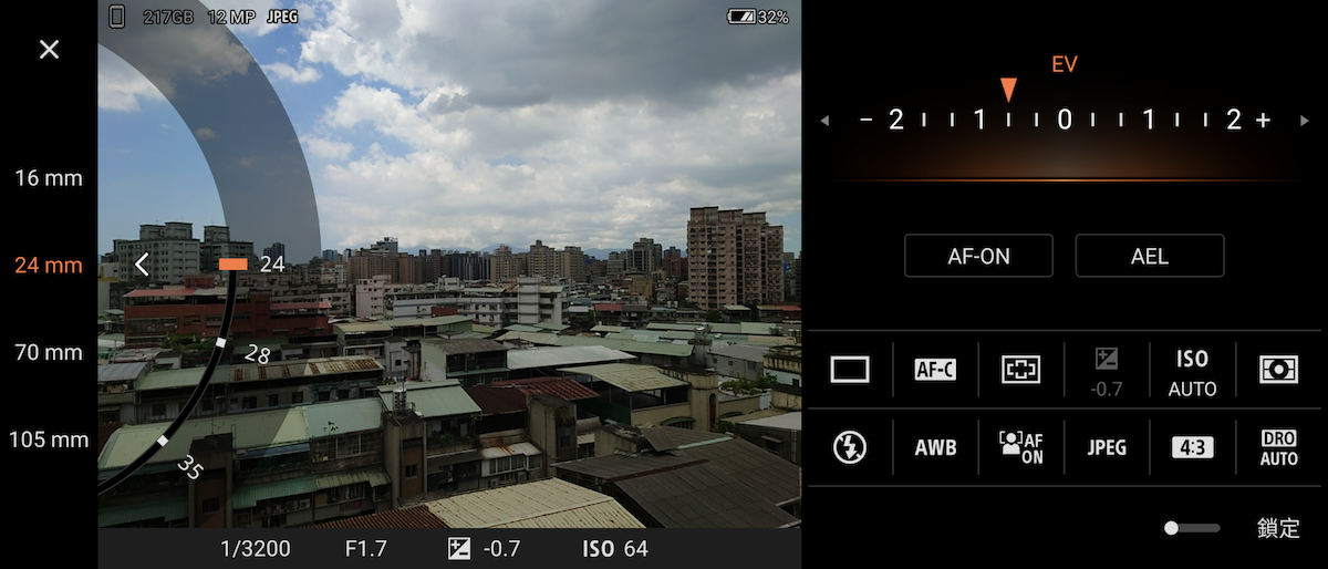 開啟自動和手動模式,則會以16mm / 24mm / 70mm / 105mm 顯示焦段切換。