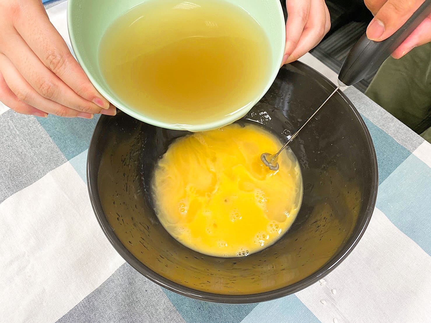 將300ml高湯與少許醬油,混合至蛋液中。