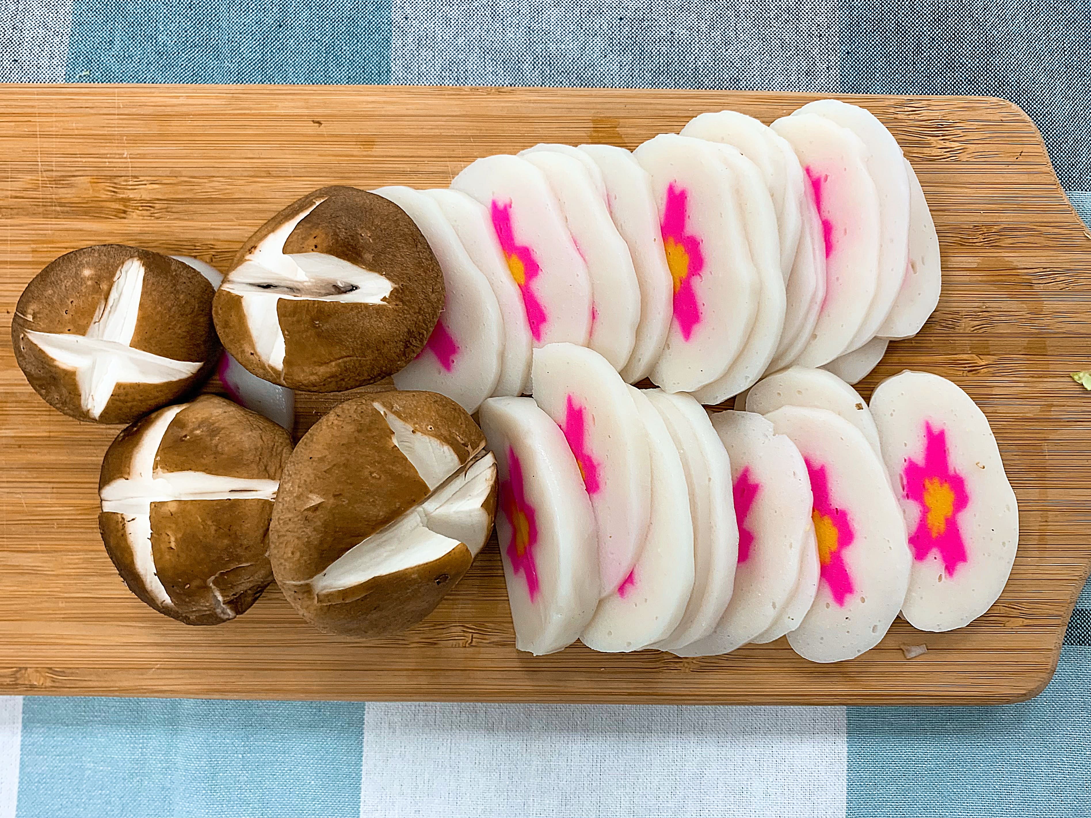 將香菇、魚板切片。