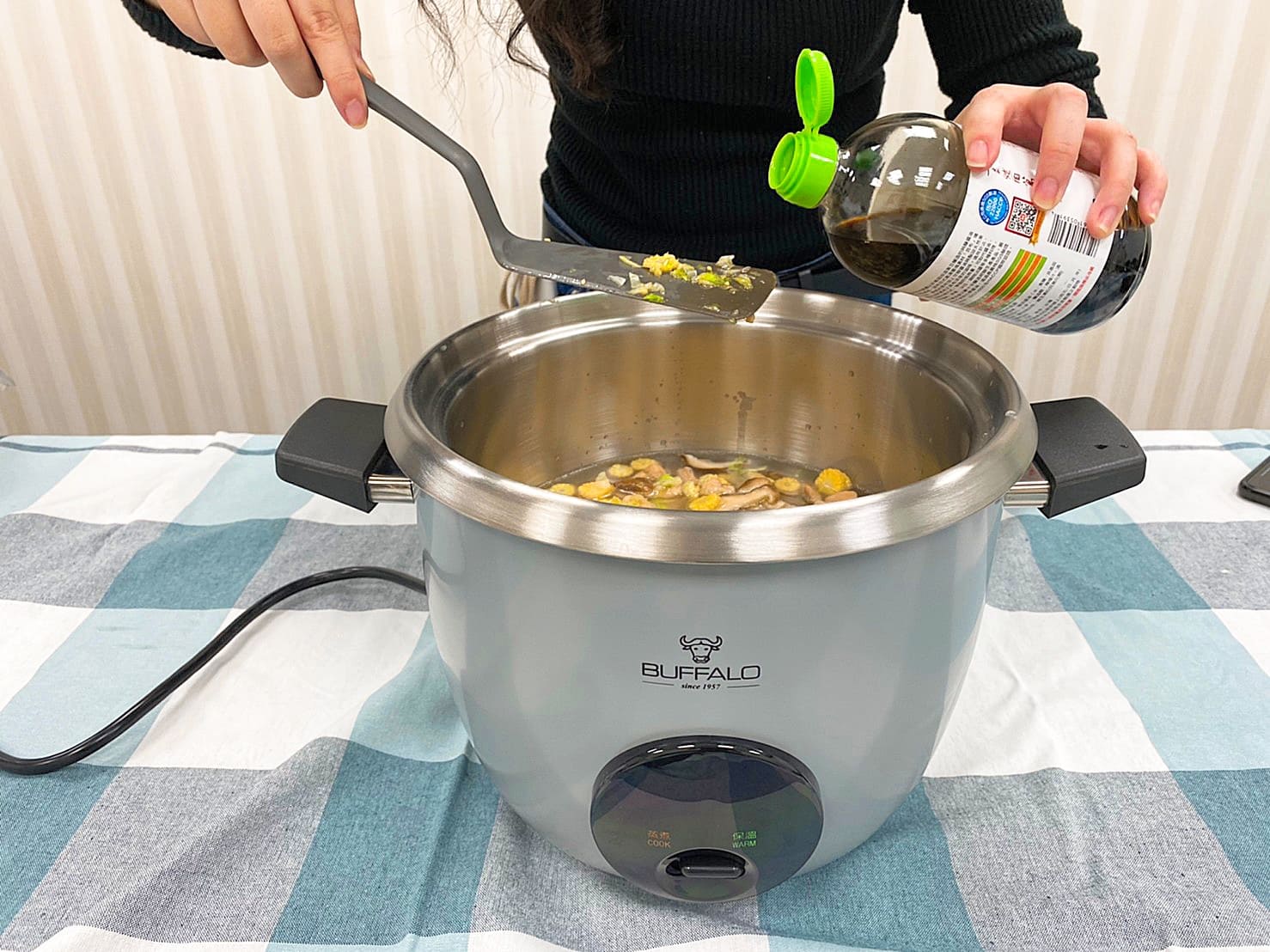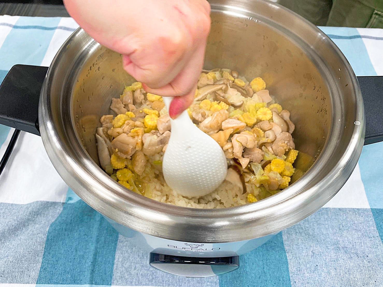 在米飯上均勻鋪上炒後的配料。也可依個人喜好,在鍋中滴入一些醬油調味後按下開關,開始煮飯