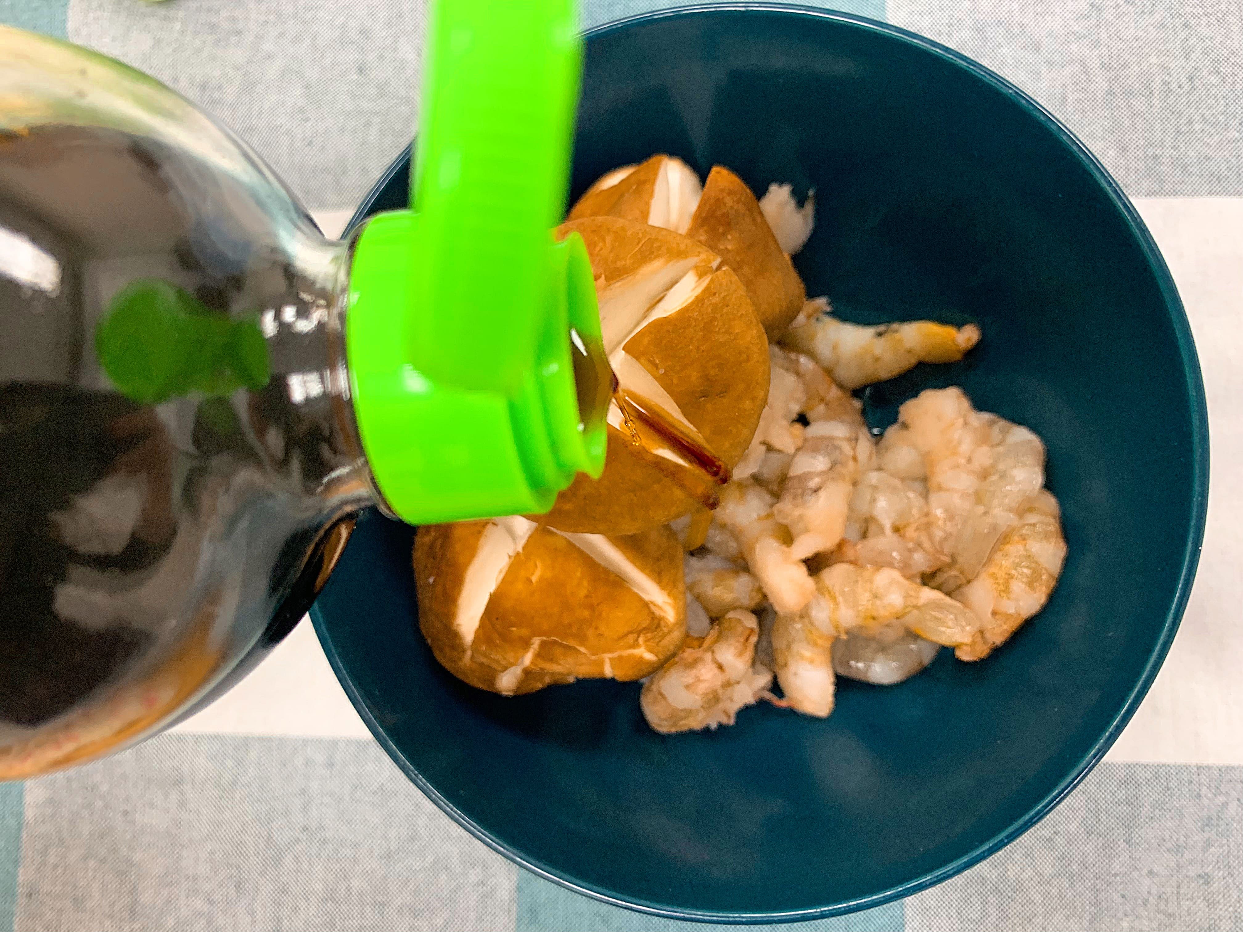 將菇類與蝦仁加一點醬油醃一下。