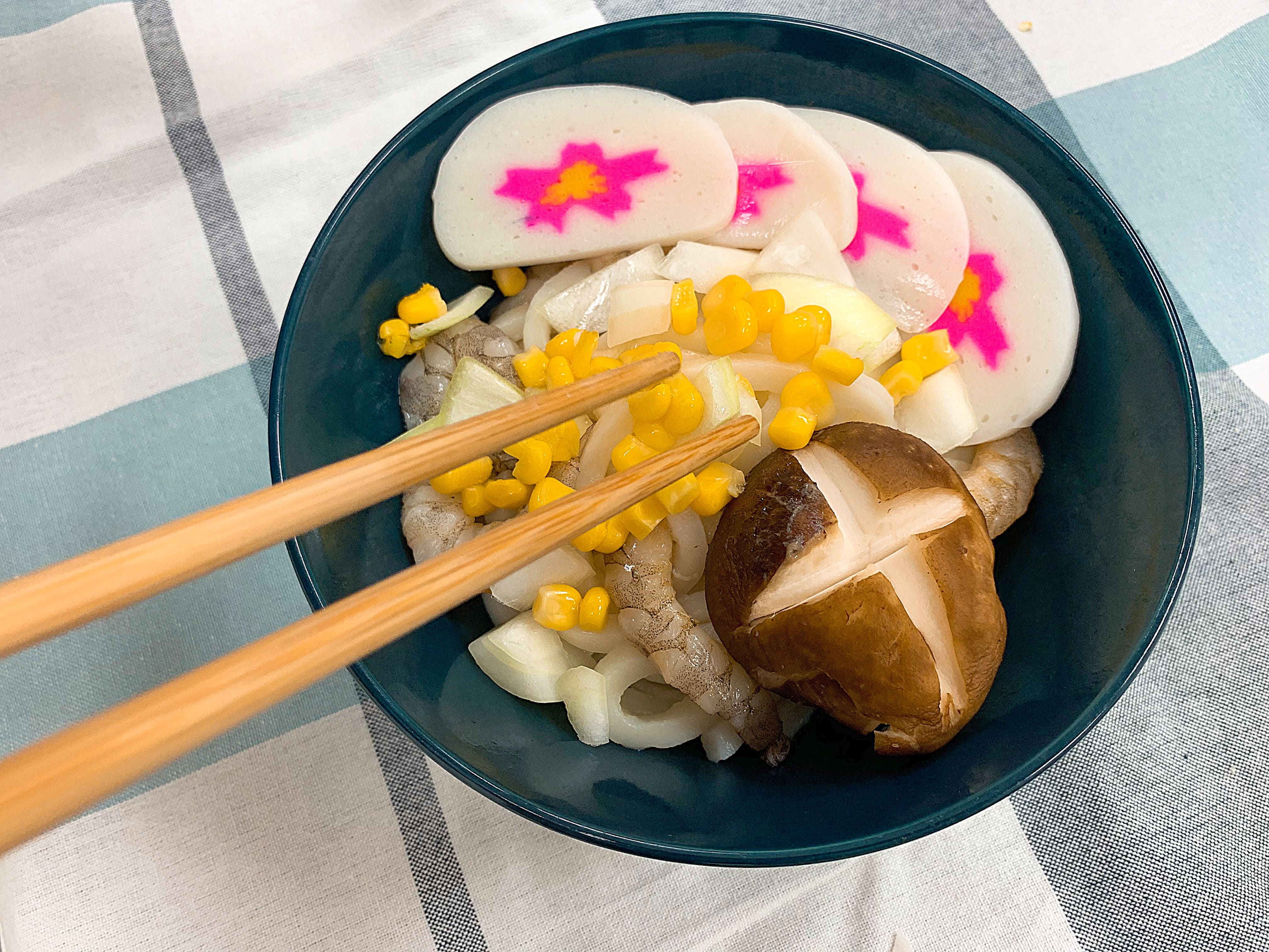 將烏龍麵鋪至碗底、備料鋪平。