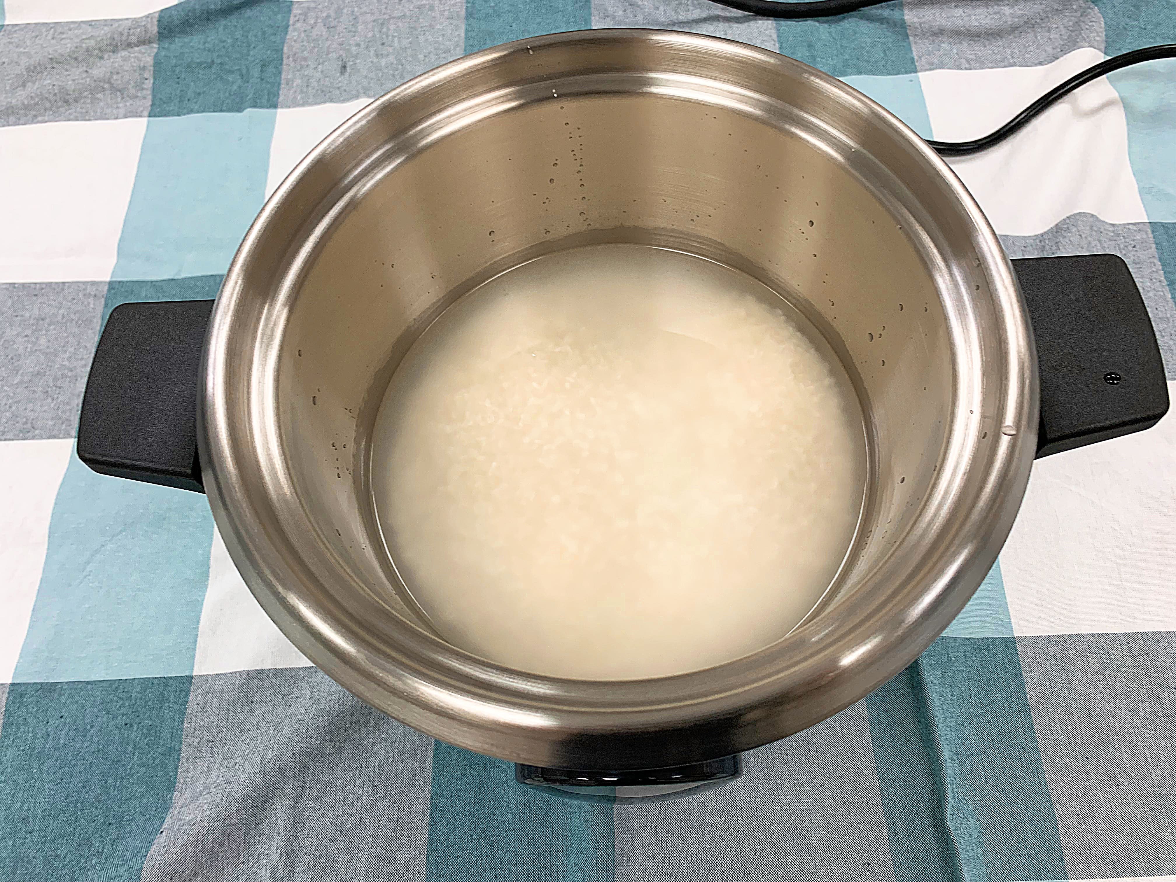 將白米洗淨,倒入1.3杯水,置於電鍋內鍋中。