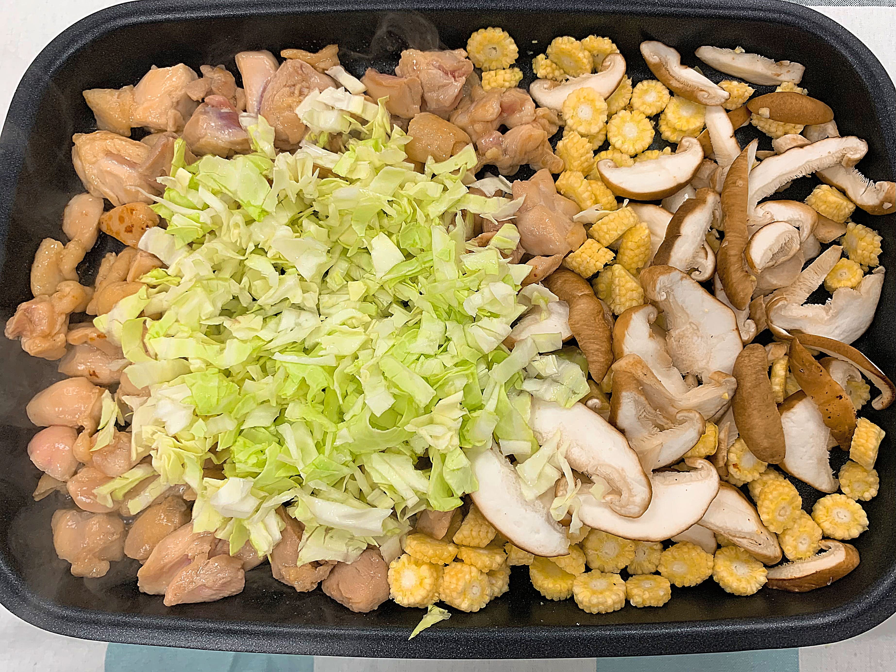 香菇、洋蔥、玉米筍、高麗菜切好備用。