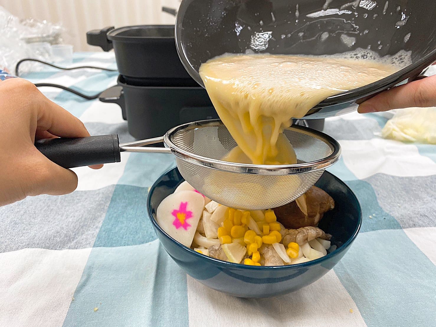 蛋液用濾網濾除一些蛋筋後,倒入碗中,大約八分滿即可~