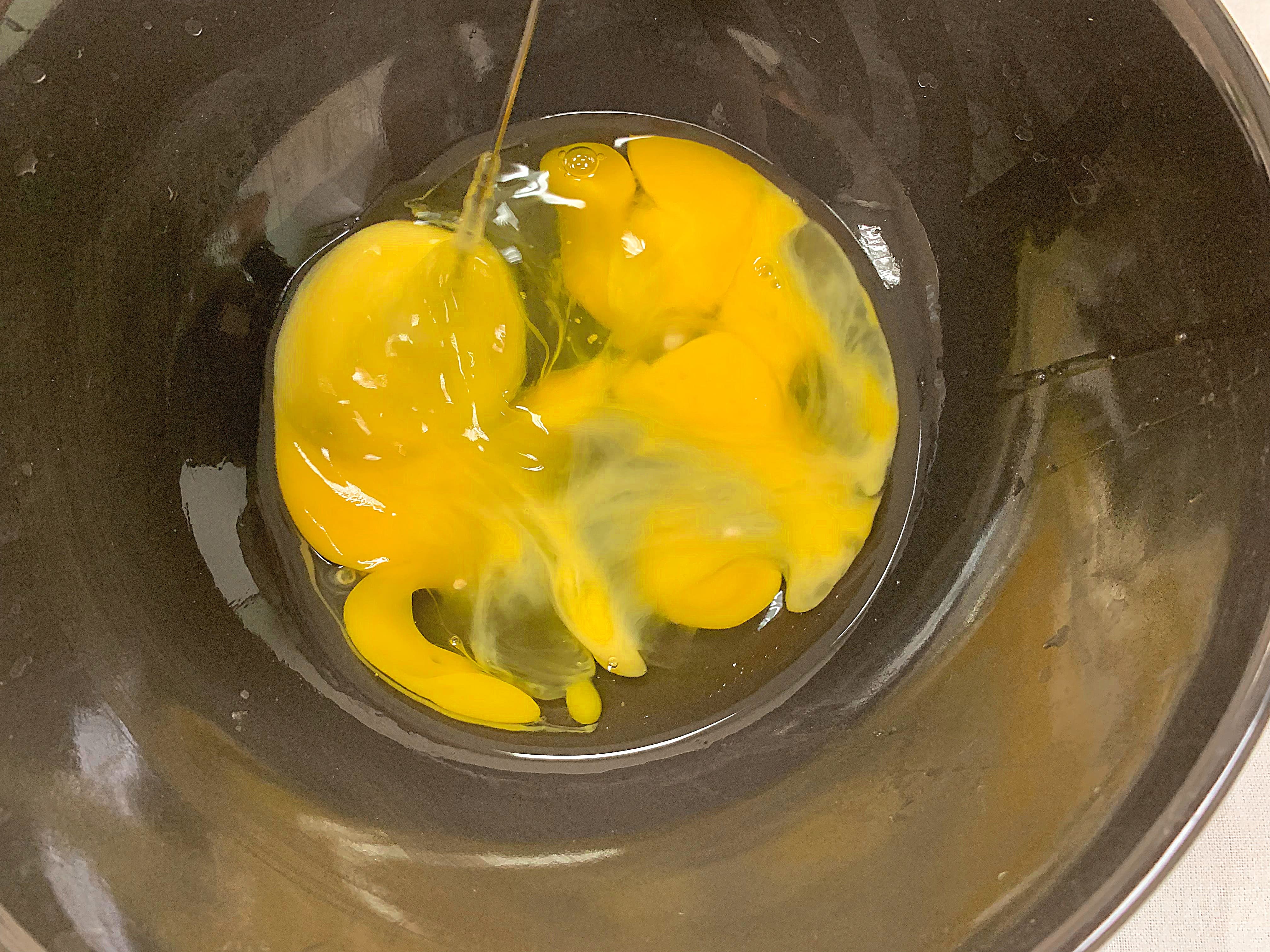 三顆雞蛋混合、攪拌均勻成蛋液。