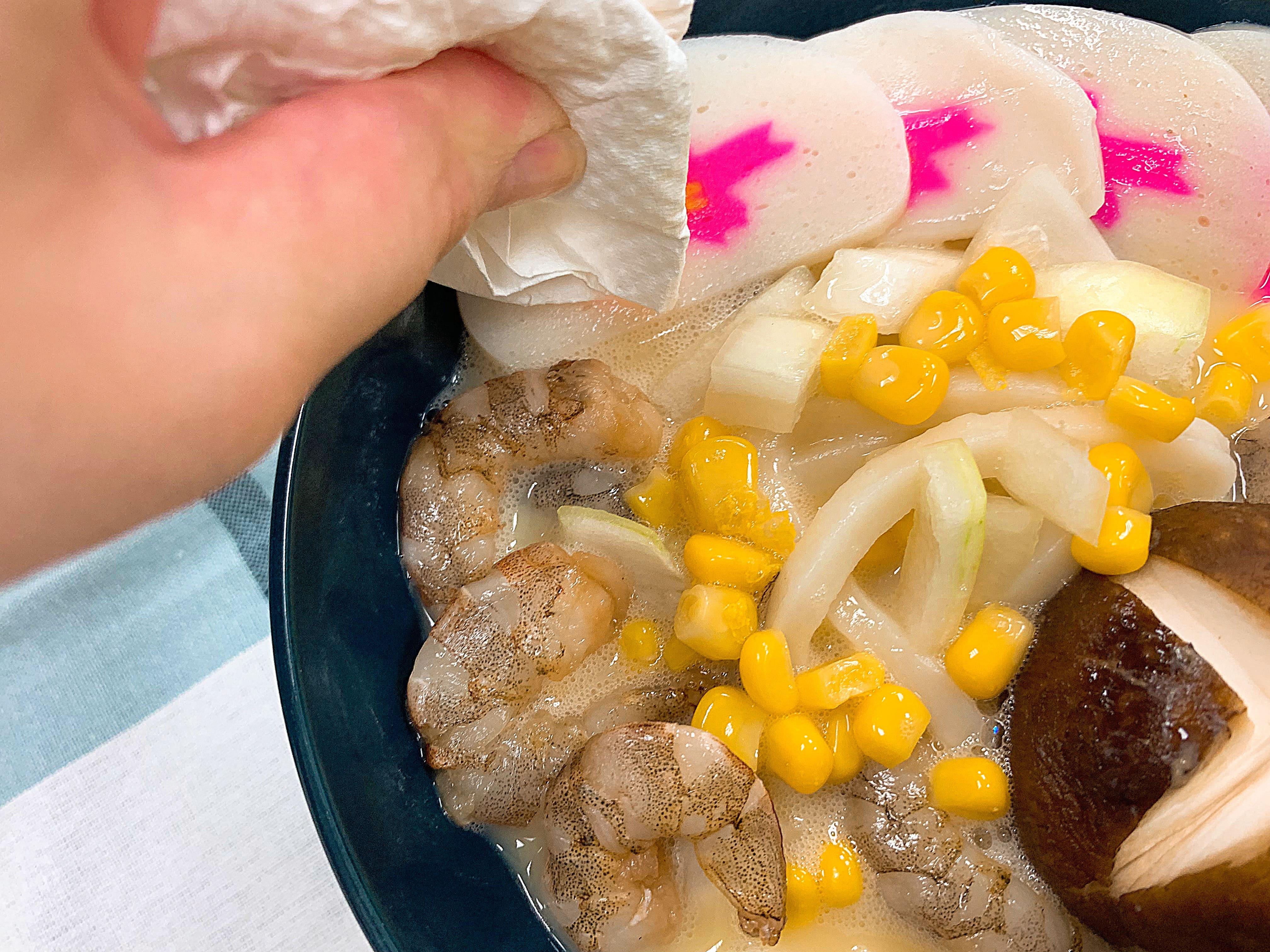 蛋液表面有一些泡泡,可以拿廚房紙巾把它吸除,蒸起來就會很漂亮喔~