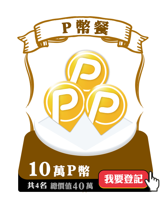 - 貳獎10萬P幣領獎說明:此活動之《P幣》使用的效期需依活動規範公告為準,不得延展,亦不得作不同帳號之轉移。有效期間屆滿若未將《P幣》使用完畢,此活動獲得之《P幣》即自動失效,不得以任何理由要求本公司繼續提供折扣、折抵現金或回復尚未使用的《P幣》。