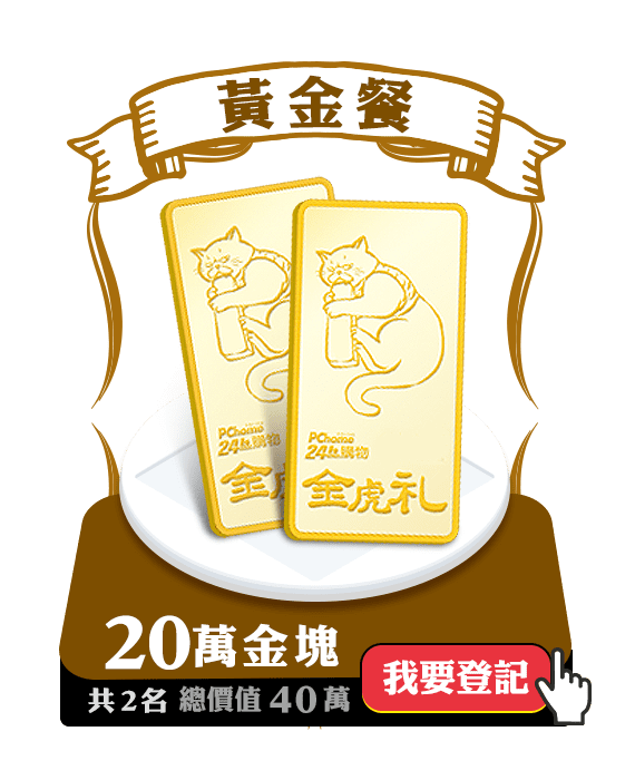 - 頭獎 : PChome獨家限定款胖貓虎金條(2.5台兩、24K純金)兌換券(價值20萬),共抽出2名得獎者。(兌換期限至2022/09/30) ⇒「抽獎登記頁」