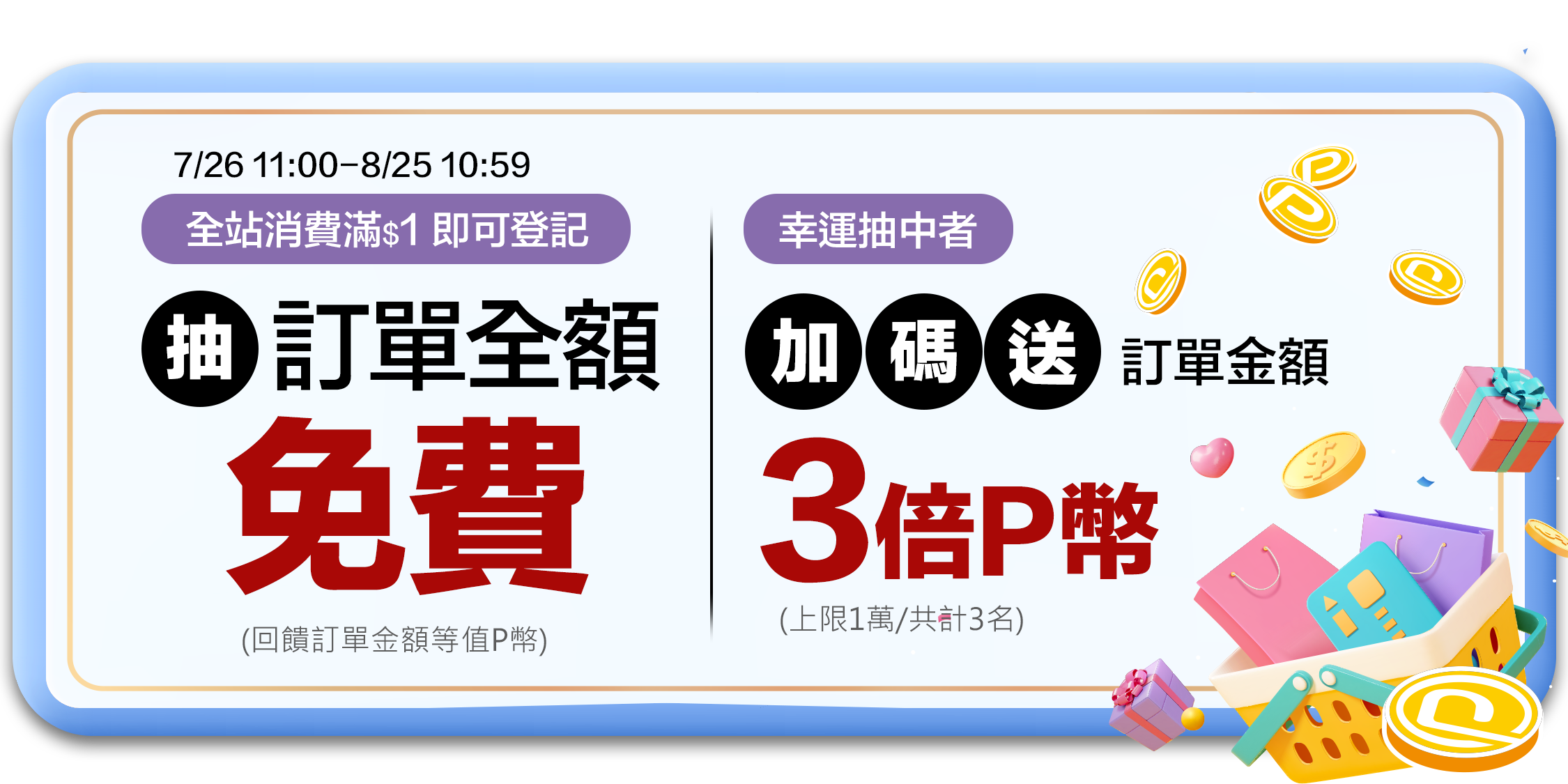 2.活動方式:全站單筆滿$1登記抽訂單免費及加碼3倍P幣回饋(總上限1萬P幣,排除儲值商品)