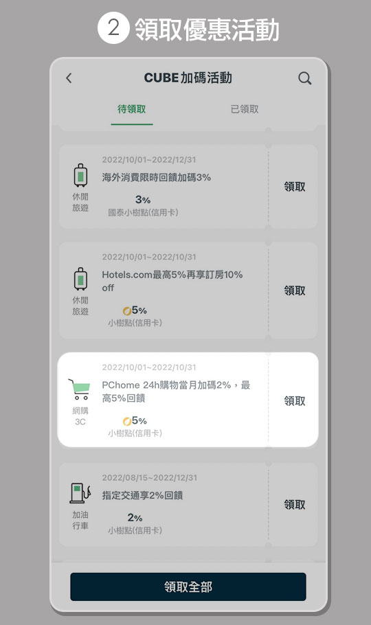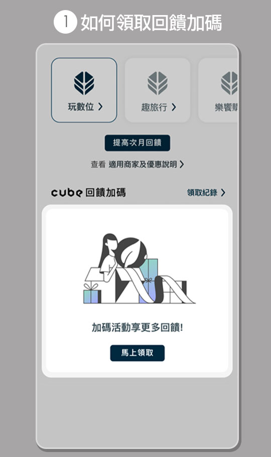 ■ CUBE App(原網銀App)領取「當月2%」回饋加碼:享2%小樹點(信用卡),回饋無上限。