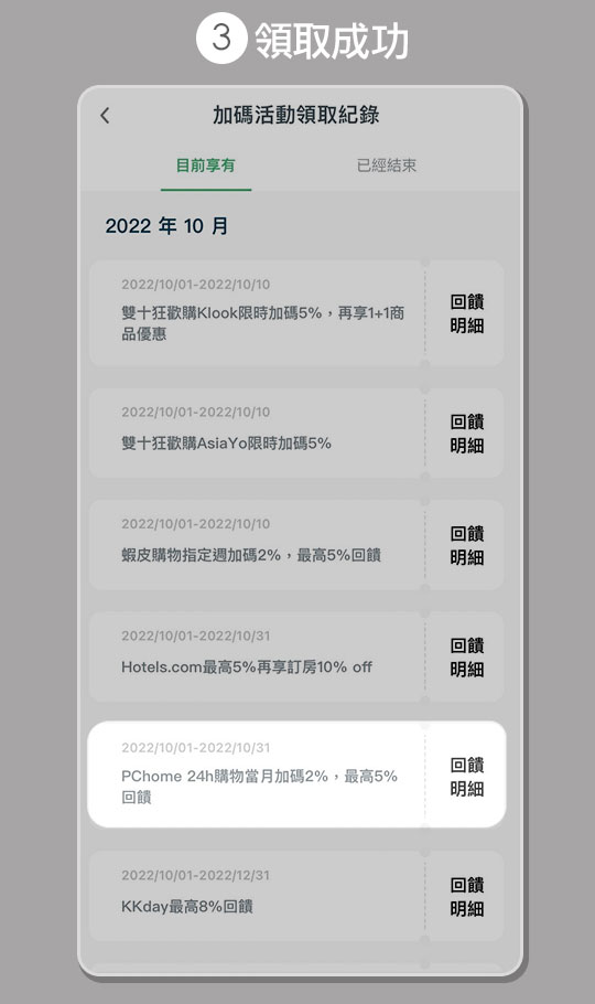 2.當月2%活動:活動期間為2022/12/1~2022/12/31,卡友須於每月活動期間登入本行CUBE App(原網銀App)領取當月2%回饋加碼,2%回饋計算將於每月活動領取日後(含當日)至當月月底前之新增消費方符合回饋計算,且消費入帳日需於當月活動結束後之10日內,即12月活動消費入帳日期為:2023/1/10前。