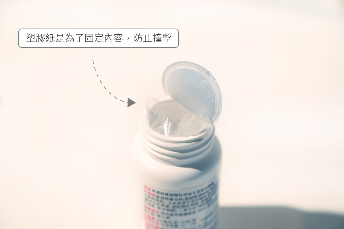 左圖中白色的粉末部分,是包含益生菌及一些輔料(如玉米來源可溶性纖維等)。