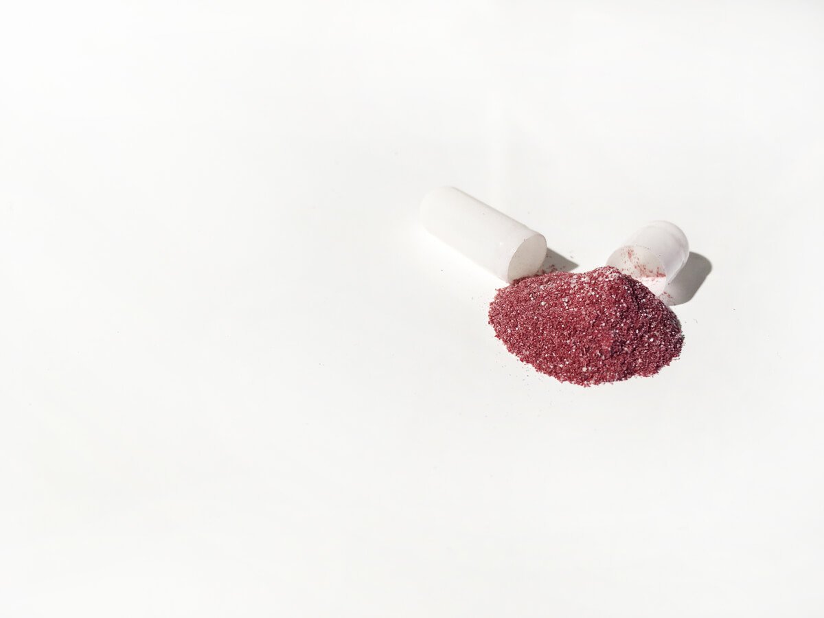 打開膠囊後,可以看見帶有天然莓粉色的莓果濃縮粉。