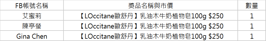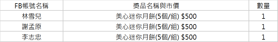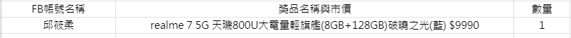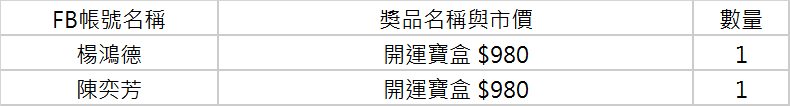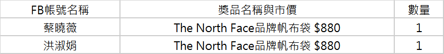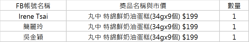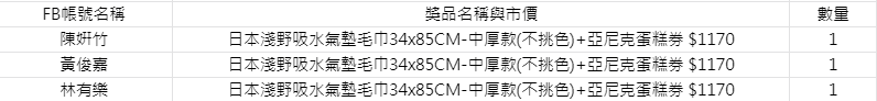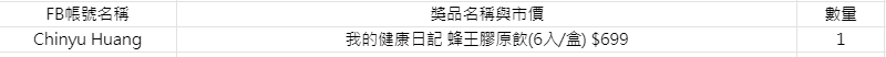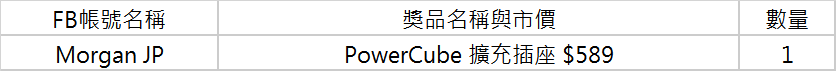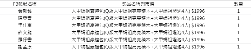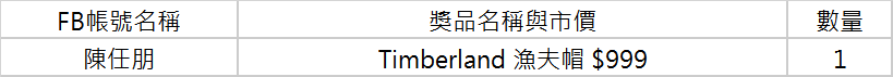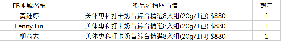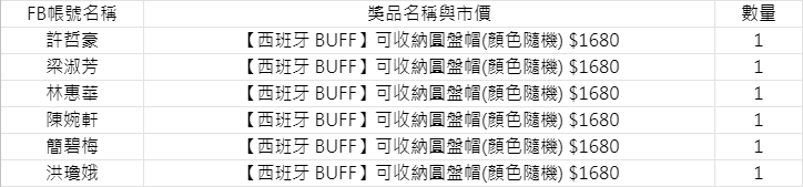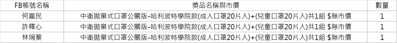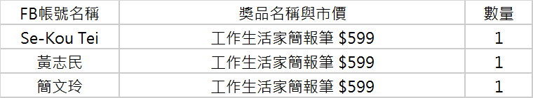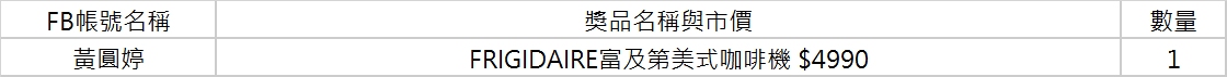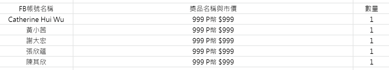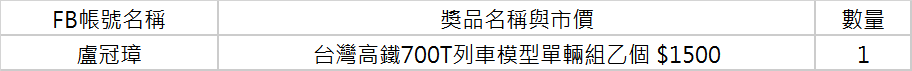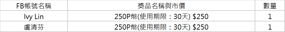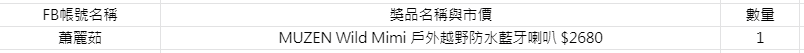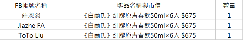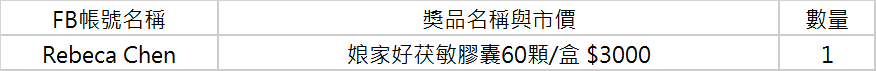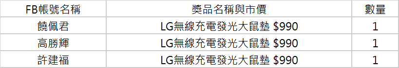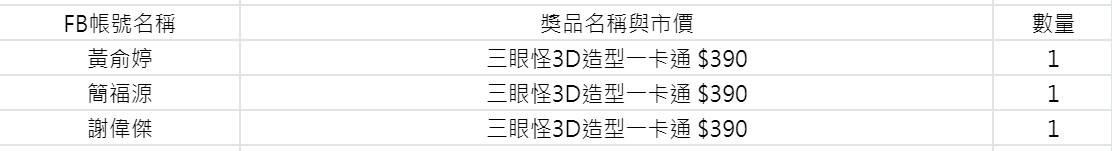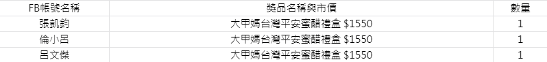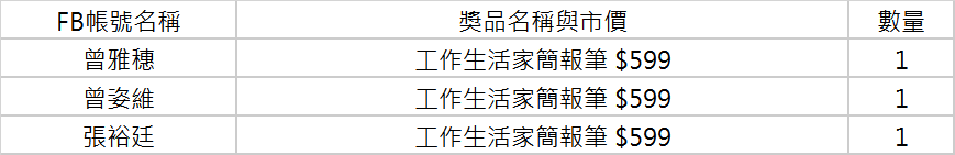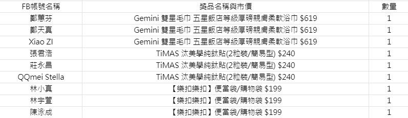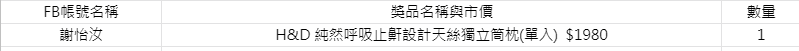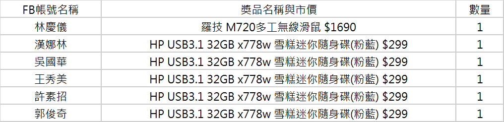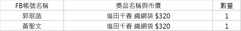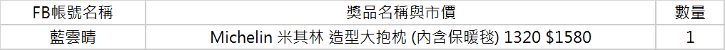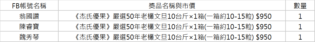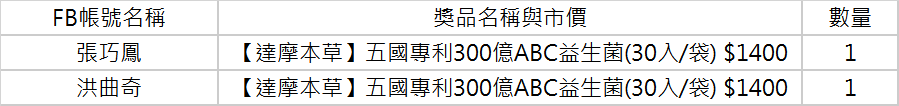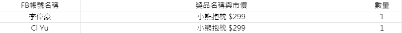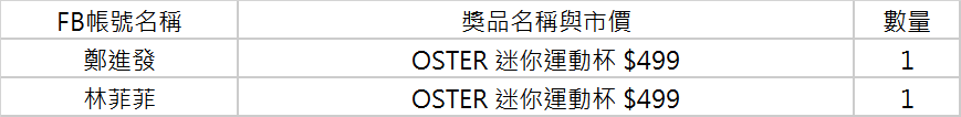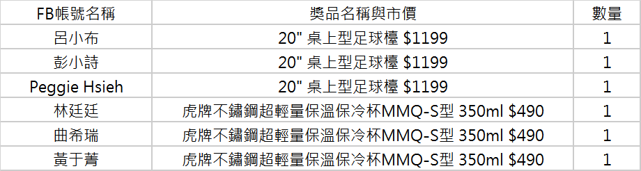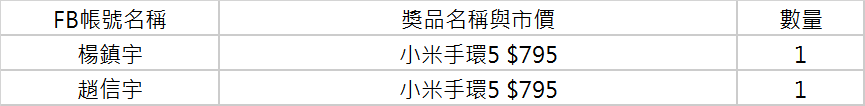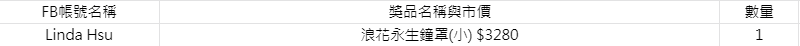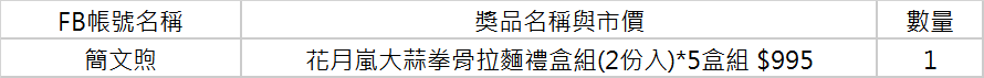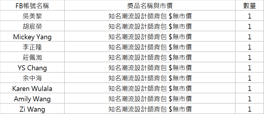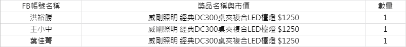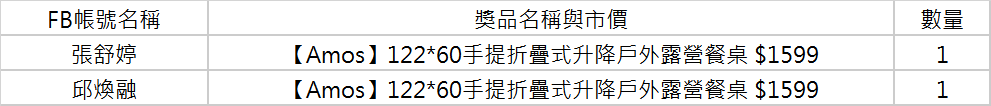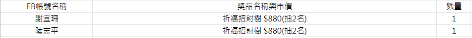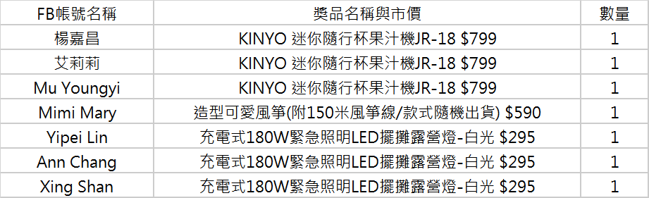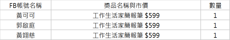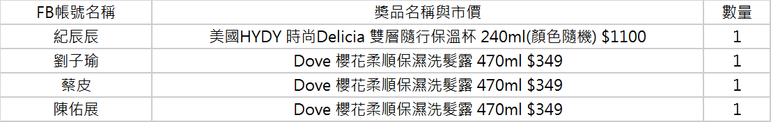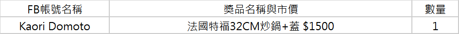 FB帳號名稱 | 獎品名稱與市價 | 數量 |