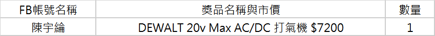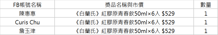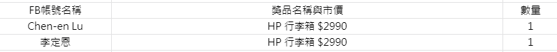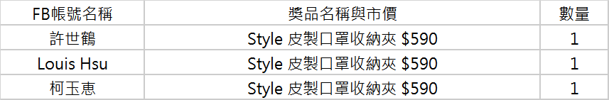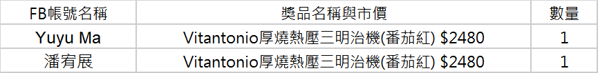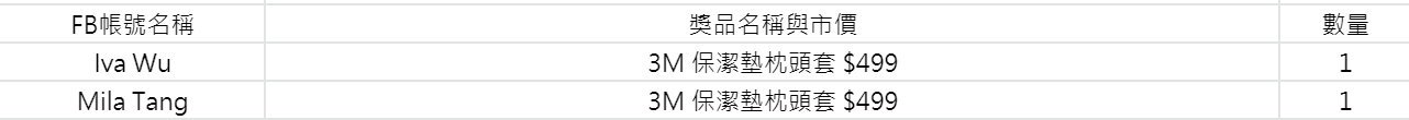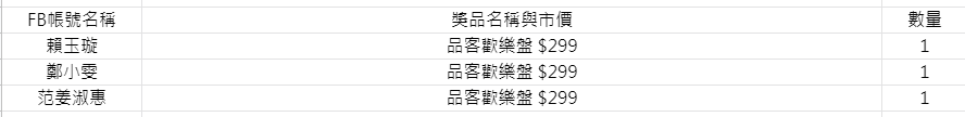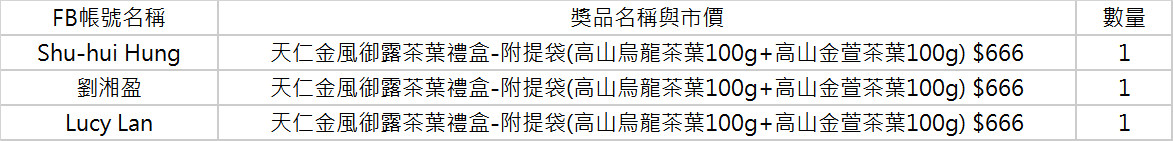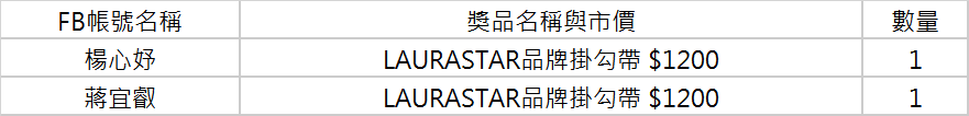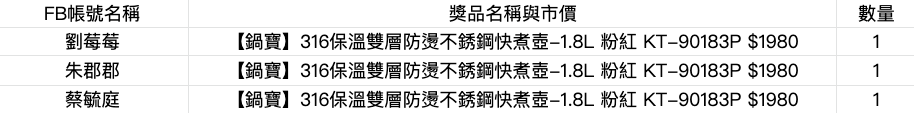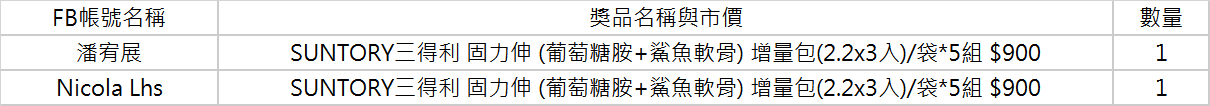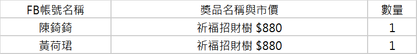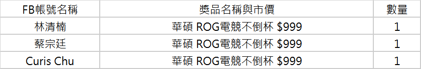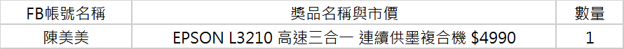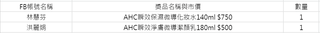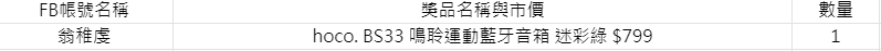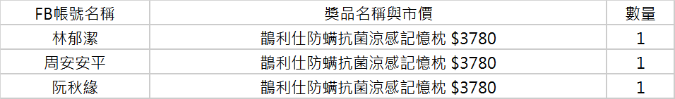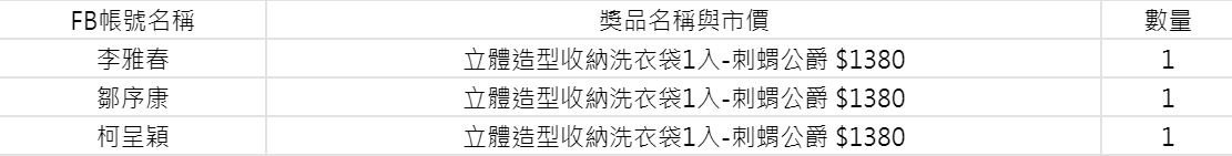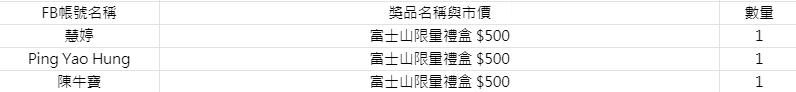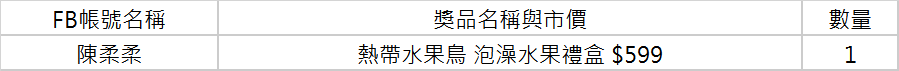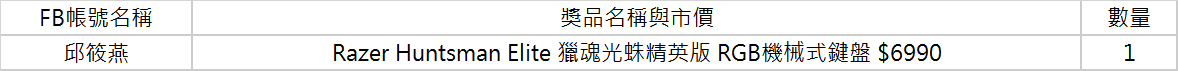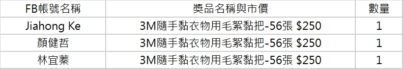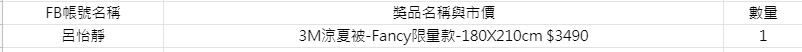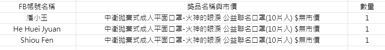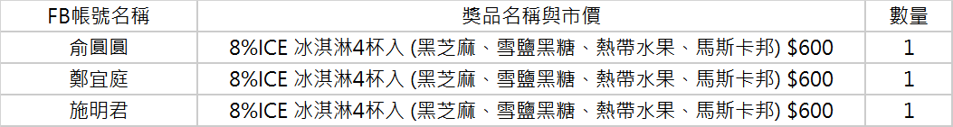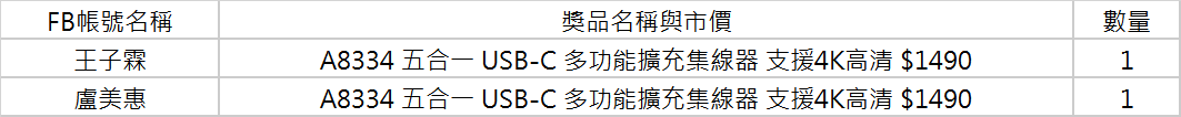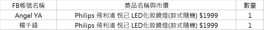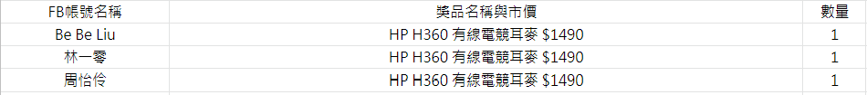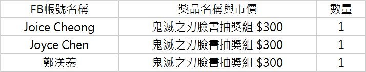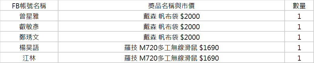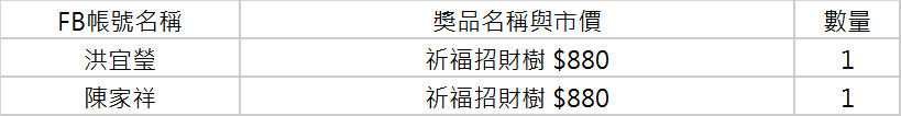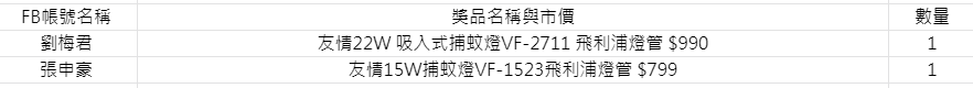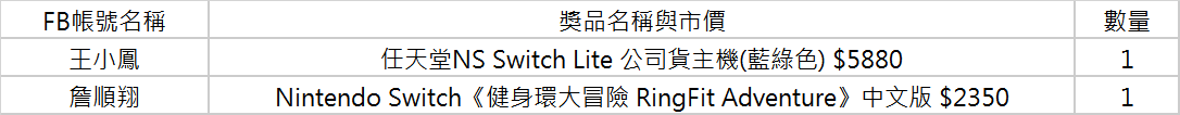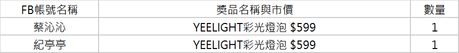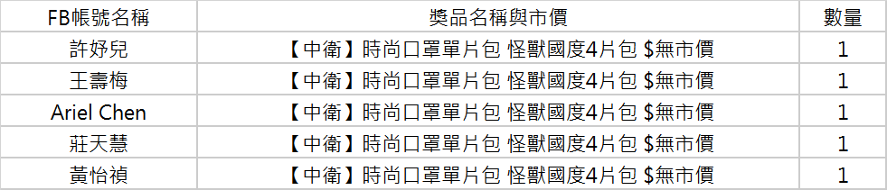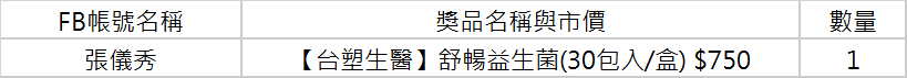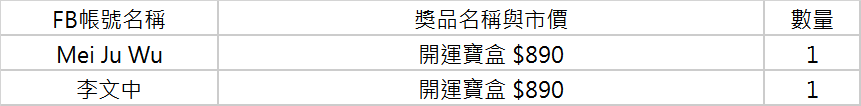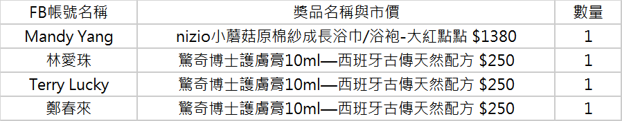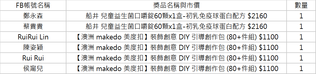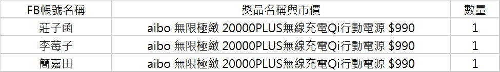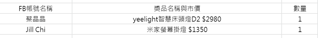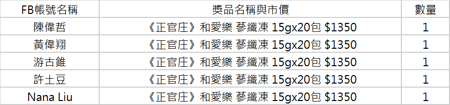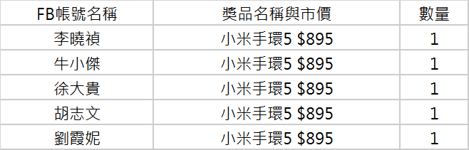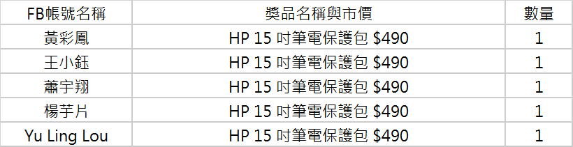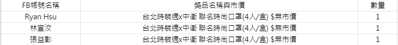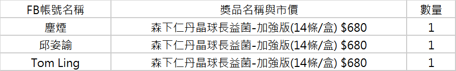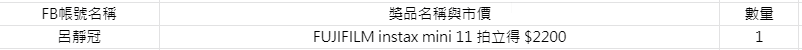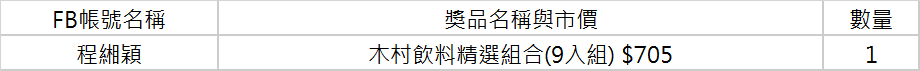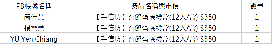 FB帳號名稱 | 獎品名稱與市價 | 數量 |