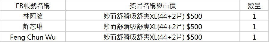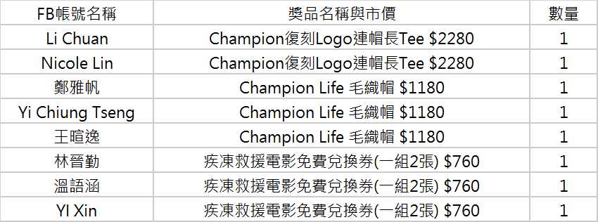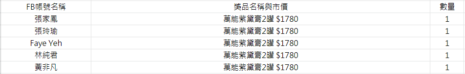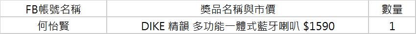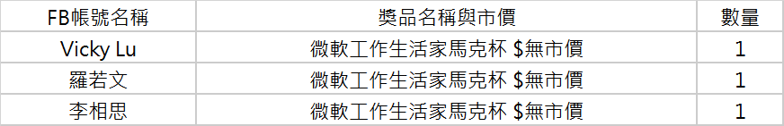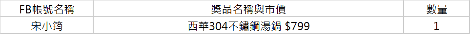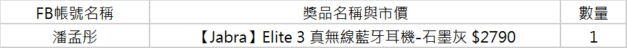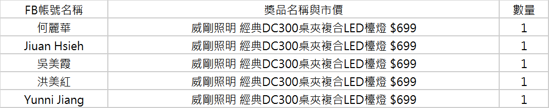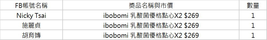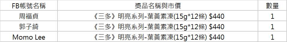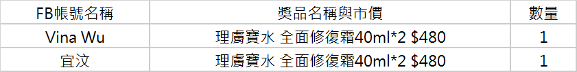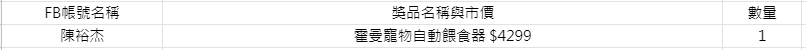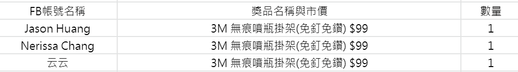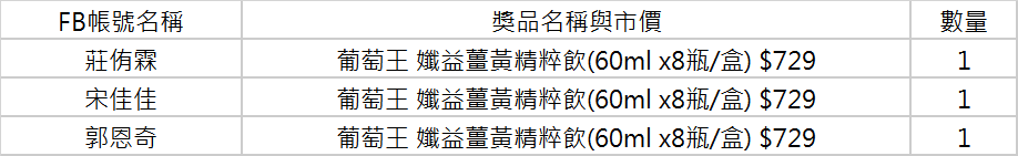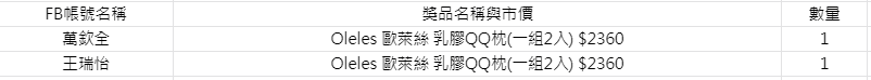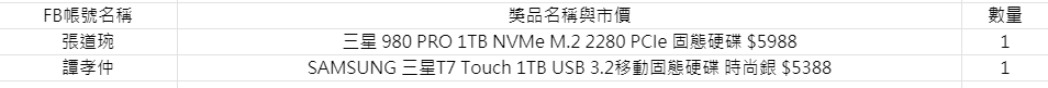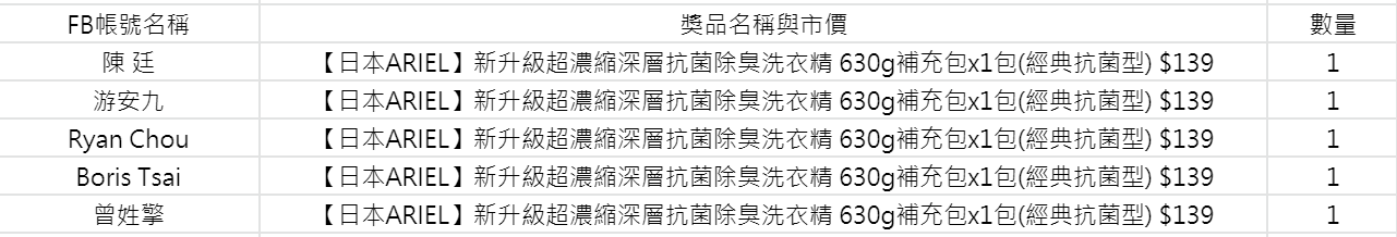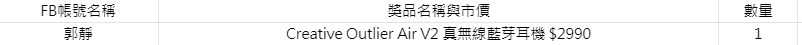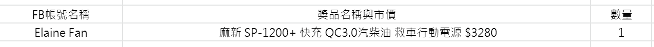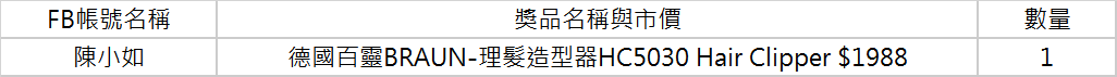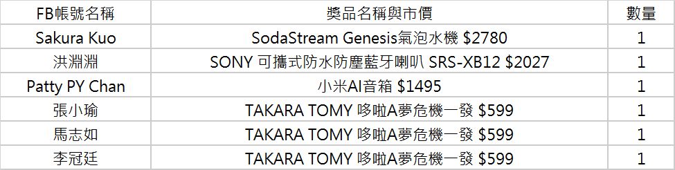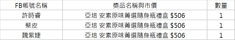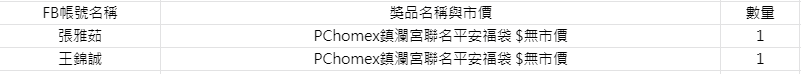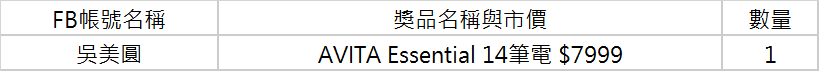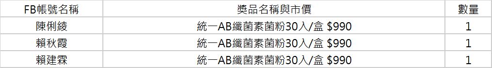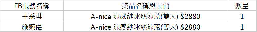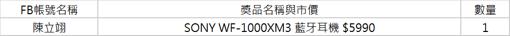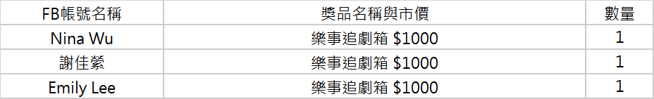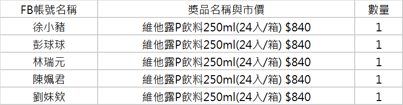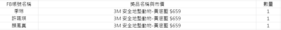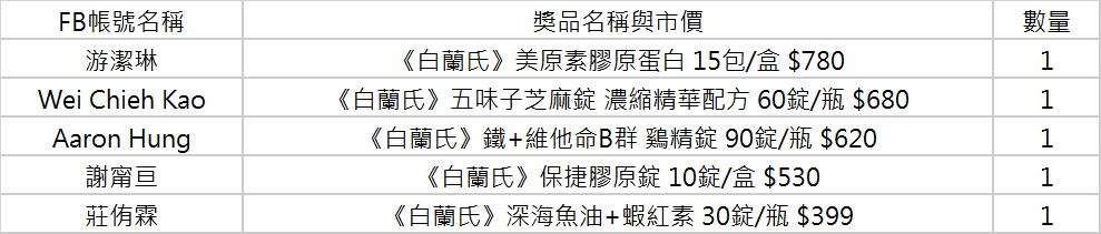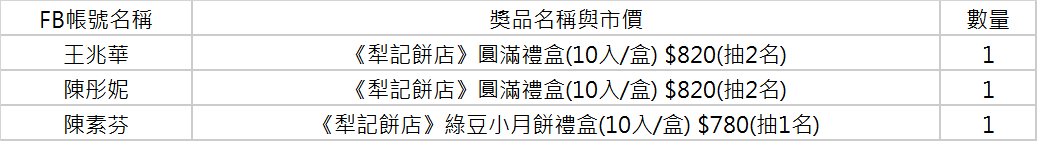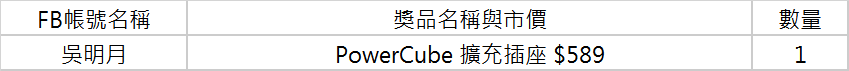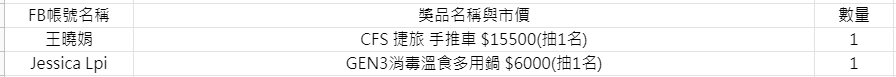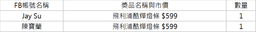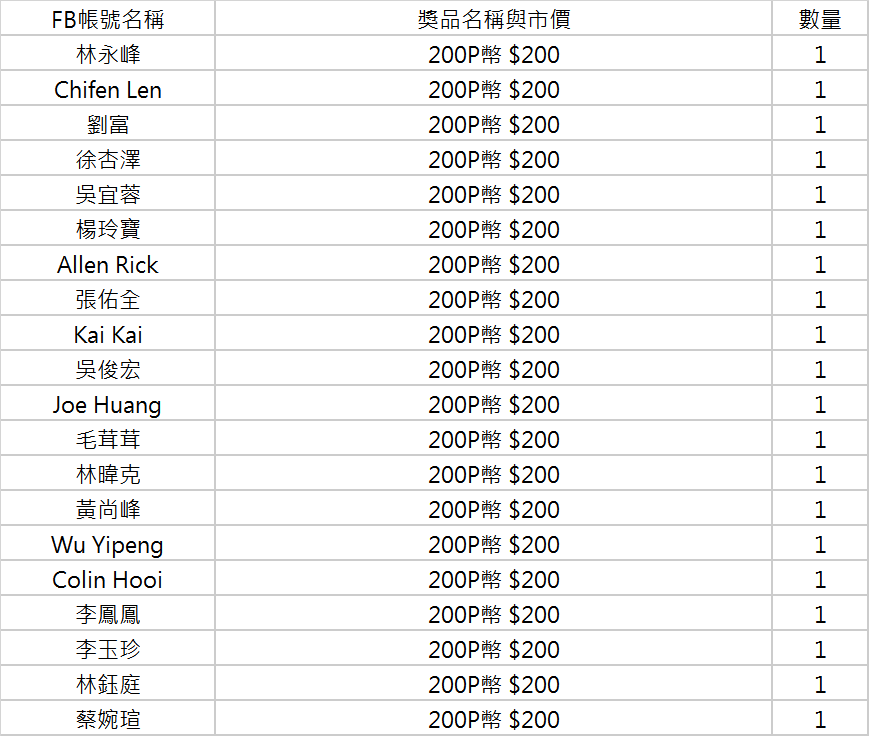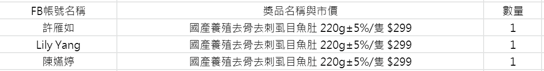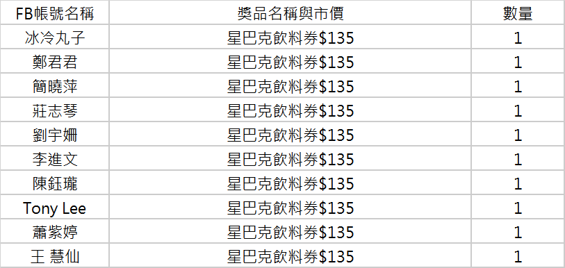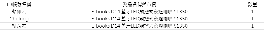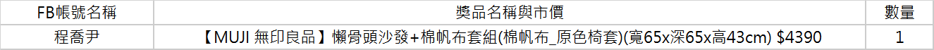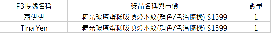 FB帳號名稱 | 獎品名稱與市價 | 數量 |