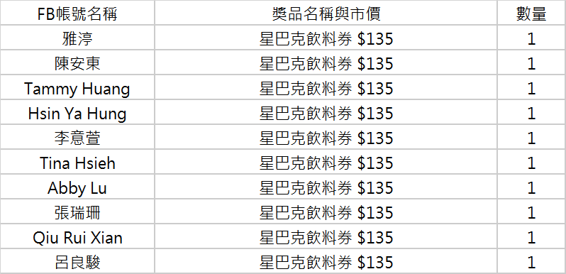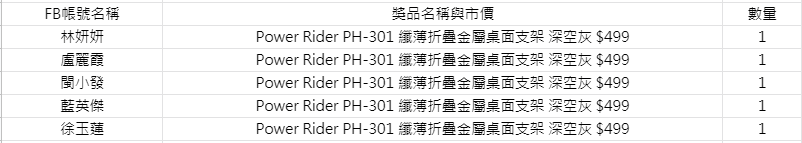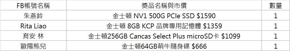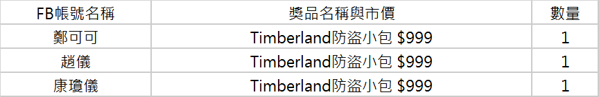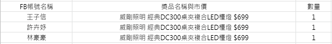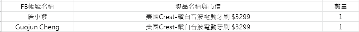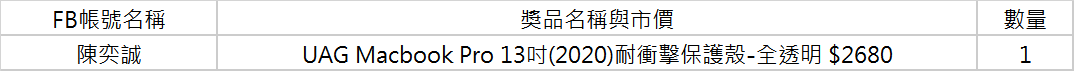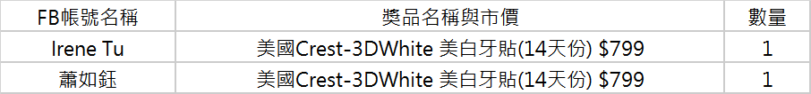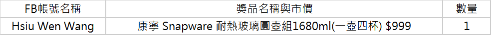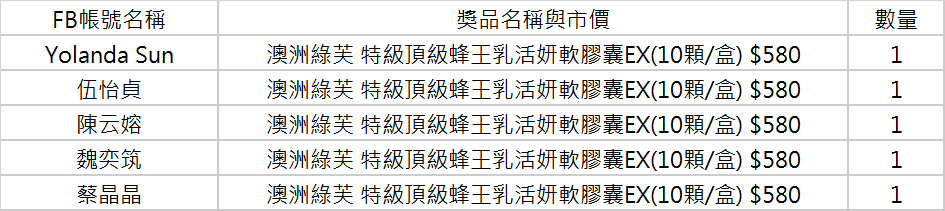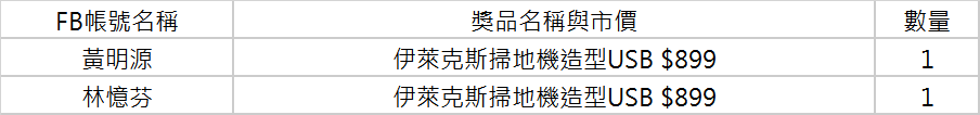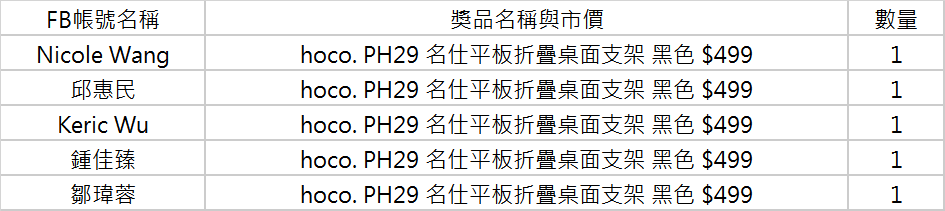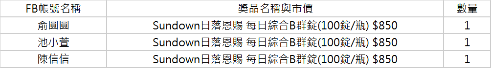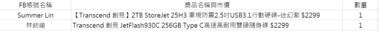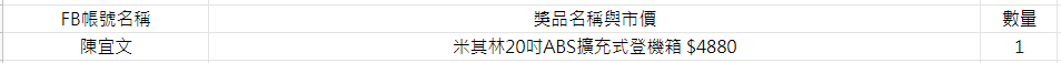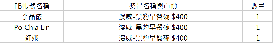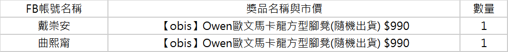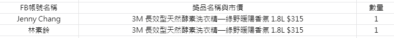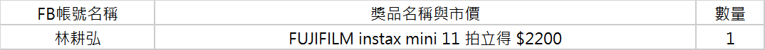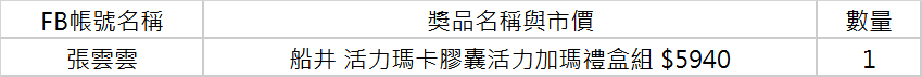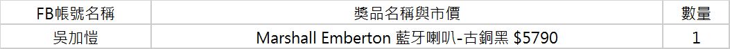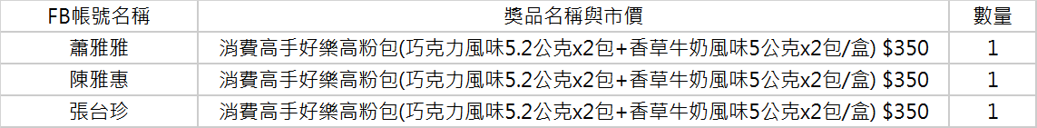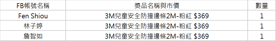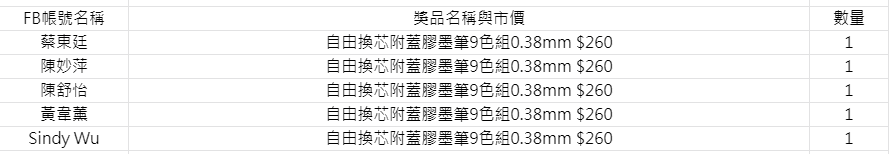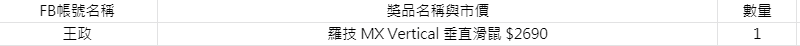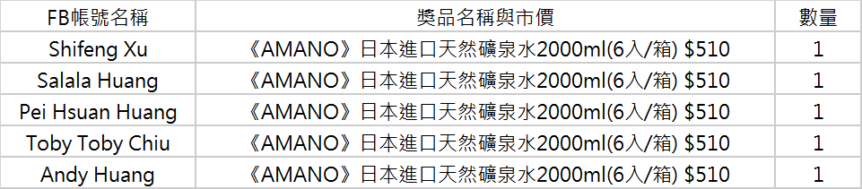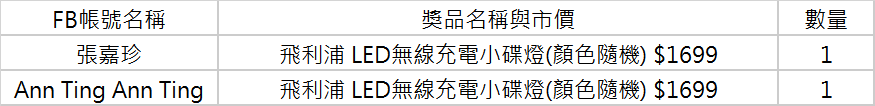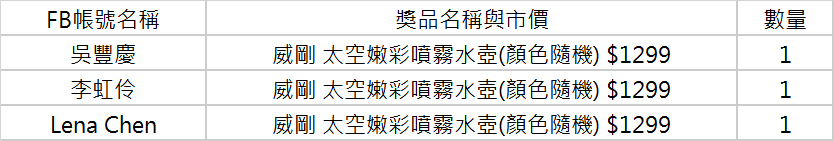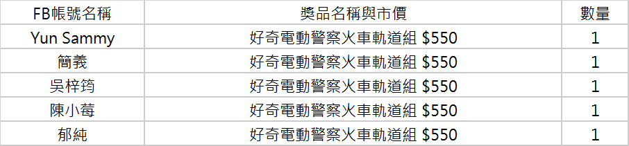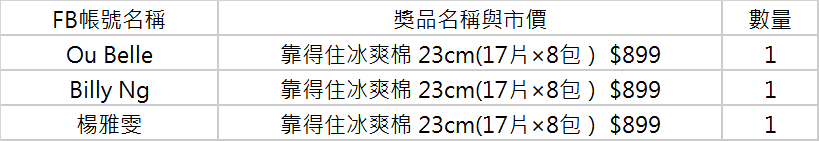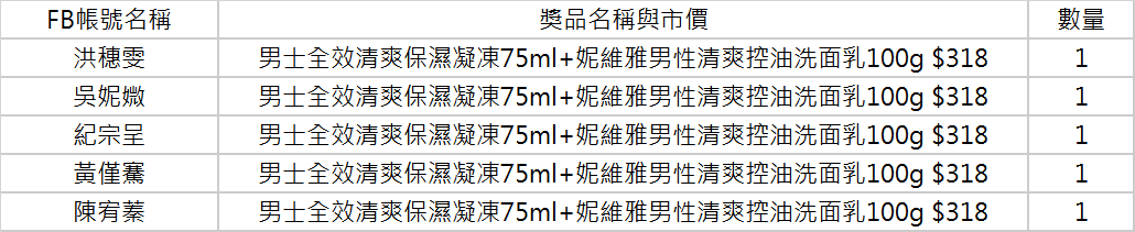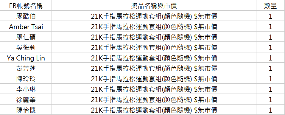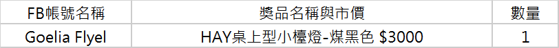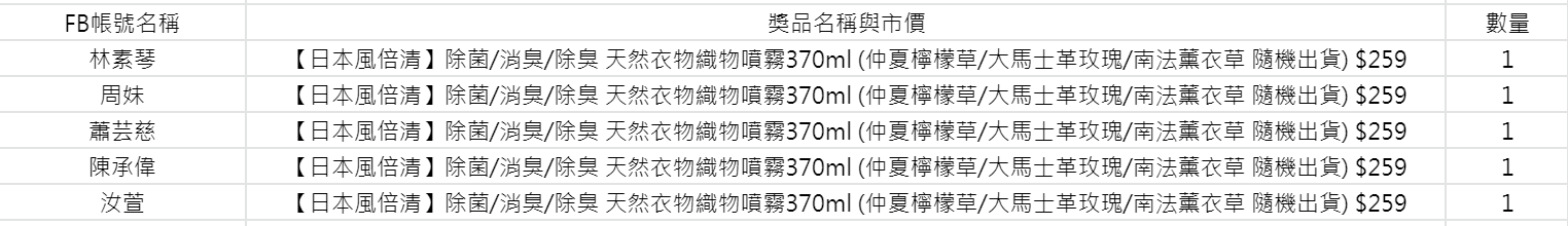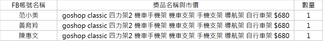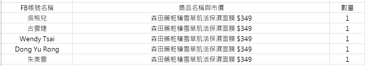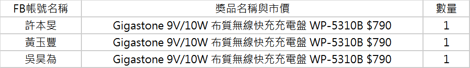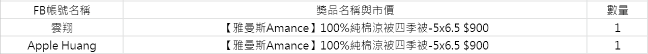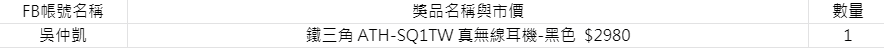 FB帳號名稱 | 獎品名稱與市價 | 數量 |