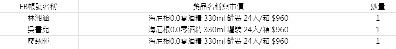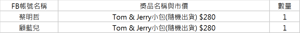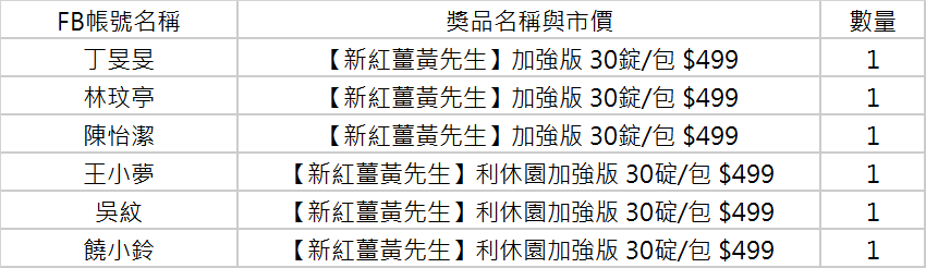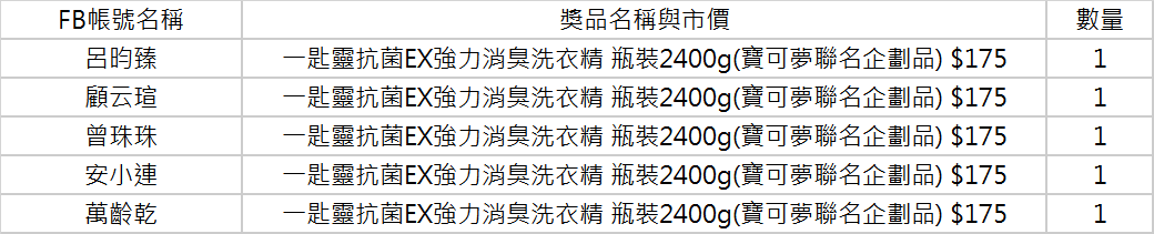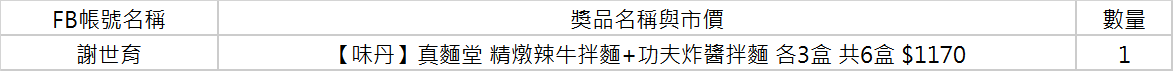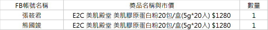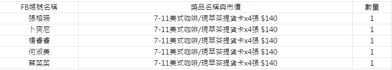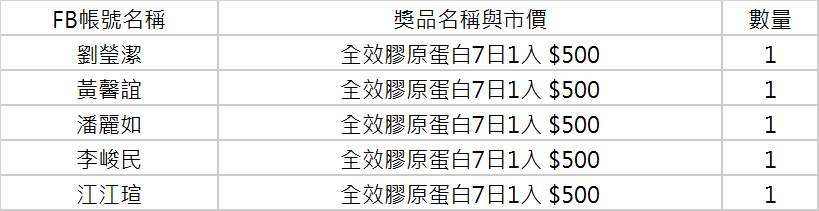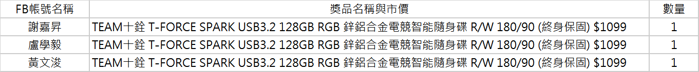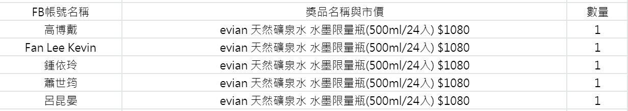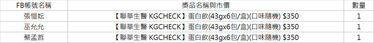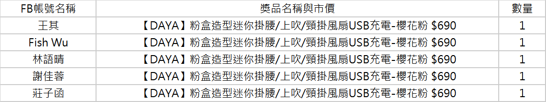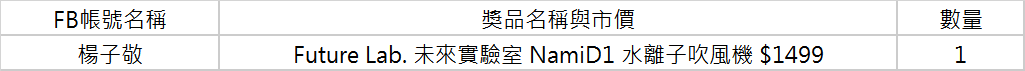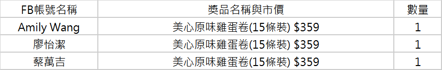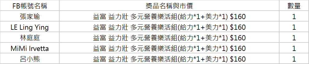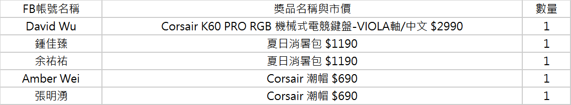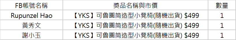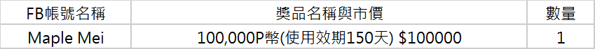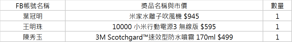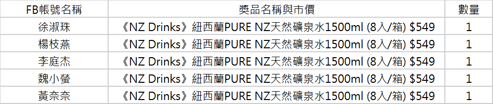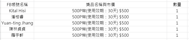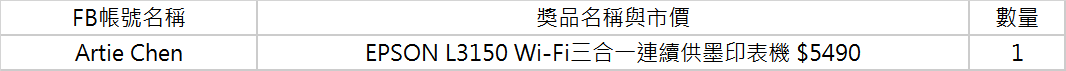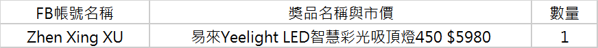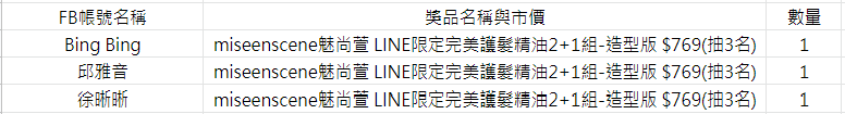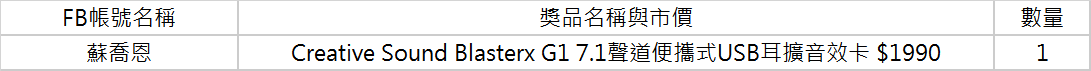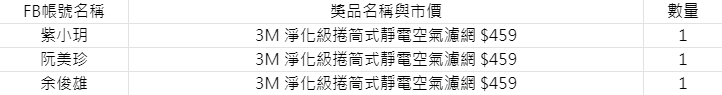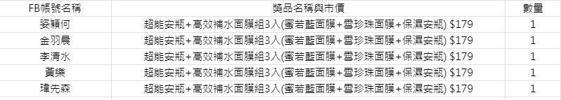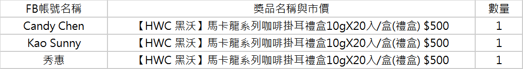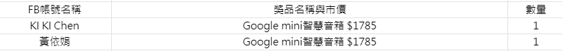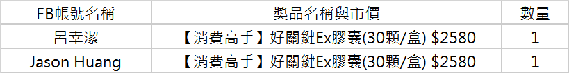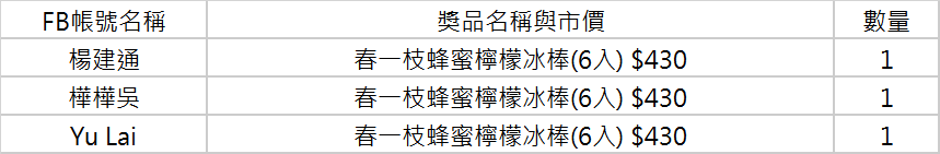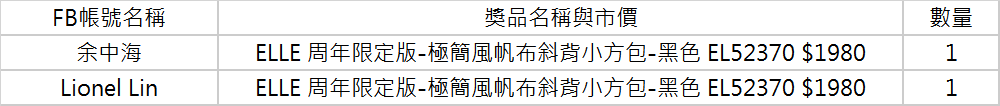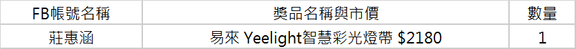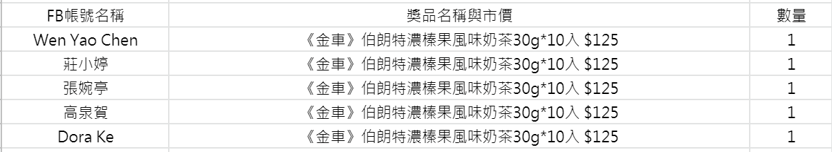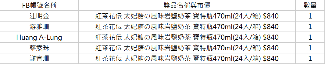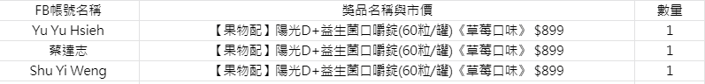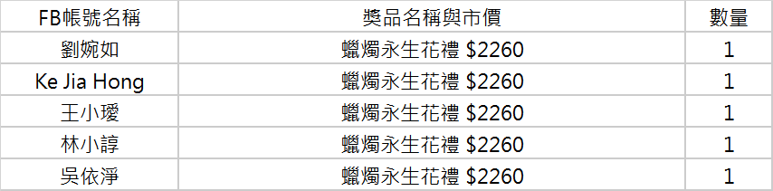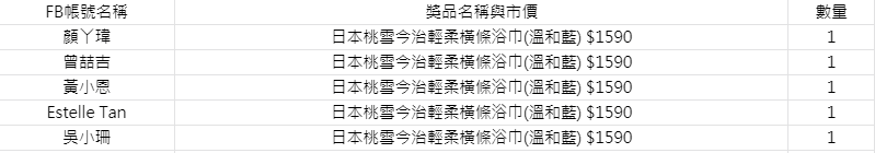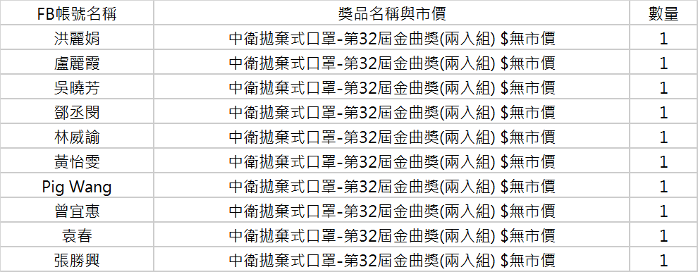 FB帳號名稱 | 獎品名稱與市價 | 數量 |