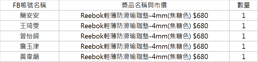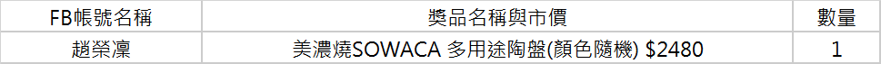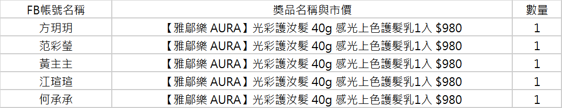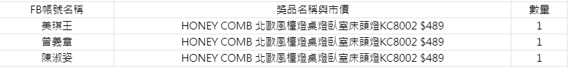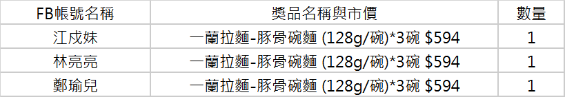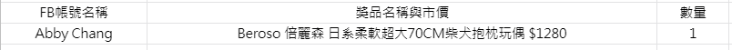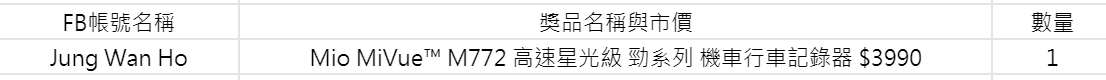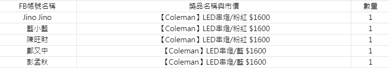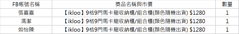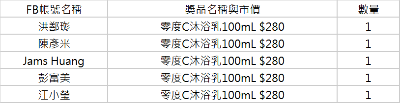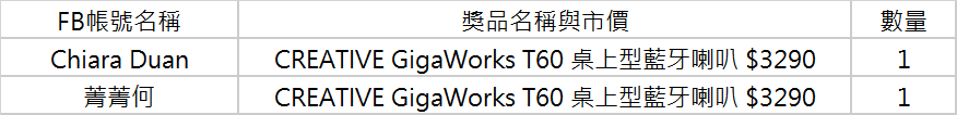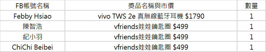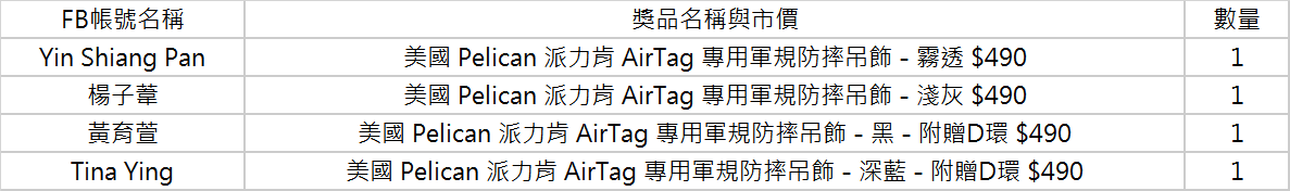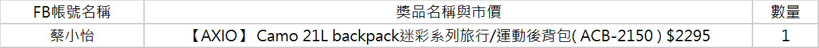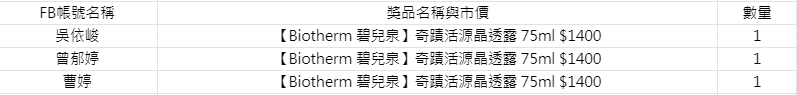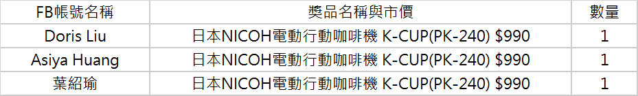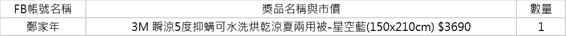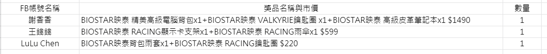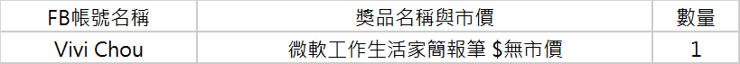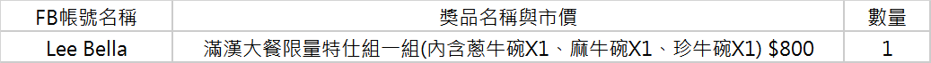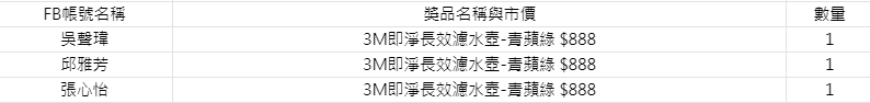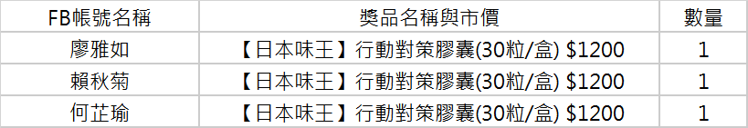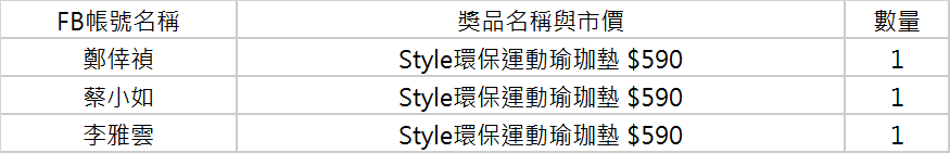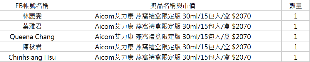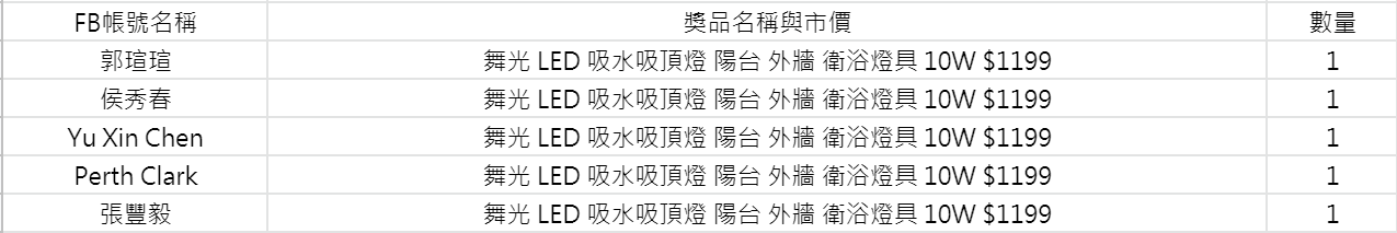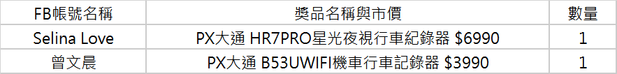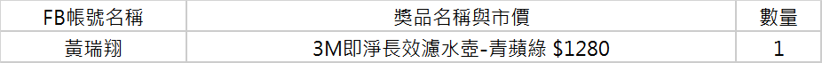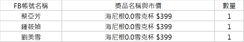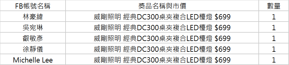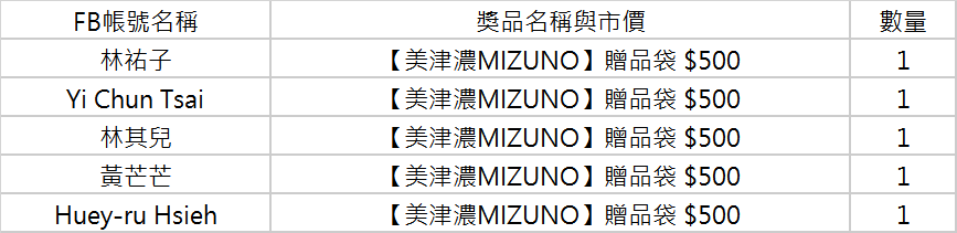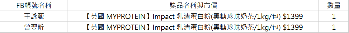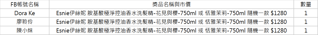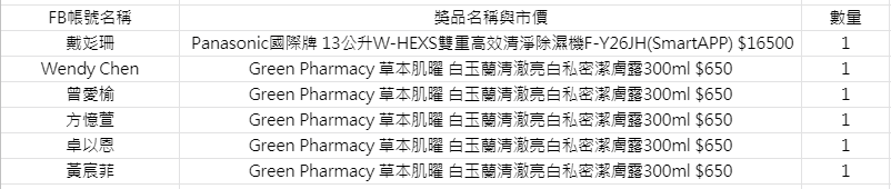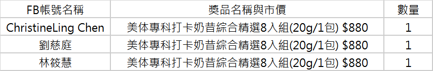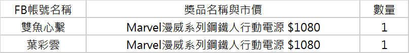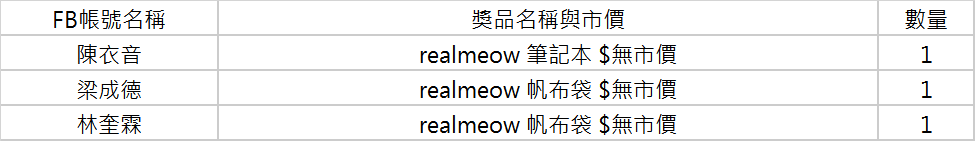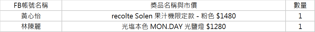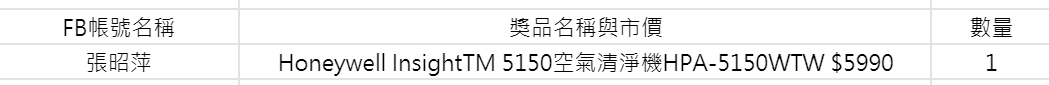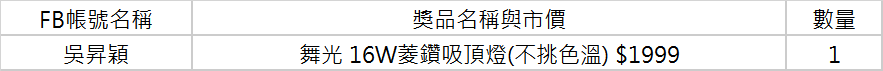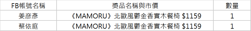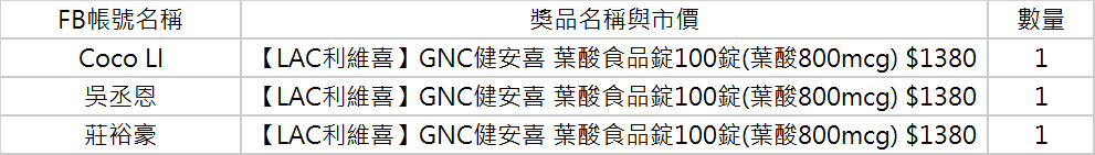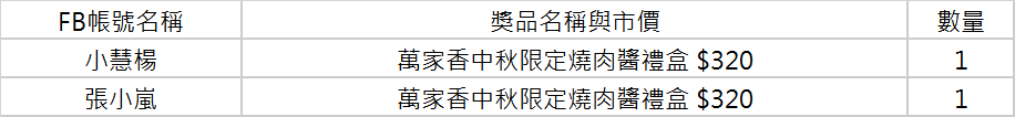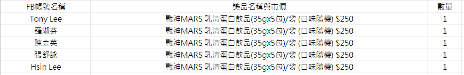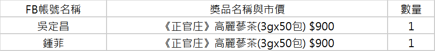 FB帳號名稱 | 獎品名稱與市價 | 數量 |
