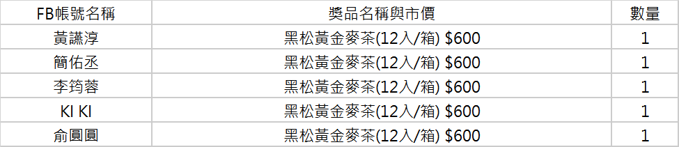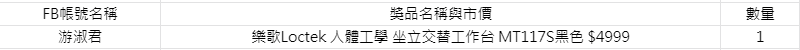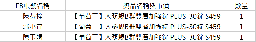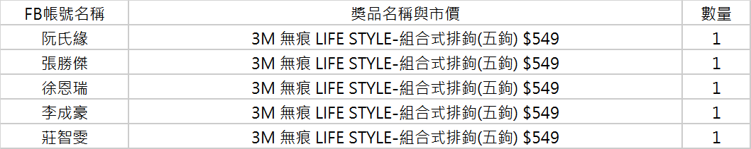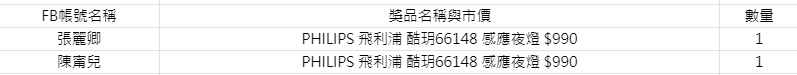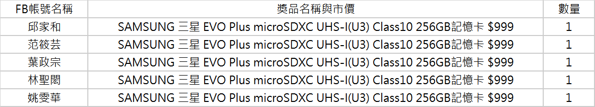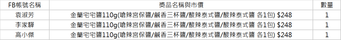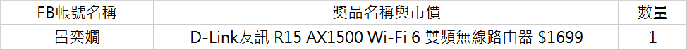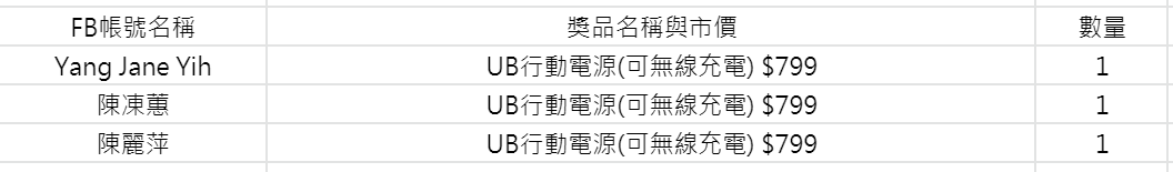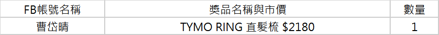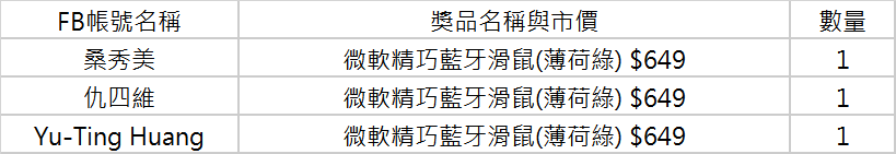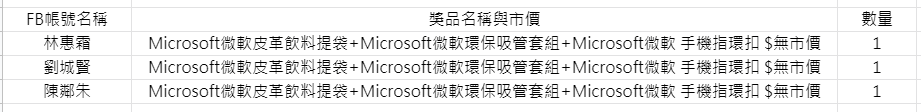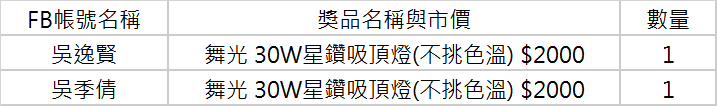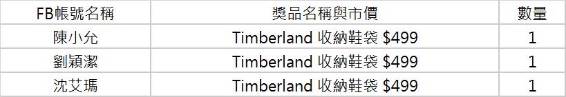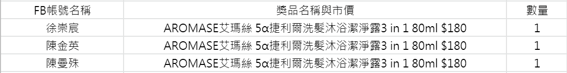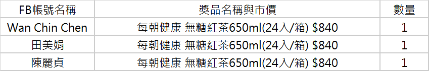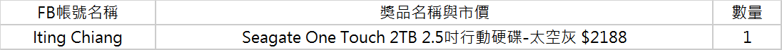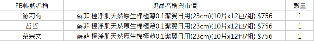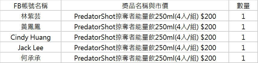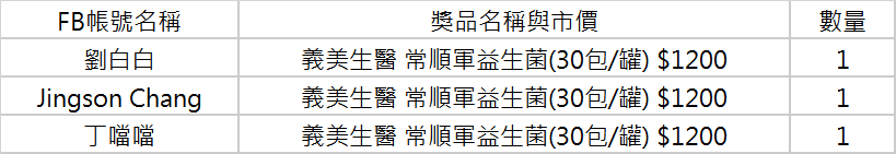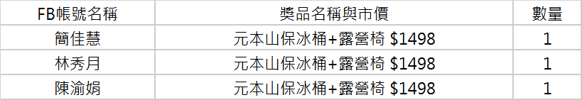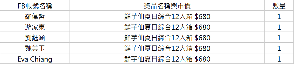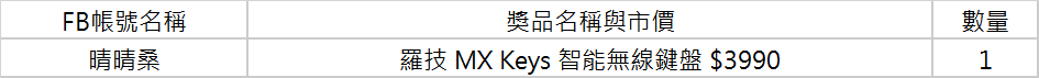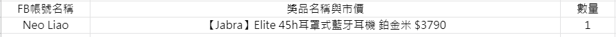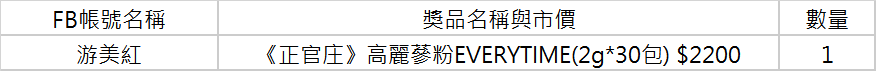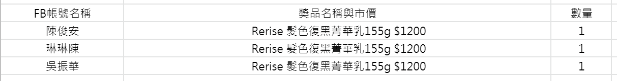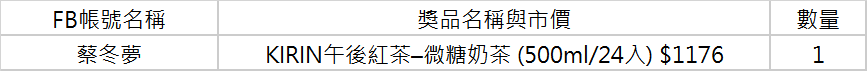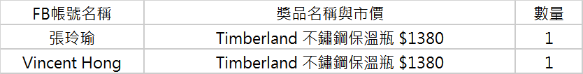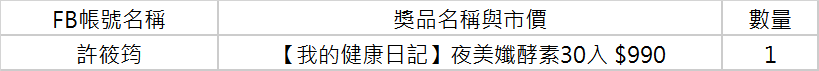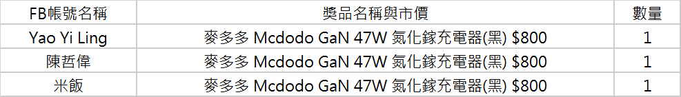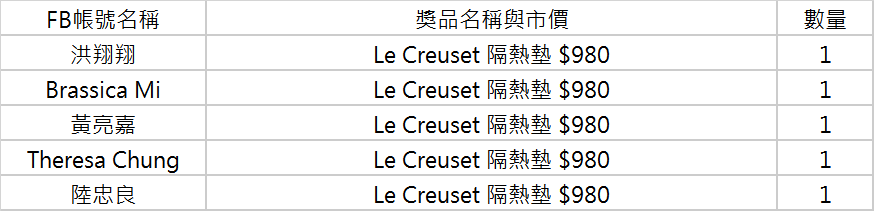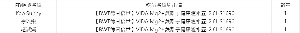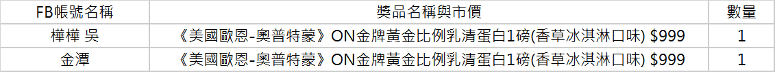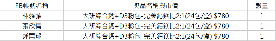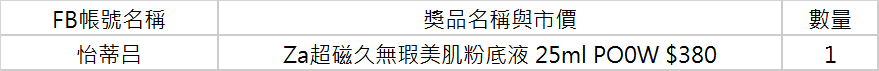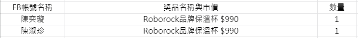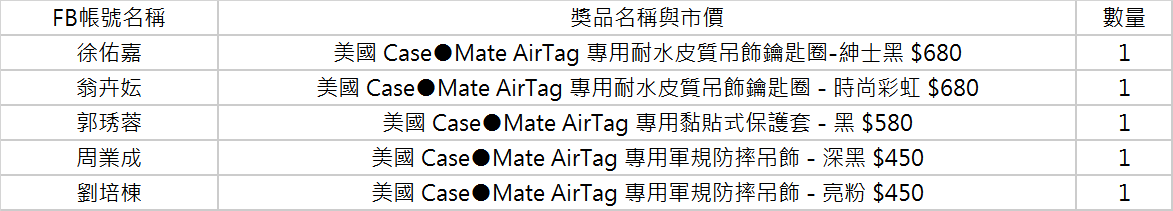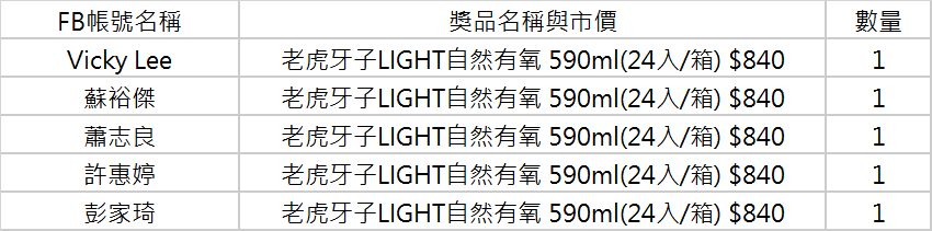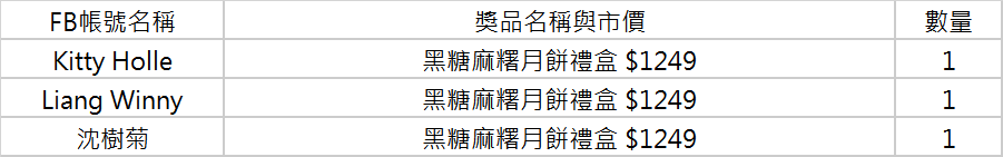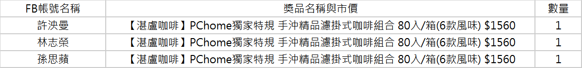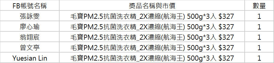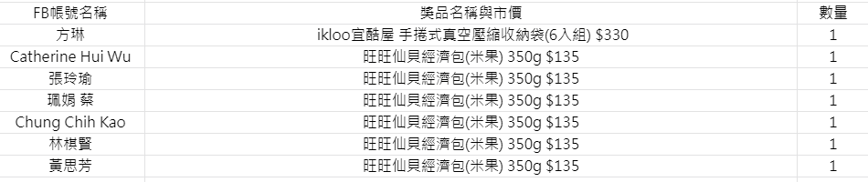 FB帳號名稱 | 獎品名稱與市價 | 數量 |