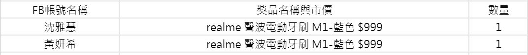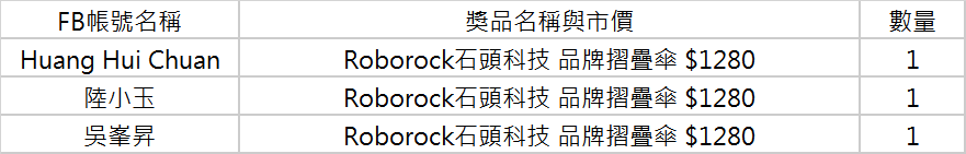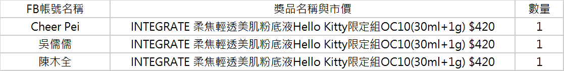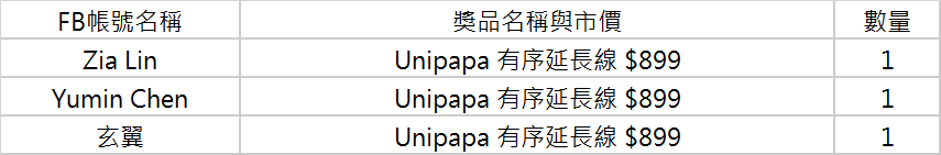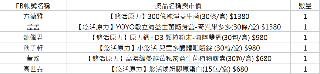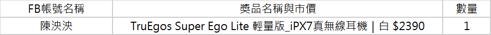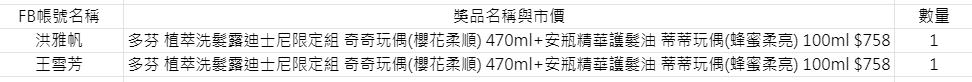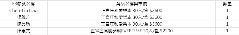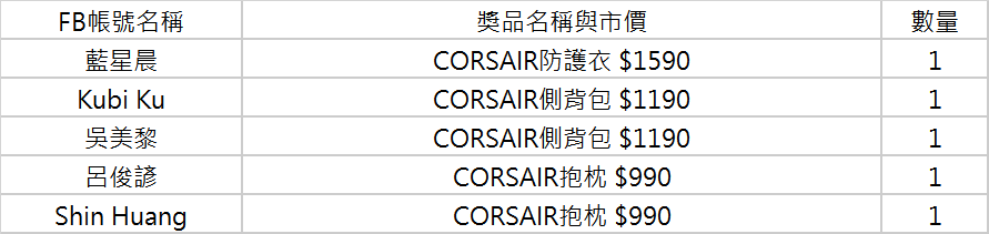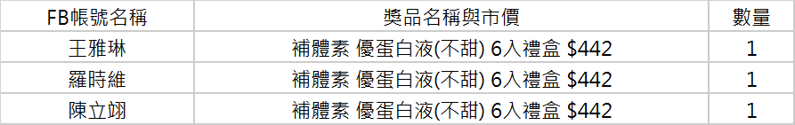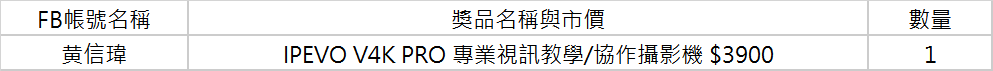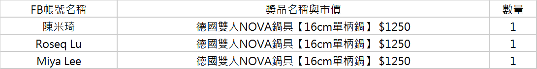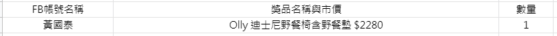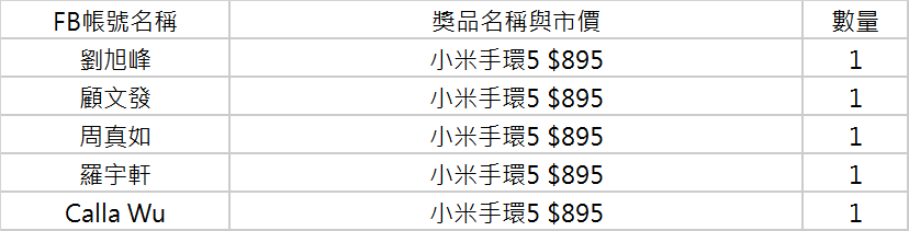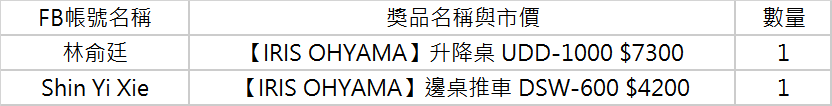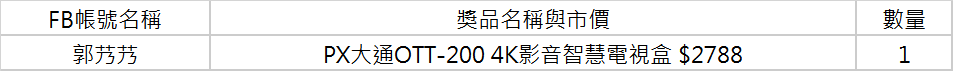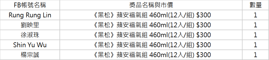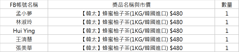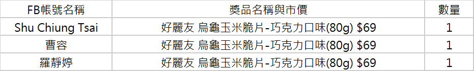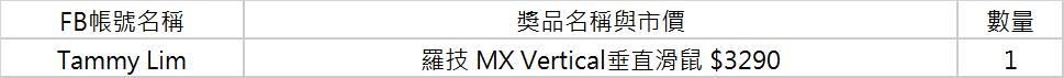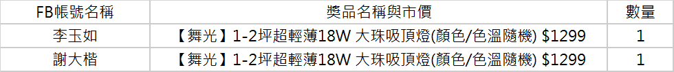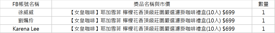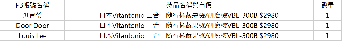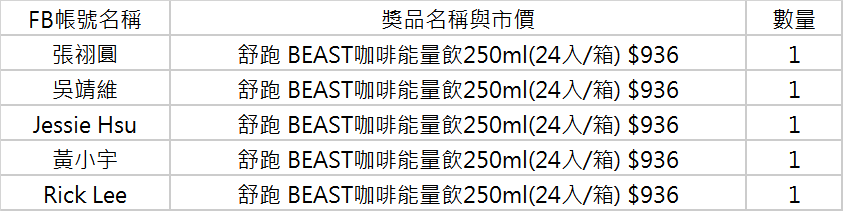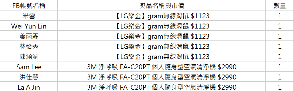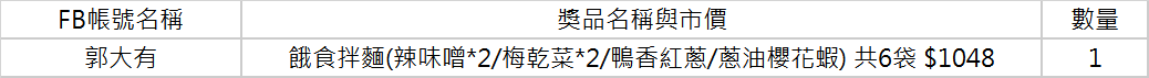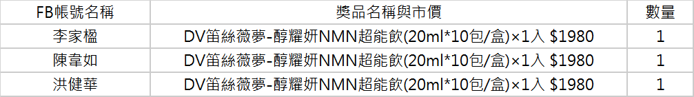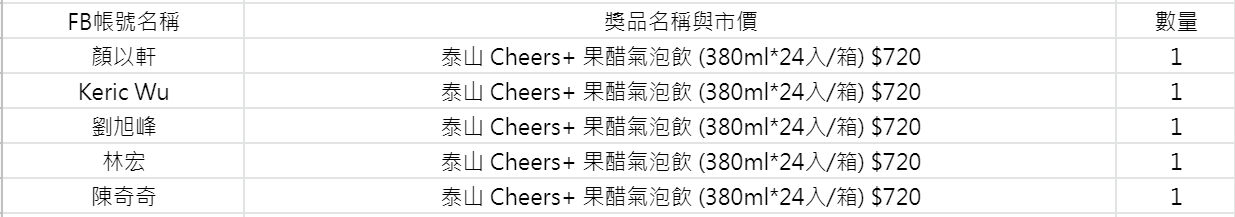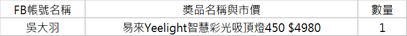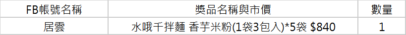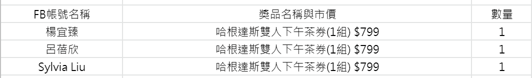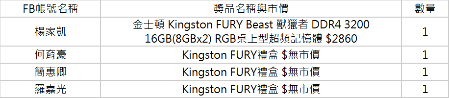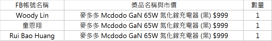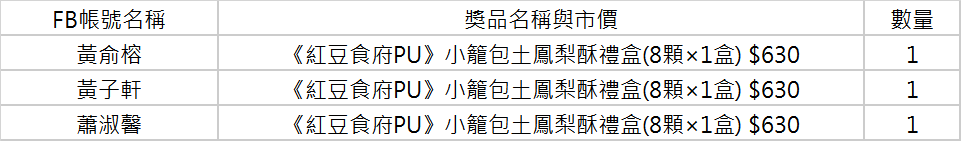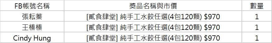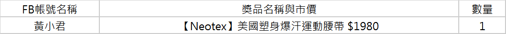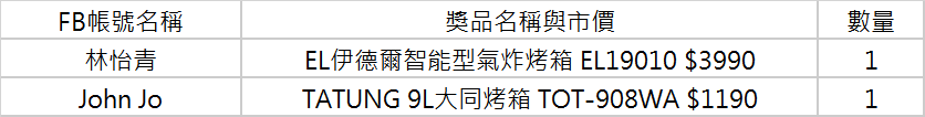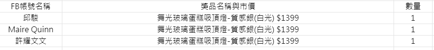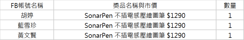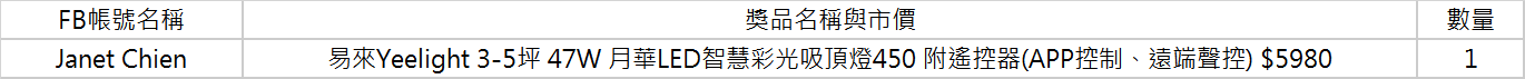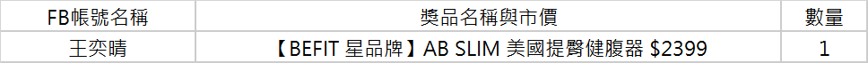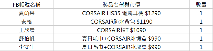 FB帳號名稱 | 獎品名稱與市價 | 數量 |