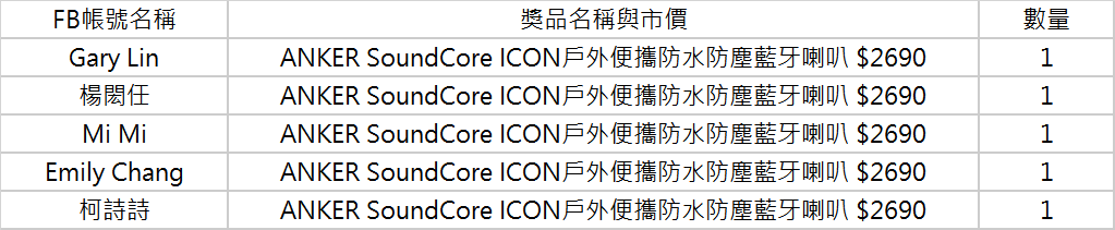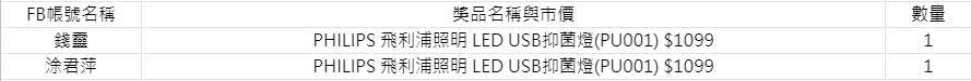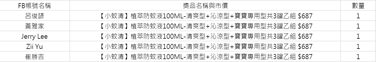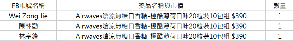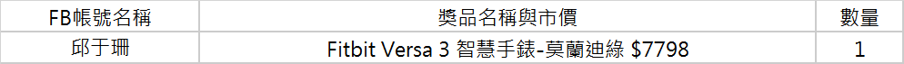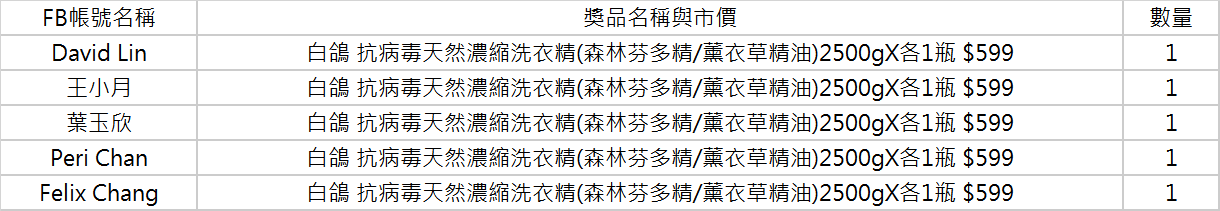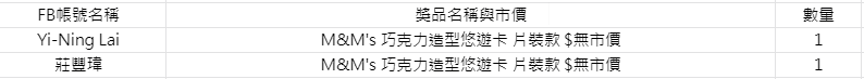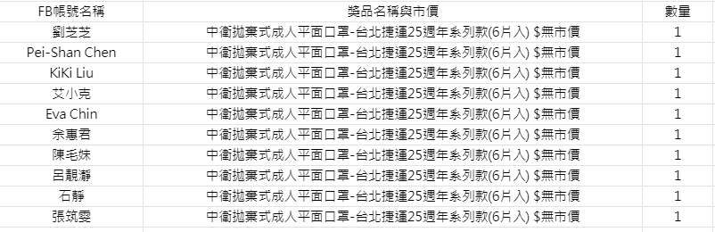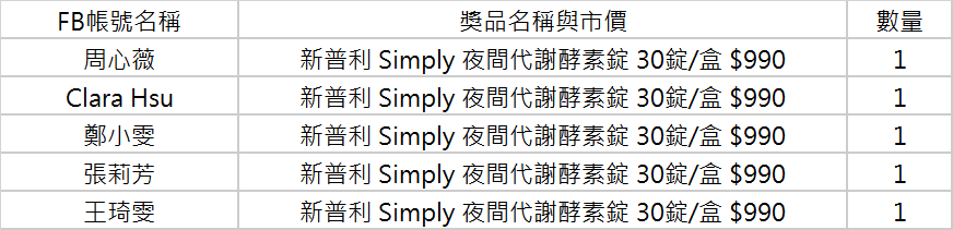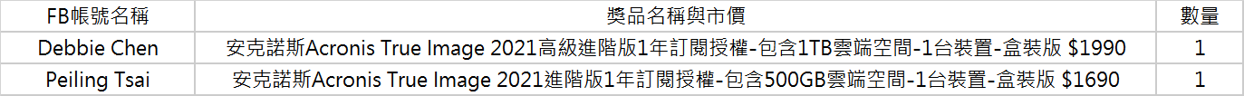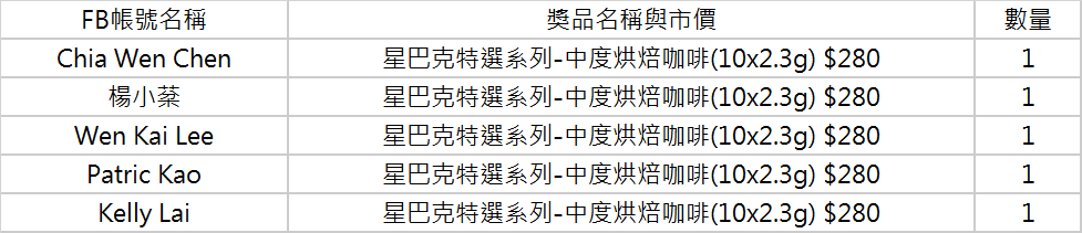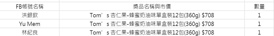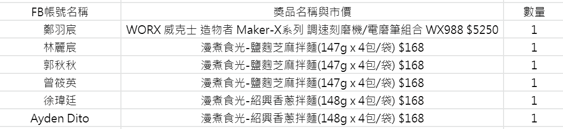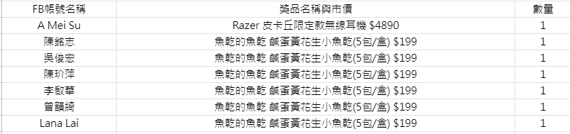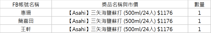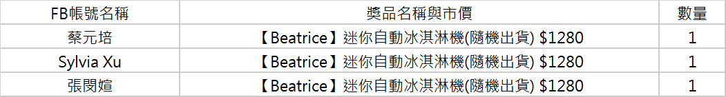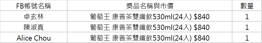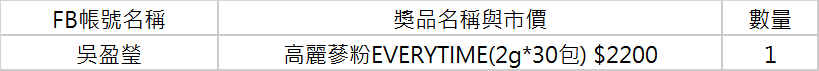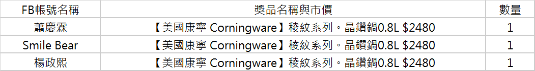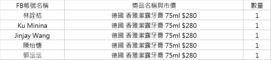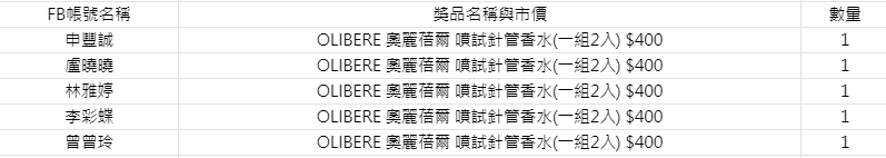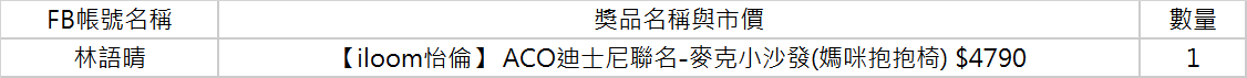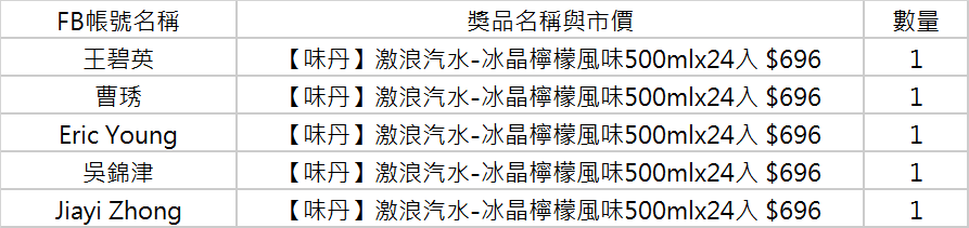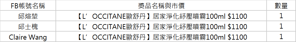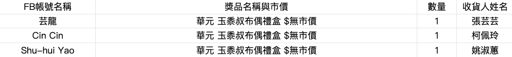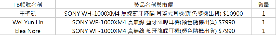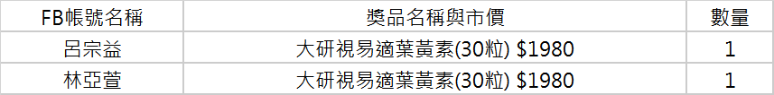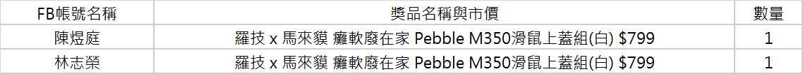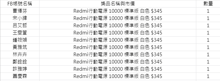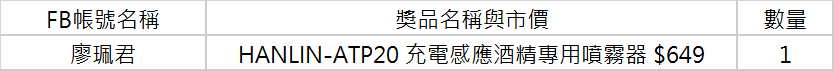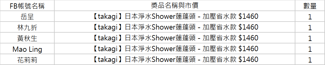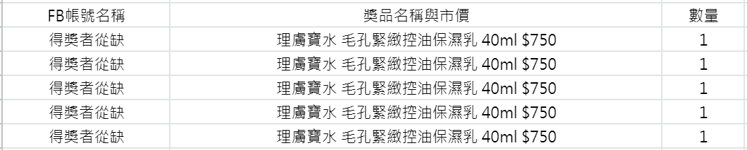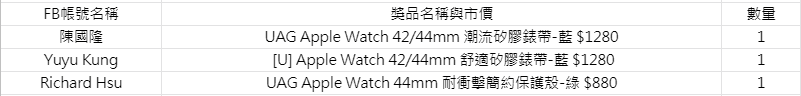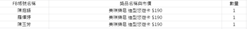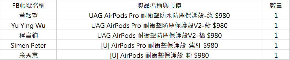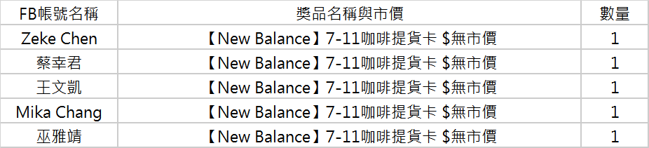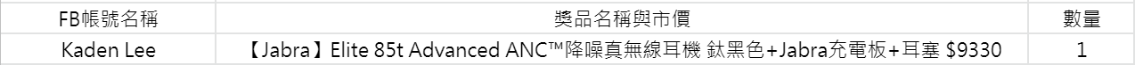 FB帳號名稱 | 獎品名稱與市價 | 數量 |