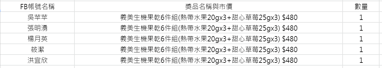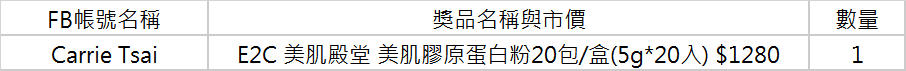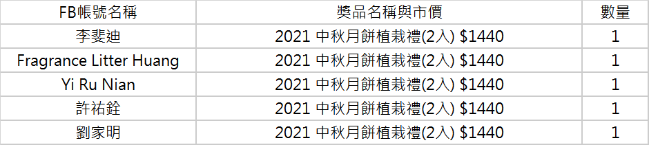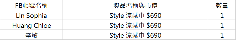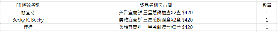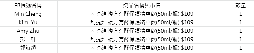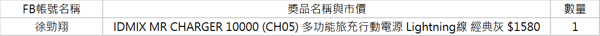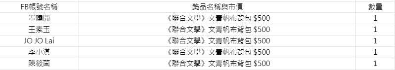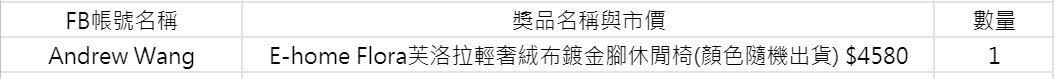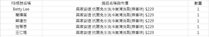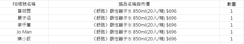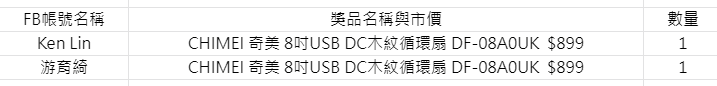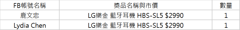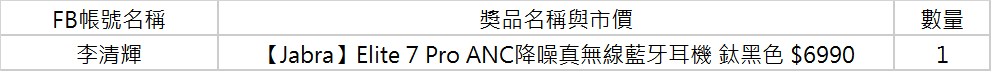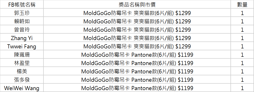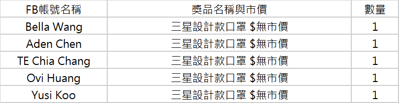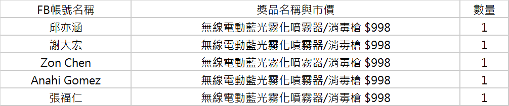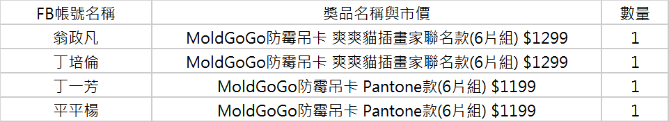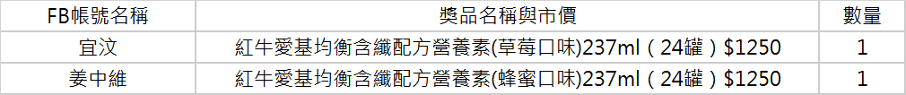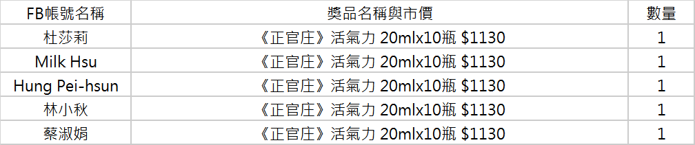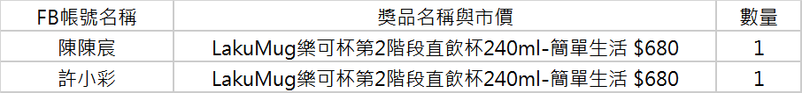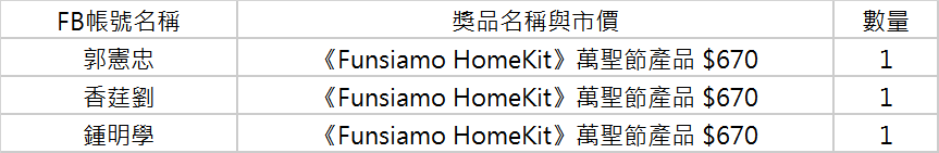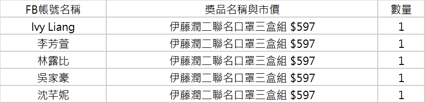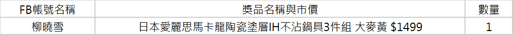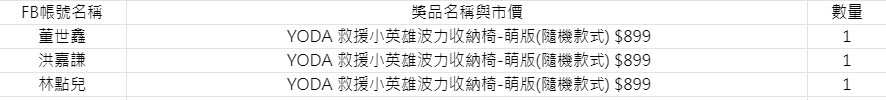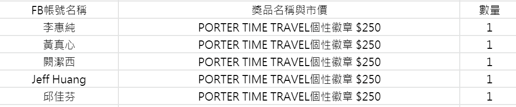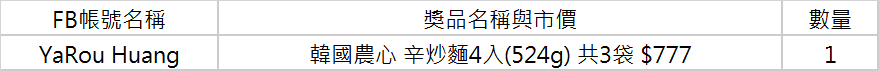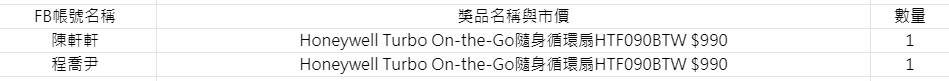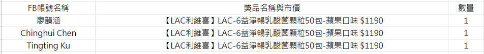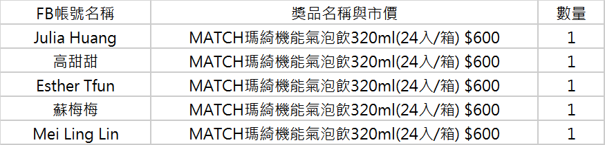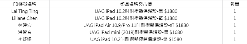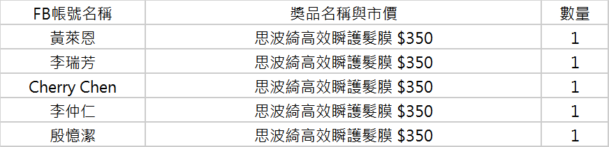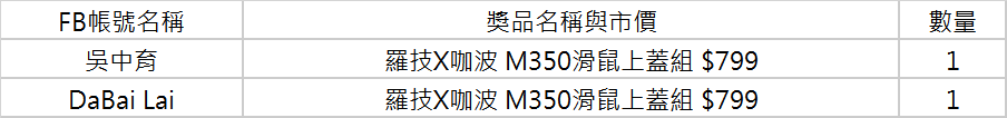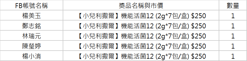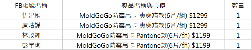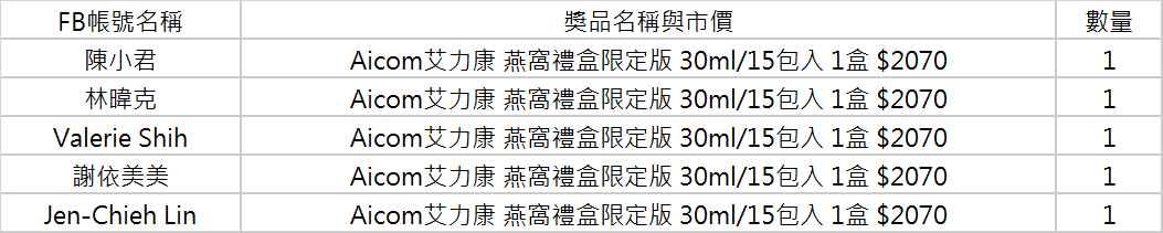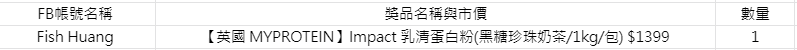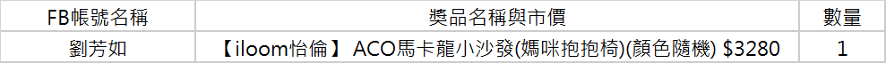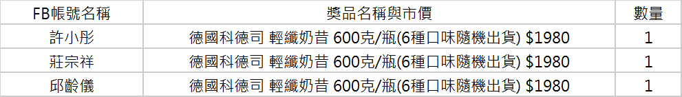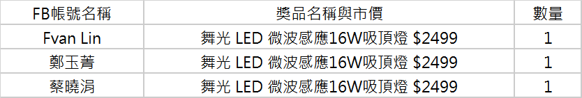 FB帳號名稱 | 獎品名稱與市價 | 數量 |