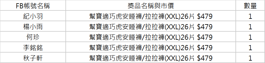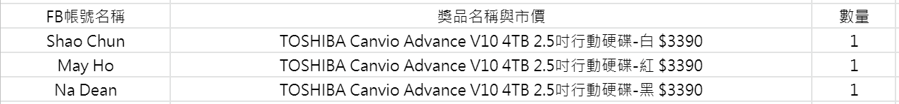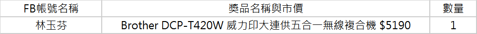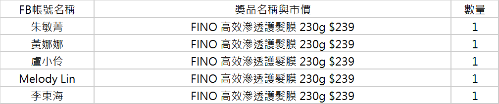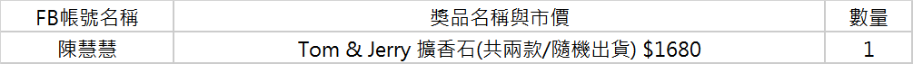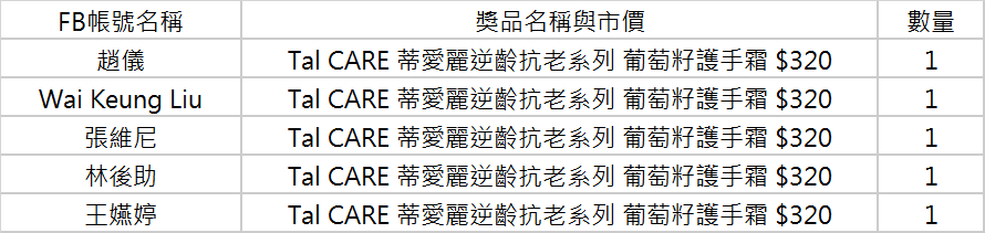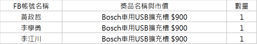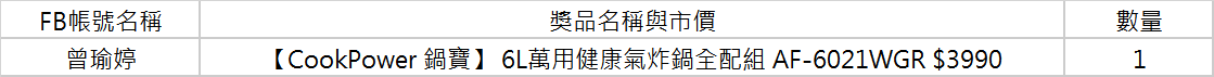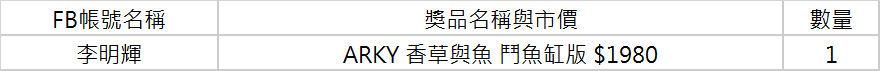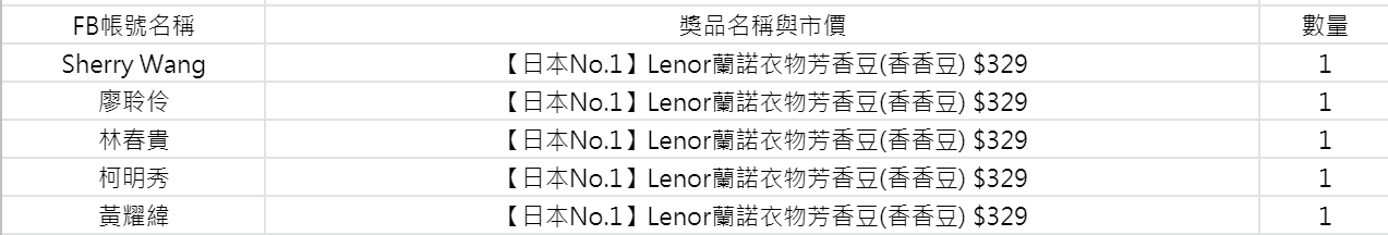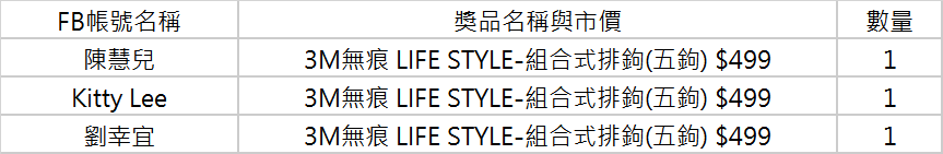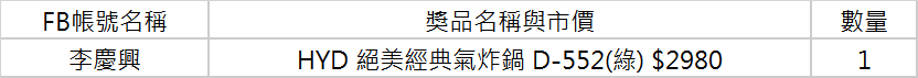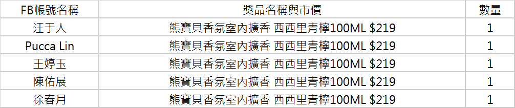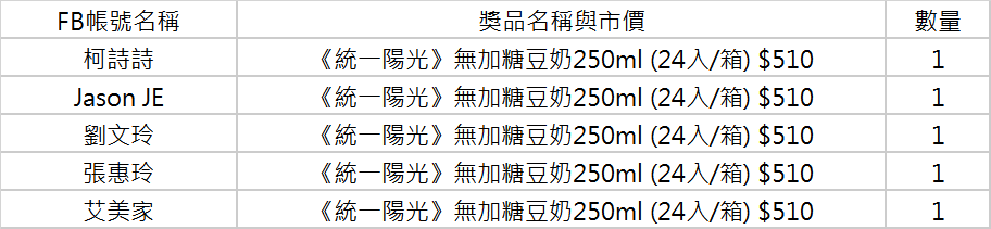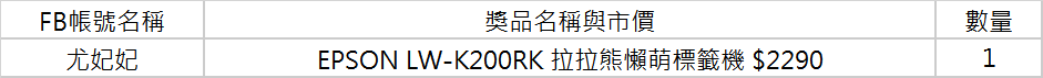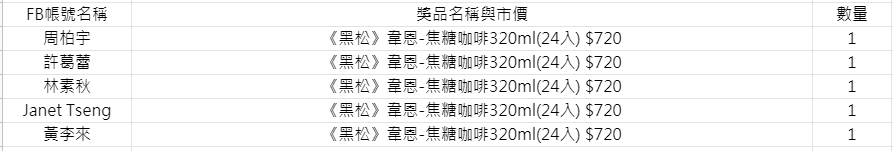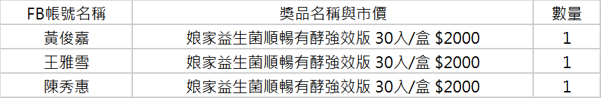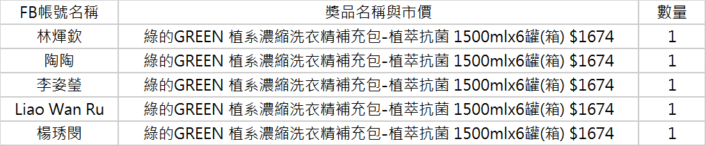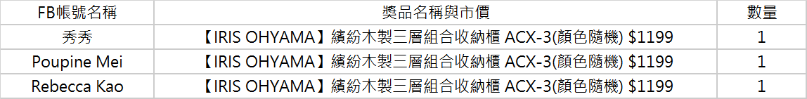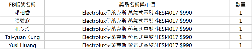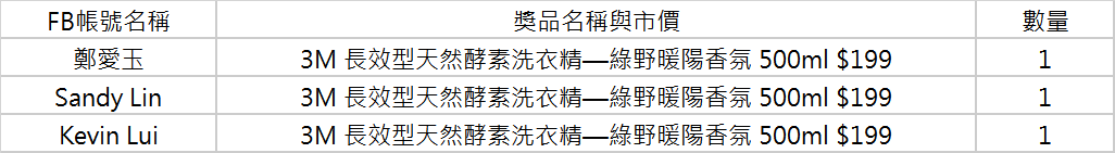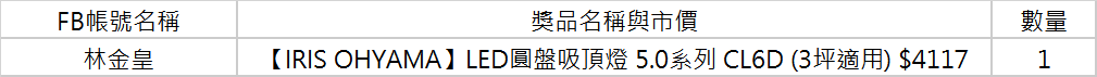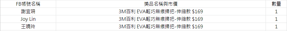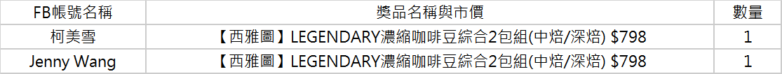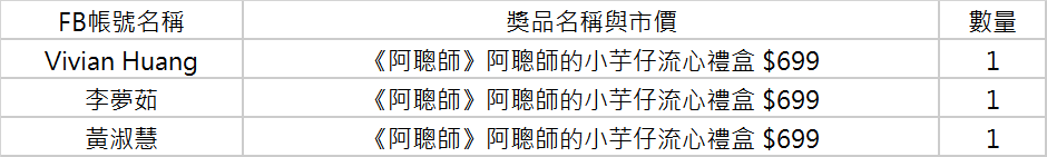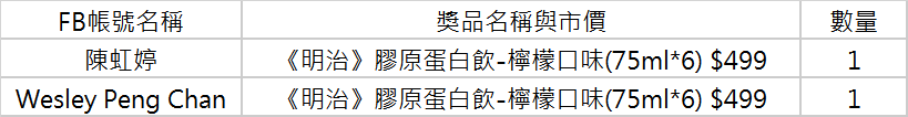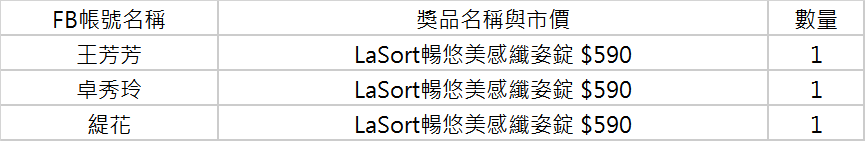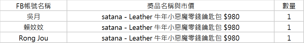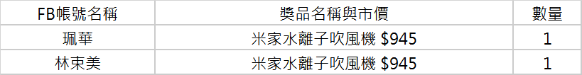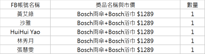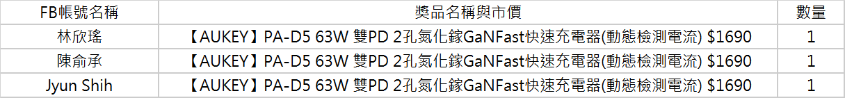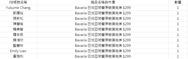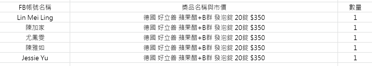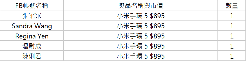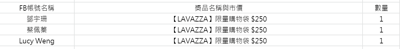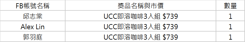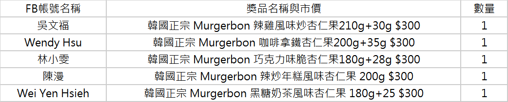 FB帳號名稱 | 獎品名稱與市價 | 數量 |