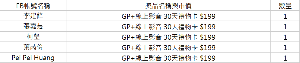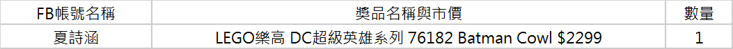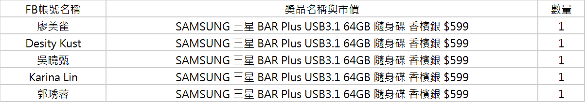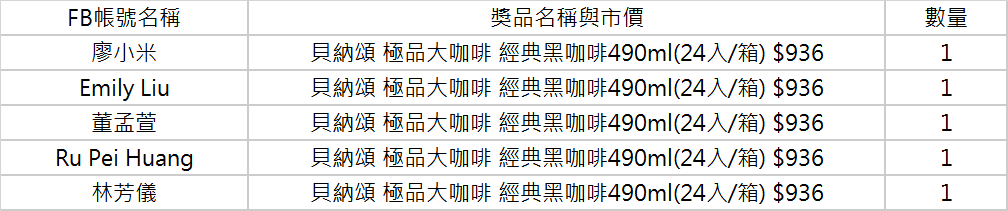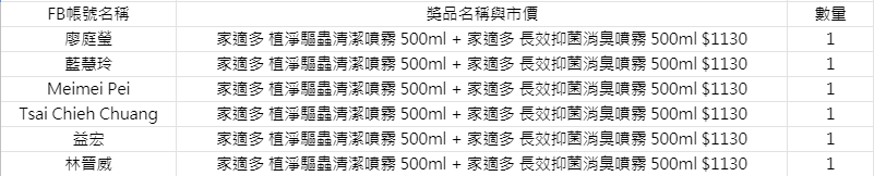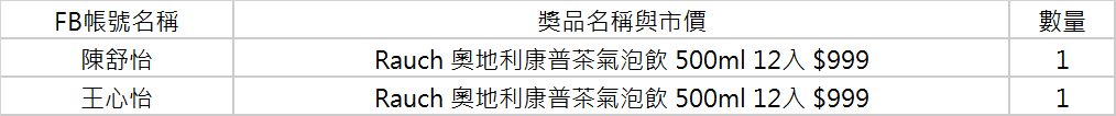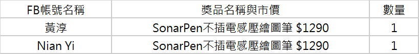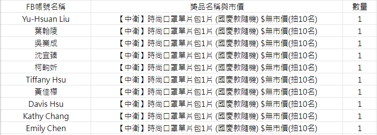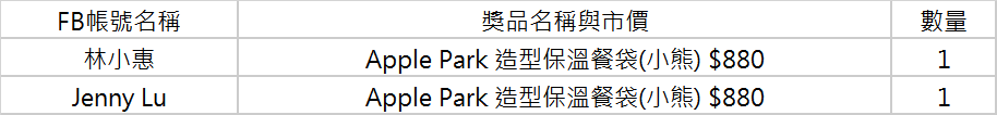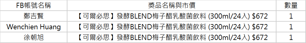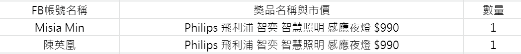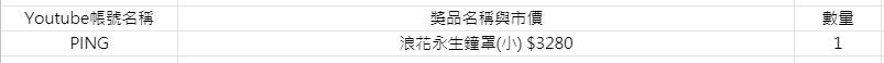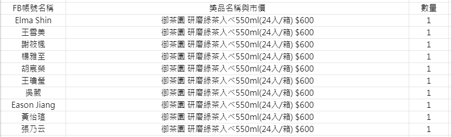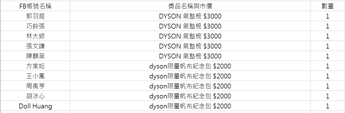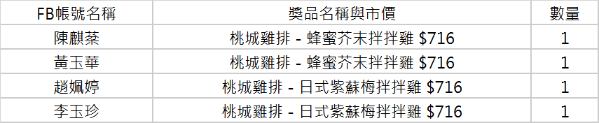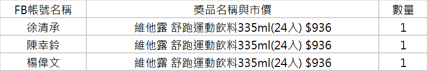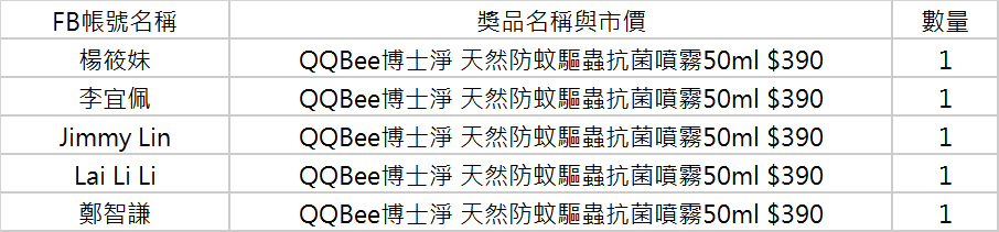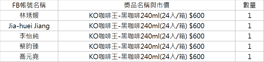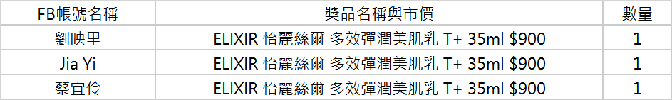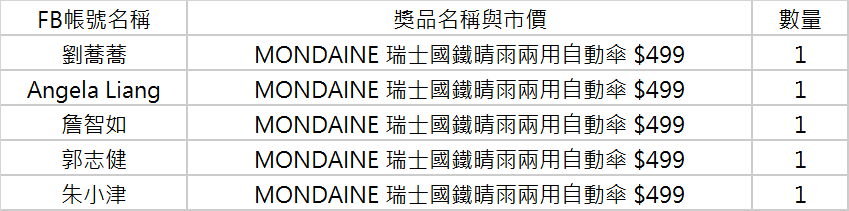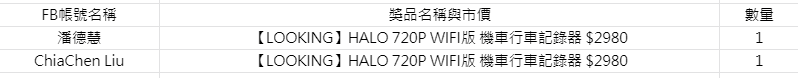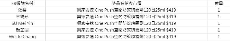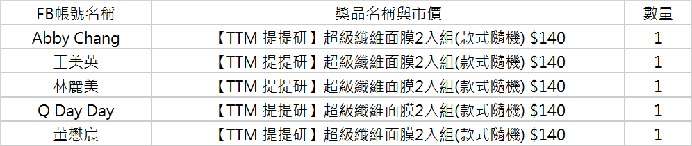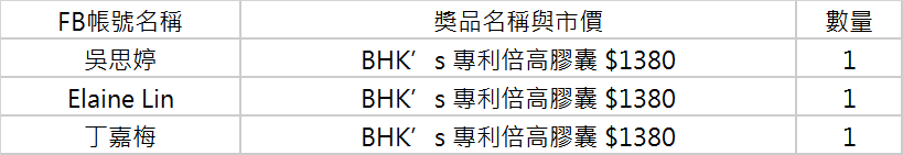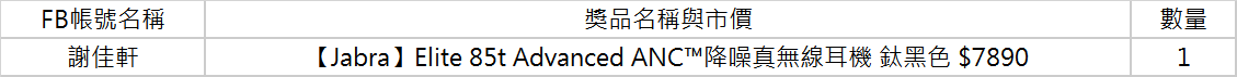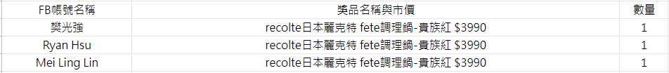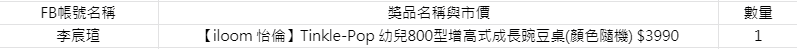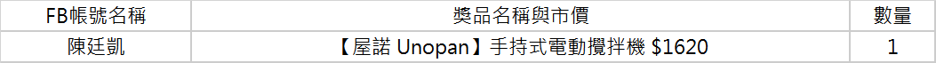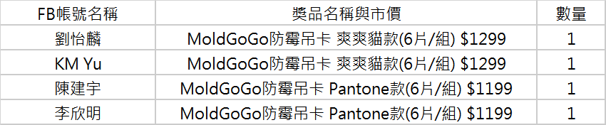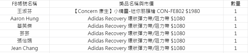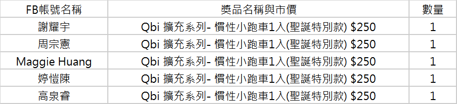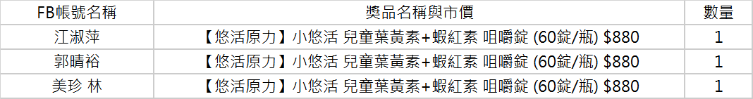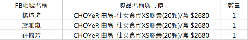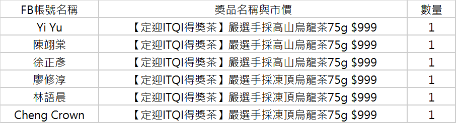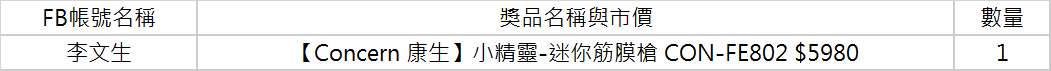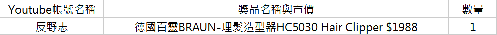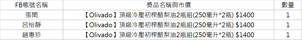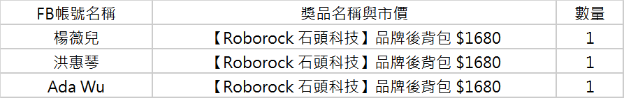 FB帳號名稱 | 獎品名稱與市價 | 數量 |