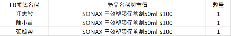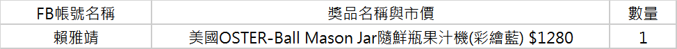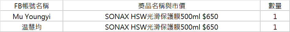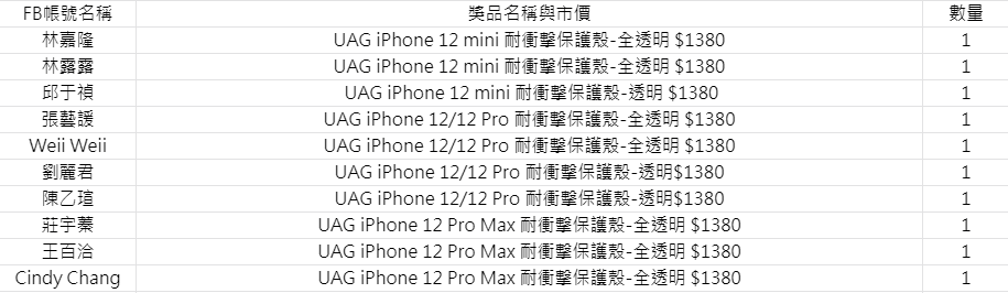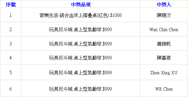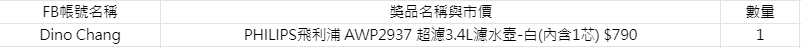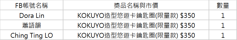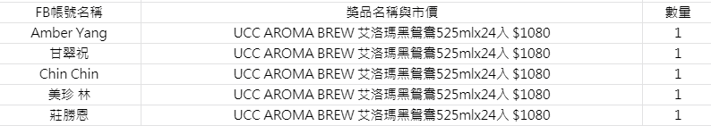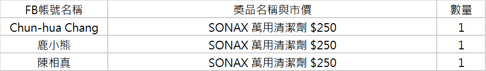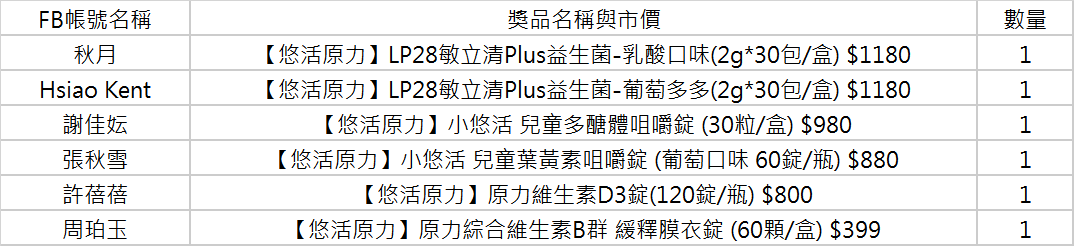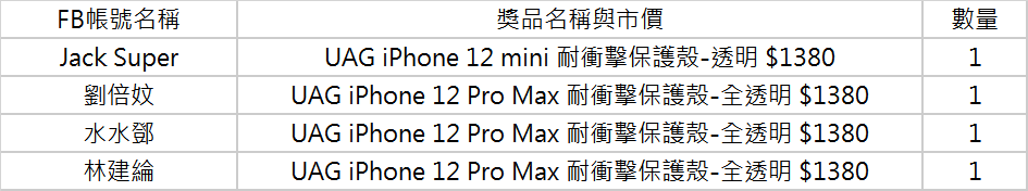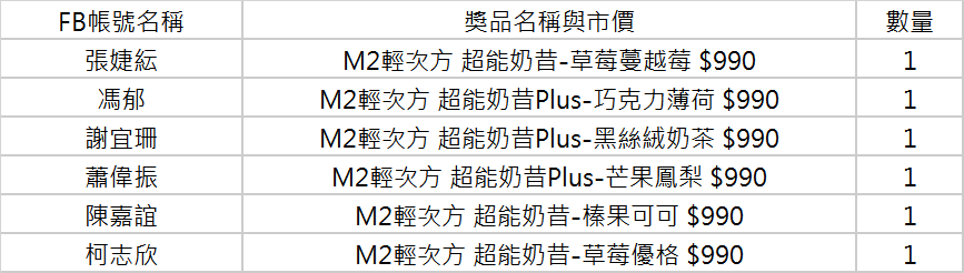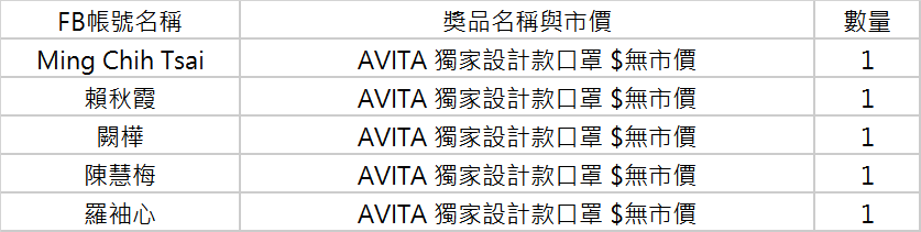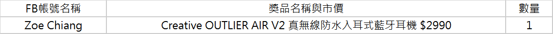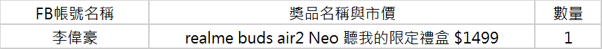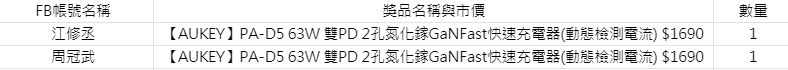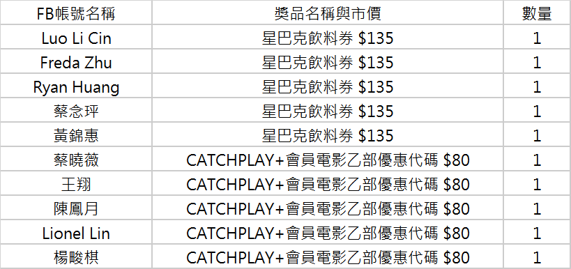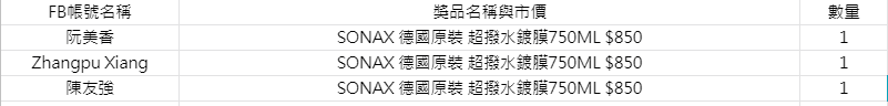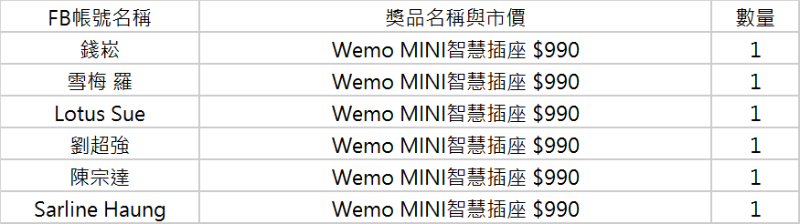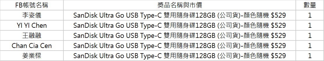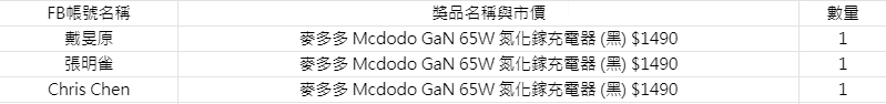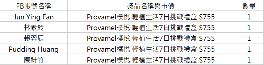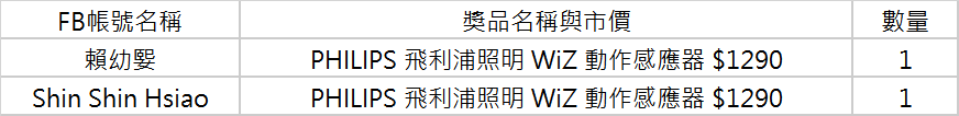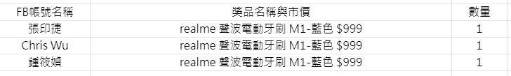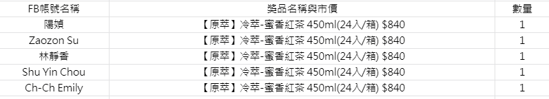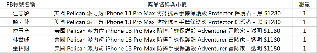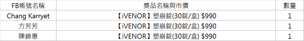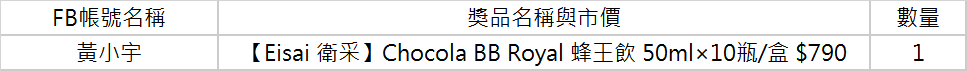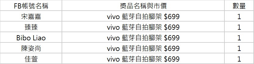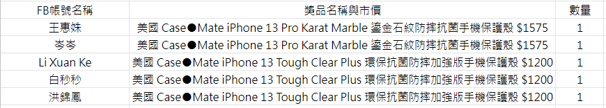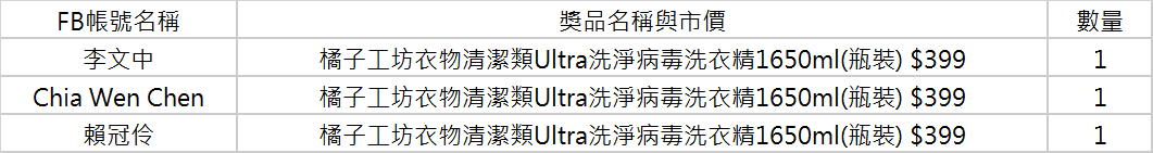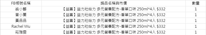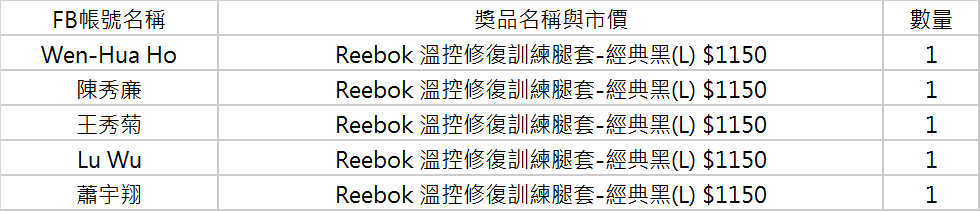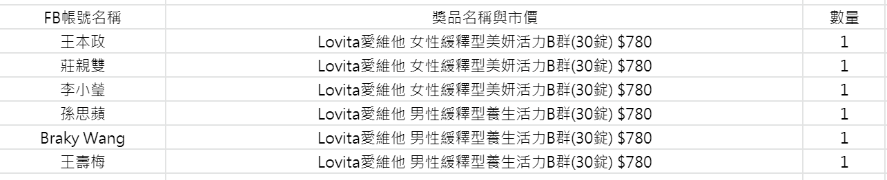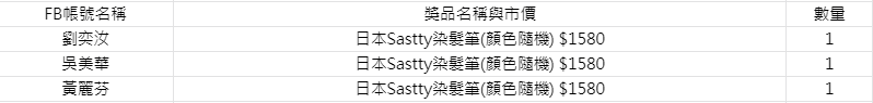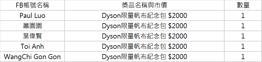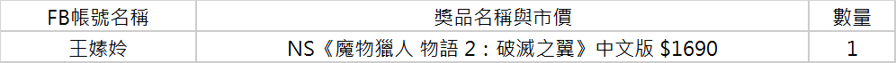 FB帳號名稱 | 獎品名稱與市價 | 數量 |