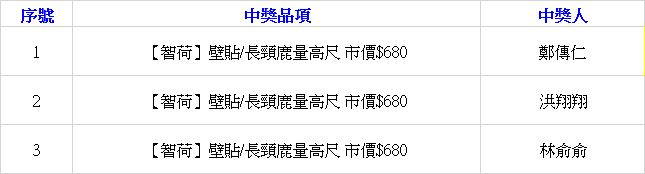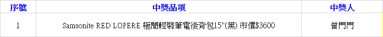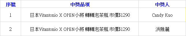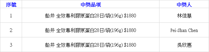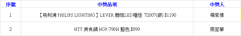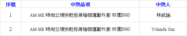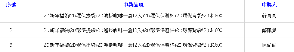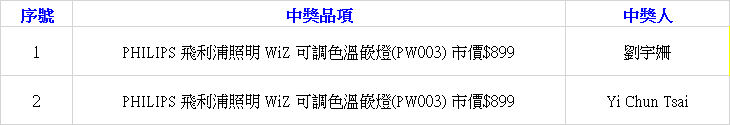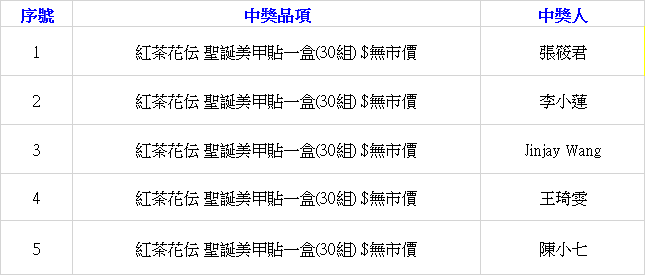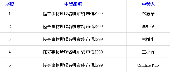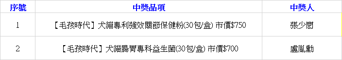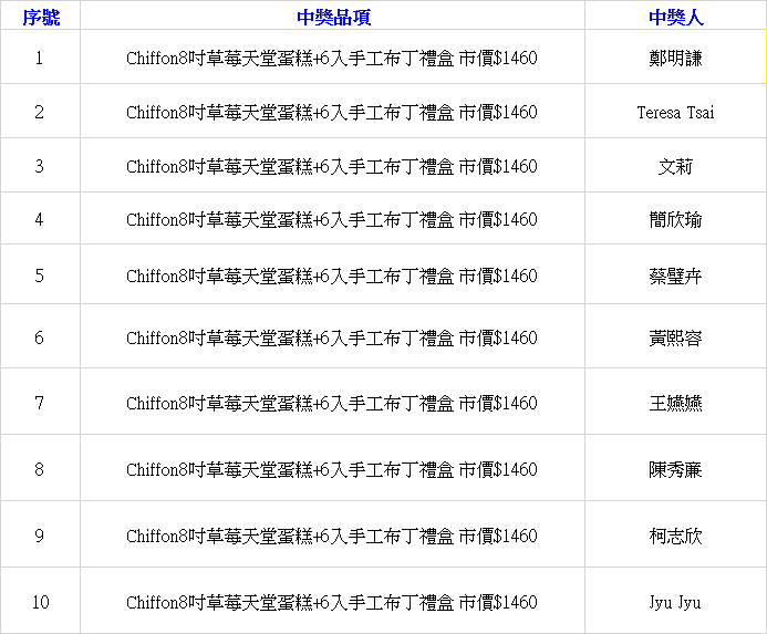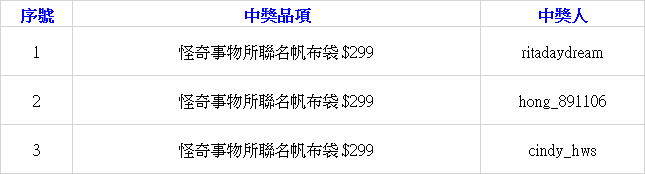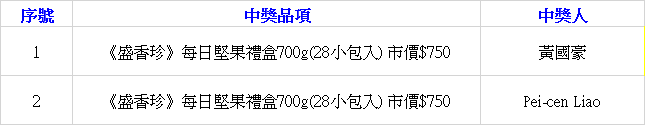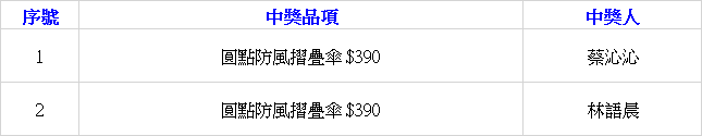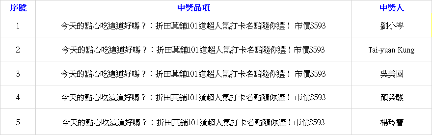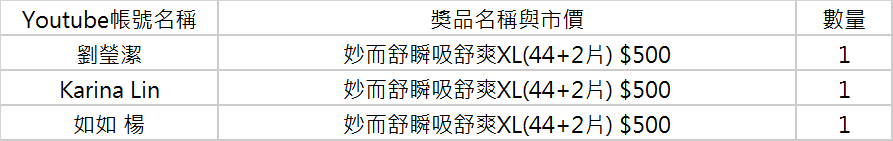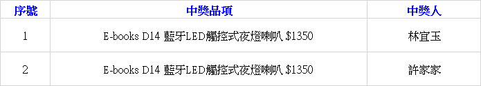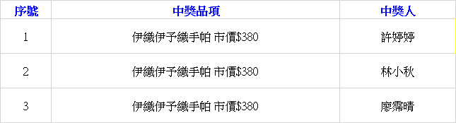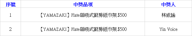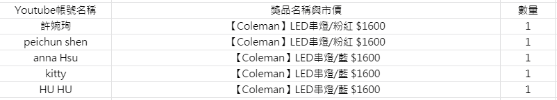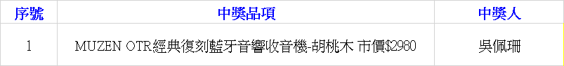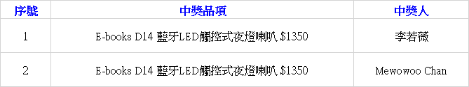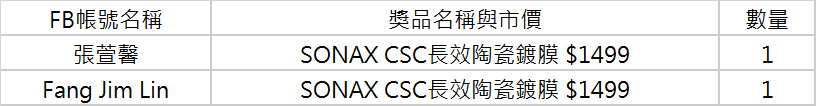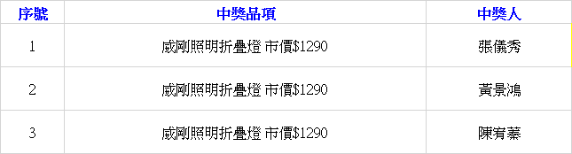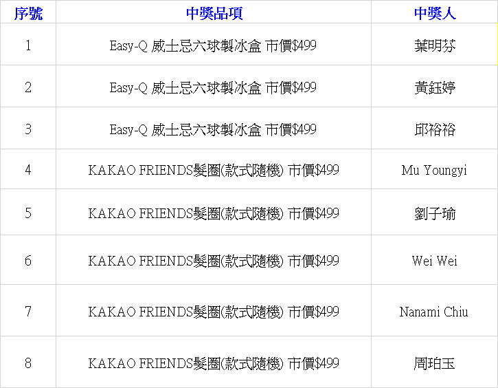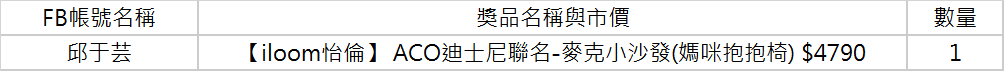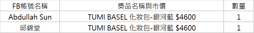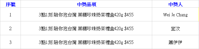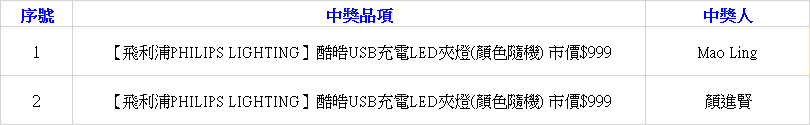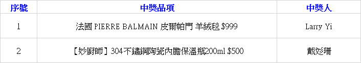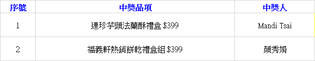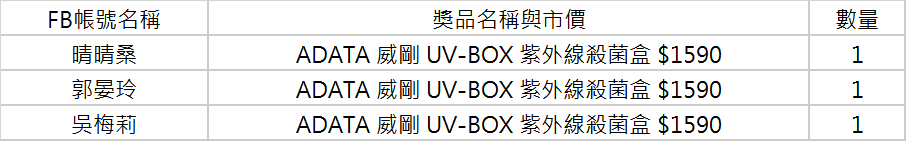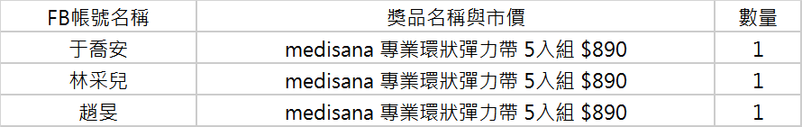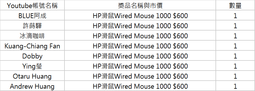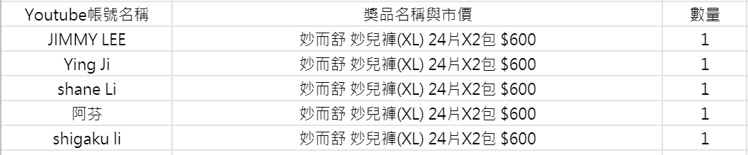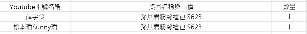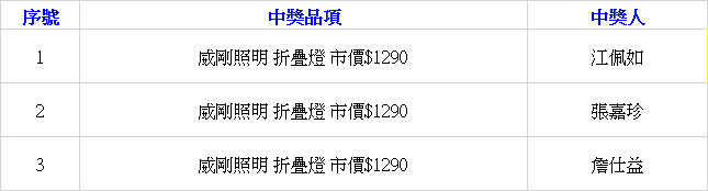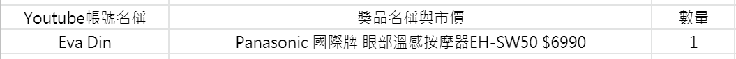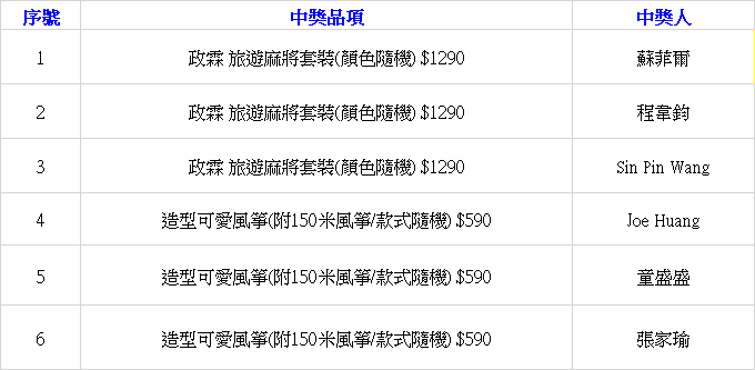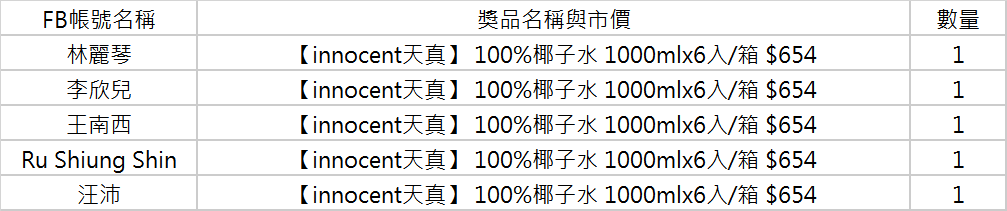 FB帳號名稱 | 獎品名稱與市價 | 數量 |