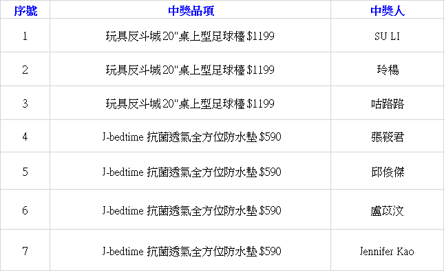 【11/02~11/09 #按讚留言抽 1. 玩具反斗城 20"桌上型足球檯 市價$1199(抽3名)/2. J-bedtime 抗菌透氣全方位防水墊 市價$590(抽4名)】
