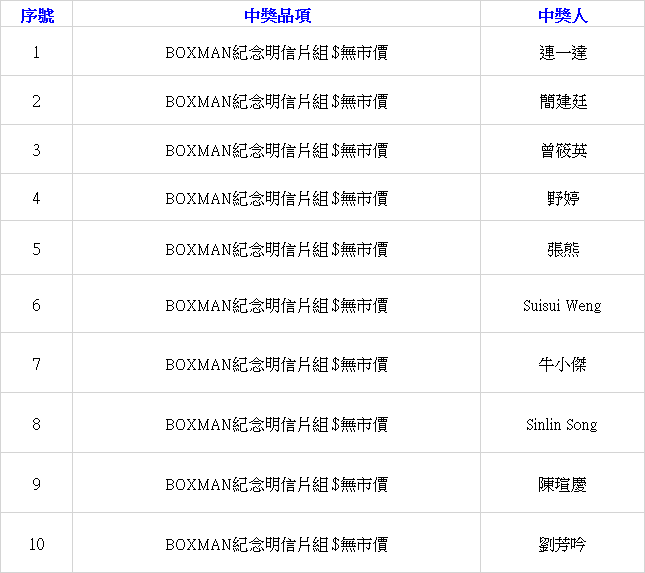 【11/03~11/09 #按讚留言抽 BOXMAN紀念明信片組 $無市價】(抽10名)
